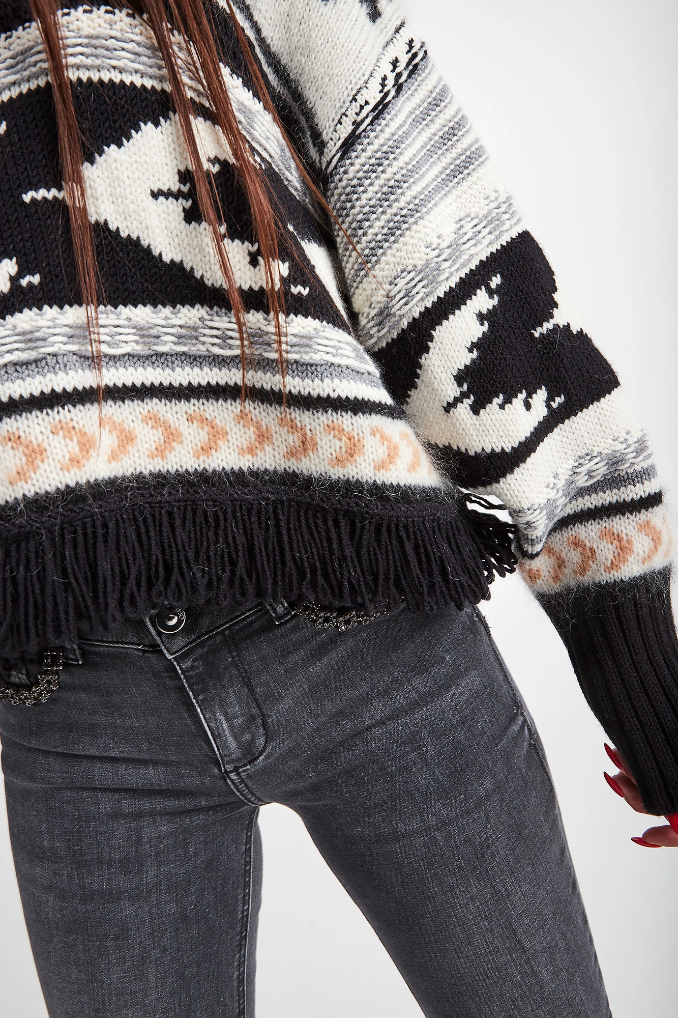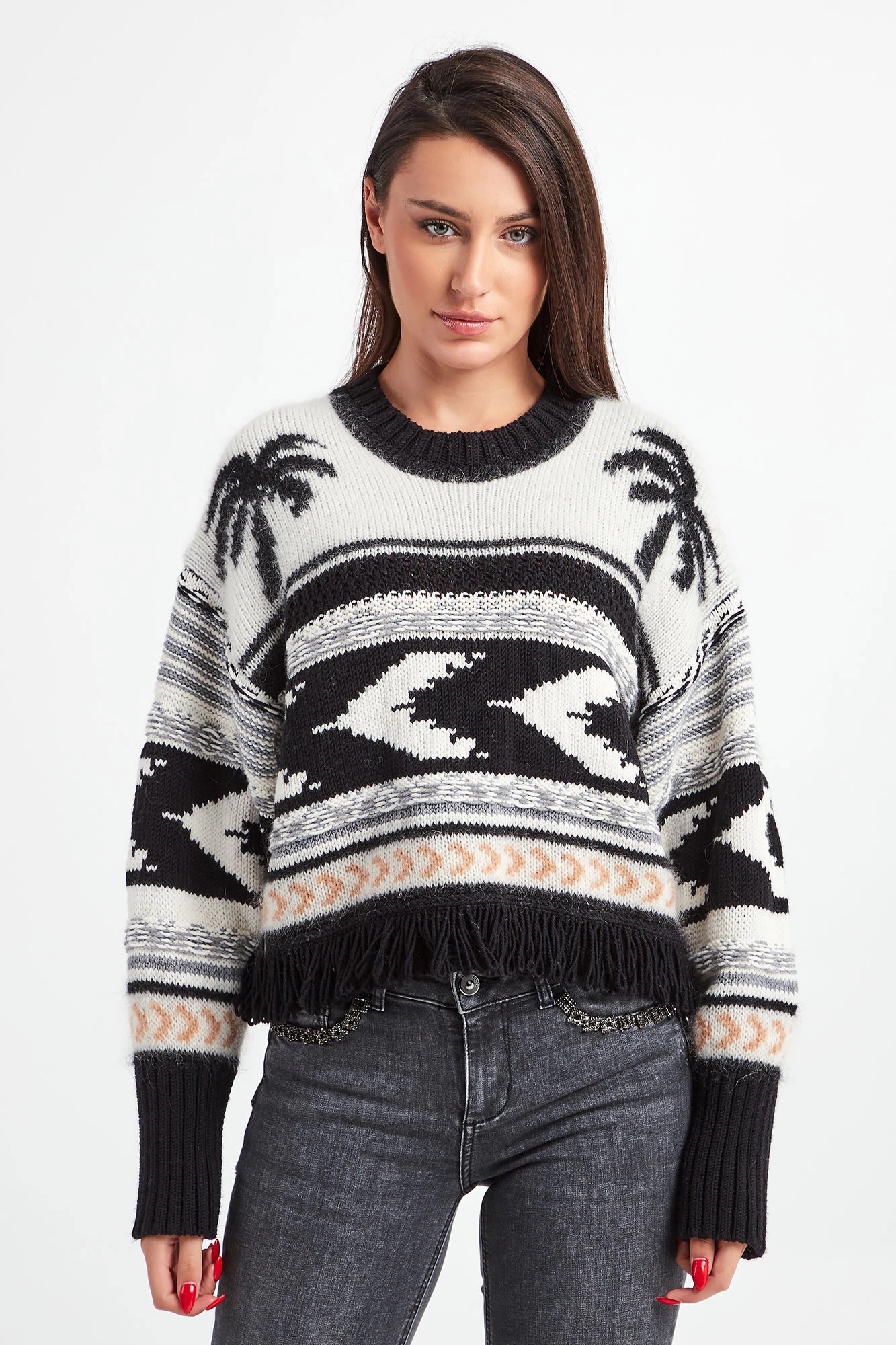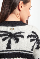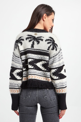 Sweter marki Twinset. Nowoczesny, krótszy krój. Na całości czarno-białe wzory w stylu etno. Dekolt typu o-neck oraz długie rękawy zakończone ściągaczami. Dół wykończony czarnymi frędzlami. Z tyłu, na linii karku złota, sygnowana zawieszka w kształcie logo. Sweter wykonany z mieszanki tkanin z dodatkiem wełny oraz moheru.