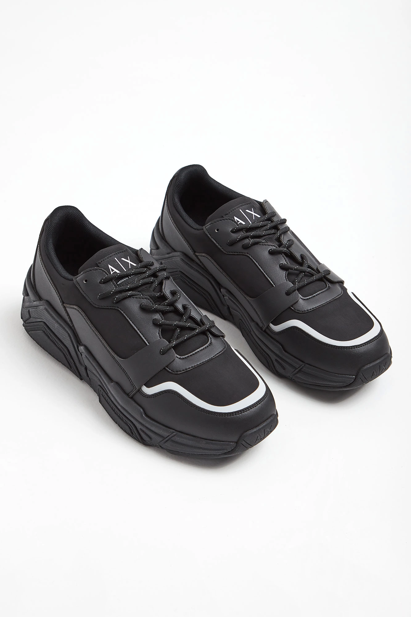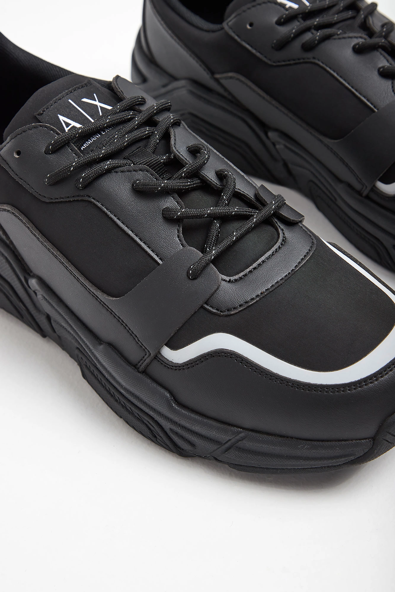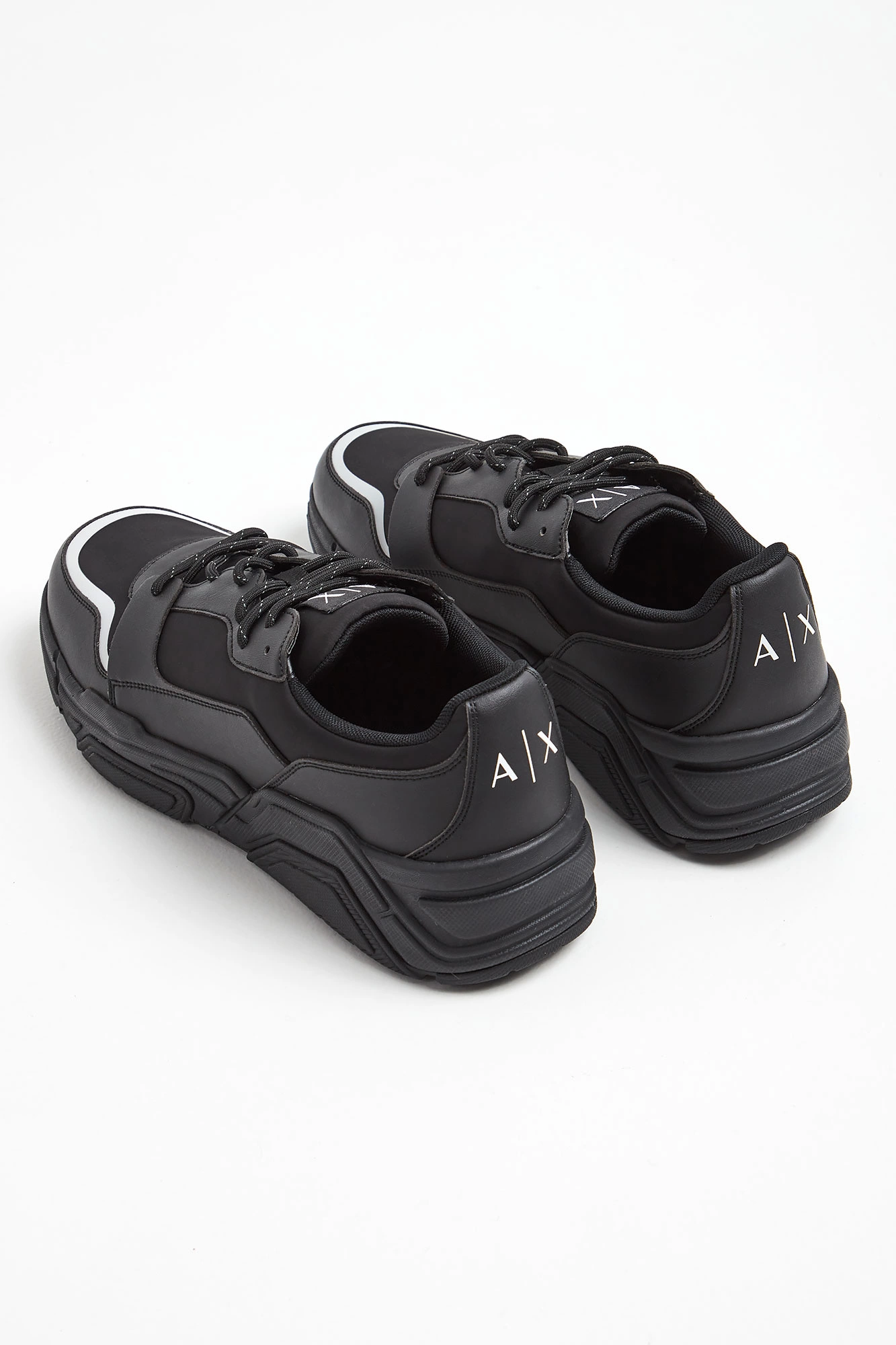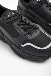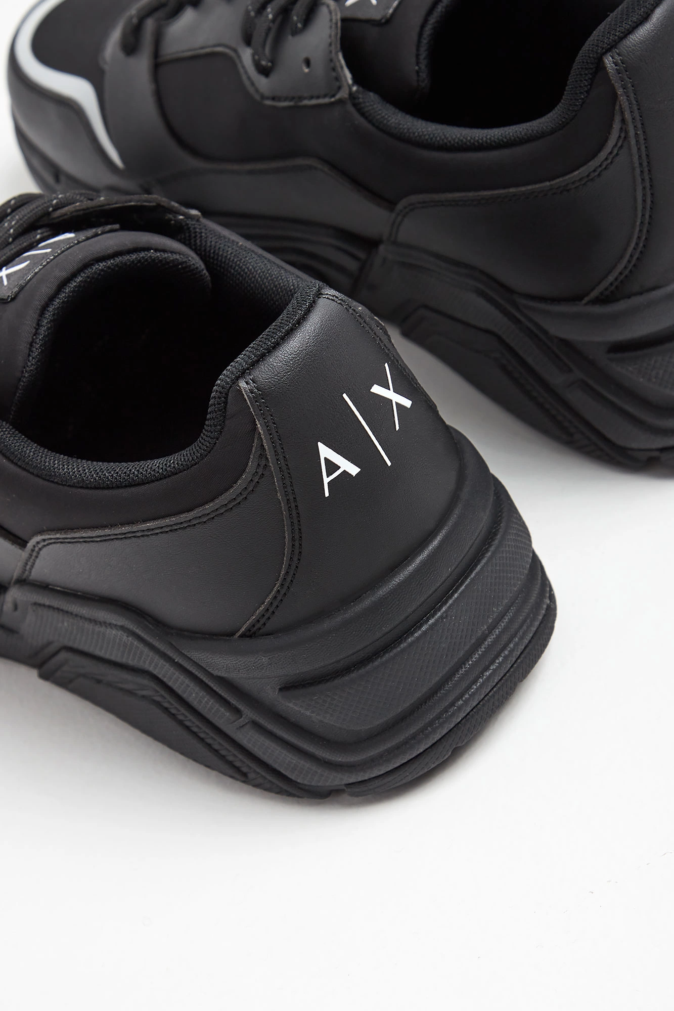 Sneakersy marki Armani Exchange w czarnym kolorze. Wiązane za pomocą sznurówek. Na całości wstawki wykonane ze skóry ekologicznej. Na językach naszywki z logo marki. Na noskach odblaskowe wstawki. Wysoka, czarna, tłoczona podeszwa.