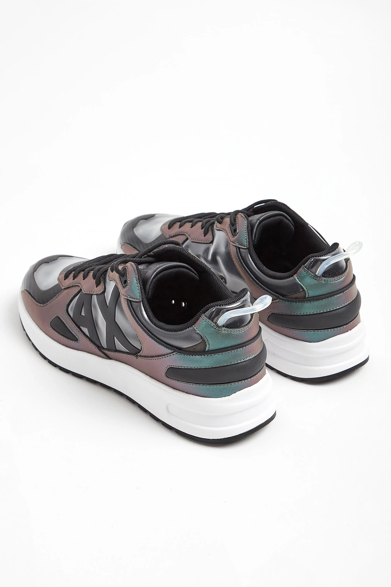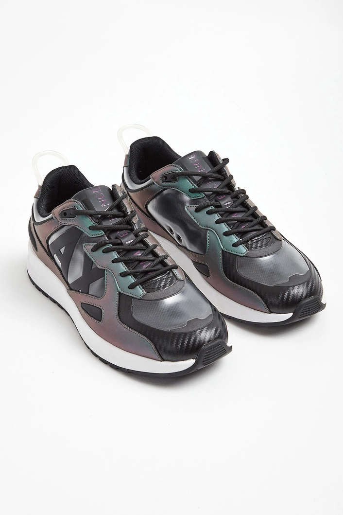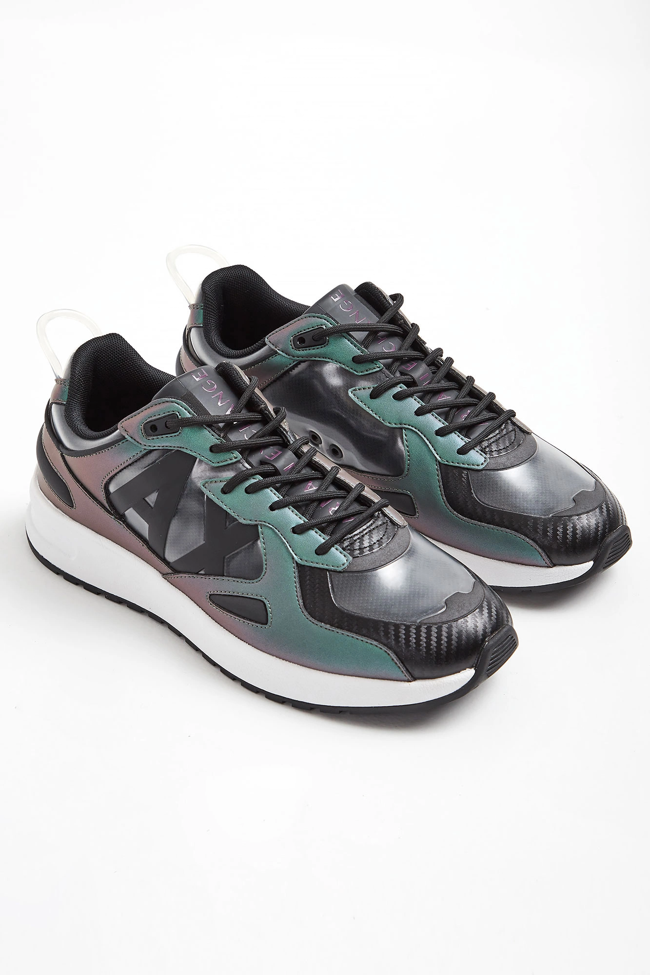 Sneakersy marki Armani Exchange z efektem holograficznego kameleona, mieniącym się w odcieniach brązu i zieleni. Wiązane za pomocą sznurówek. Po bokach czarne monogramy marki. Z przodu i z boków przezroczyste elementy. Na językach nadruk z nazwą marki. Całości dopełnia wysoka, biała podeszwa.
