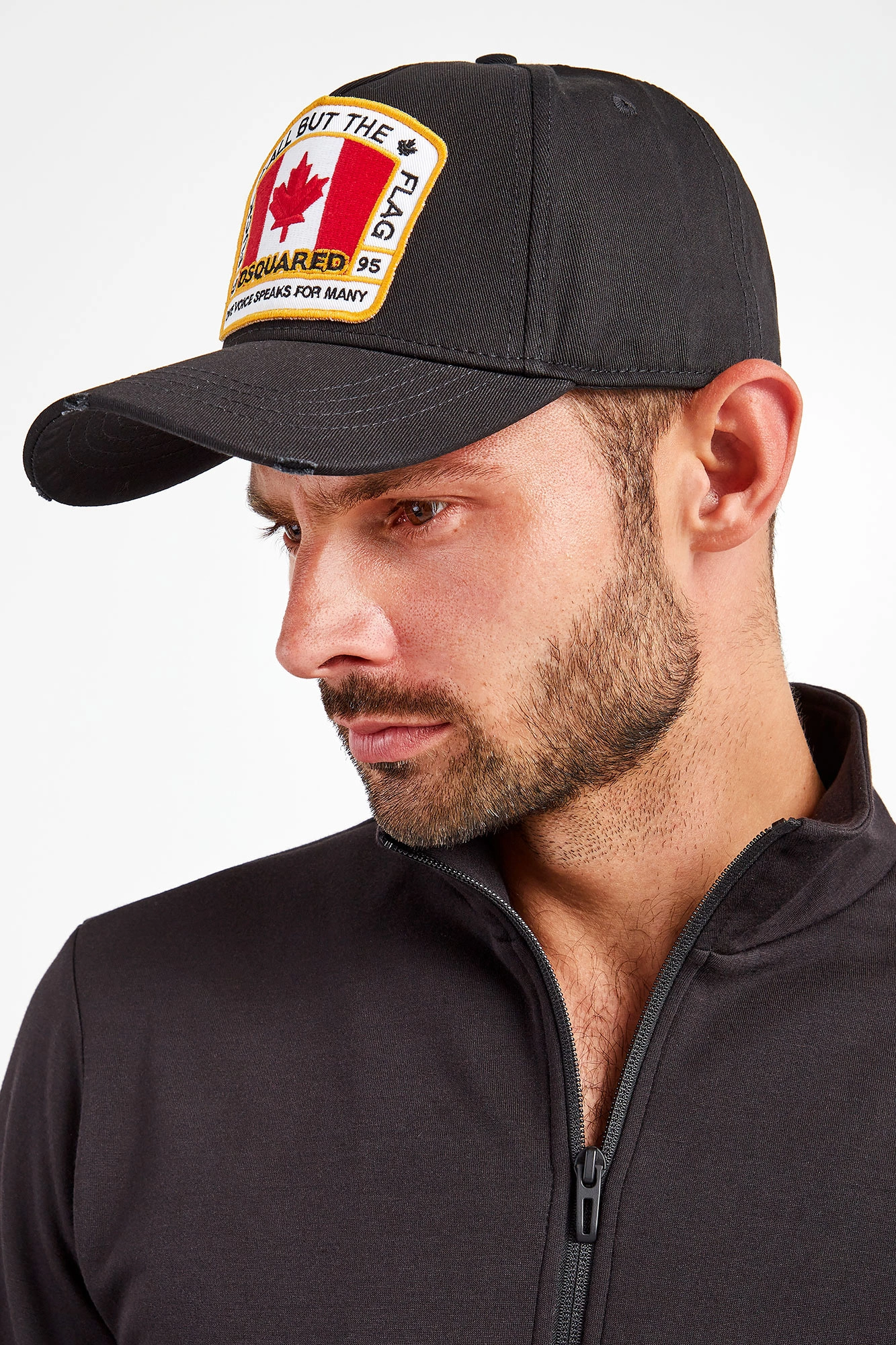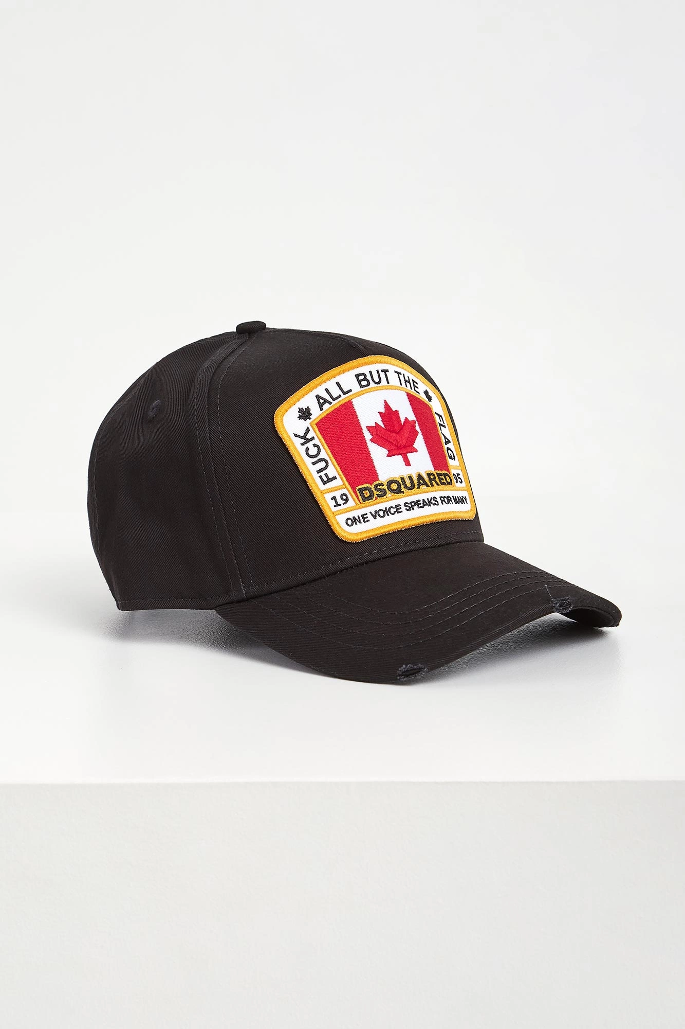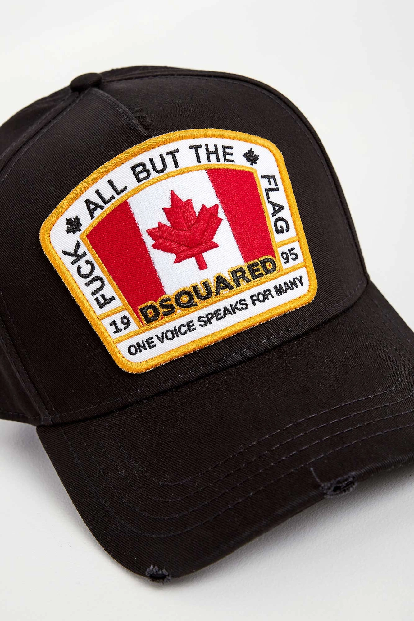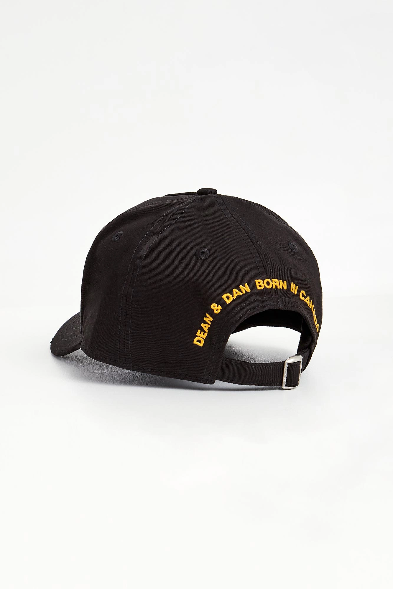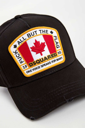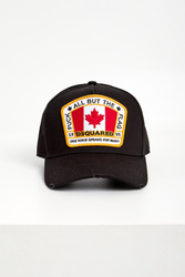 Czapka marki Dsquared2 w czarnym kolorze. Z dużą kolorową naszywką. Z tyłu, nad regulacją, wyszyty żółty napis z imionami właścicieli marki. Na daszku ozdobne przeszycia i przetarcia. Wykonana z czystej bawełny. Wygodna i przewiewna.