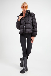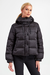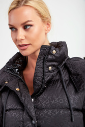 Puchowa kurtka marki Weekend Max Mara w czarnym kolorze. Fason typu regular. Ze stójka regulowaną za pomocą troczków. Zapinana na zamek błyskawiczny i sygnowane napy. Z kapturem regulowany za pomocą elastycznych troczków. Na całości wzór w postaci nazwy marki. Model z dwoma zapinanymi kieszeniami. Długie rękawy wykończone elastycznym ściągaczem. Na linii karku gumowa aplikacja z logo marki. Naturalne wypełnienie.