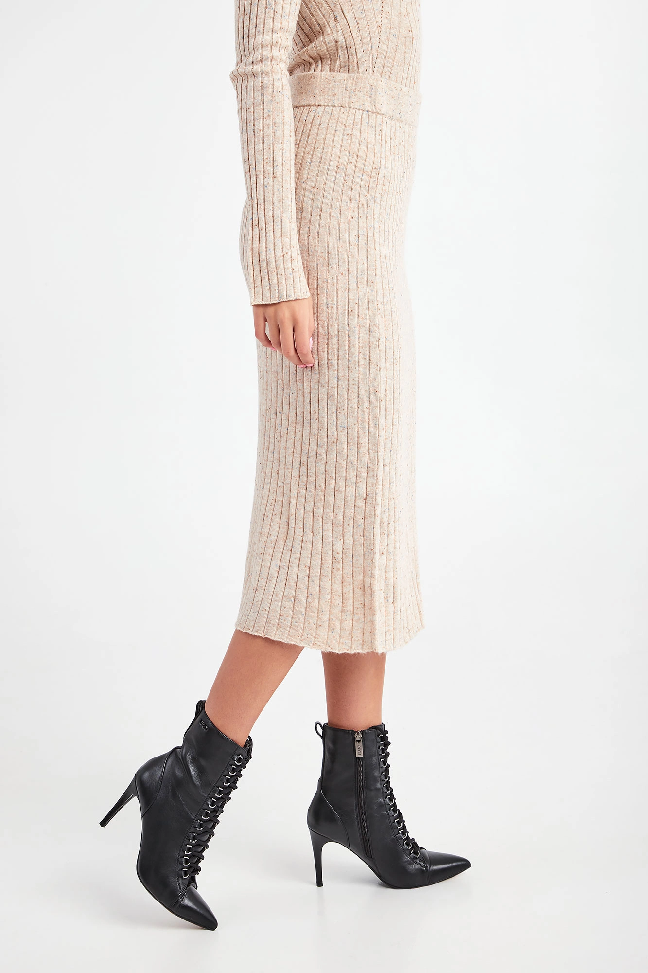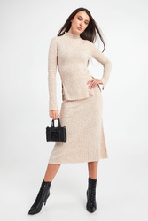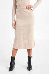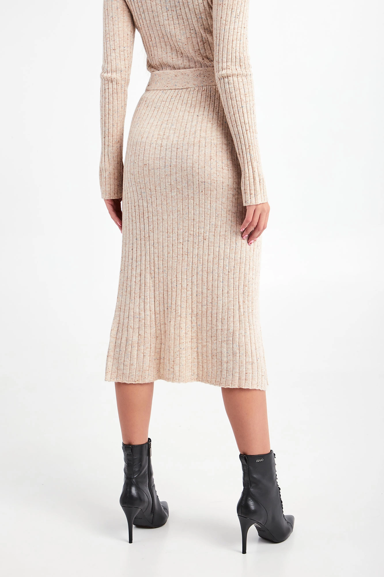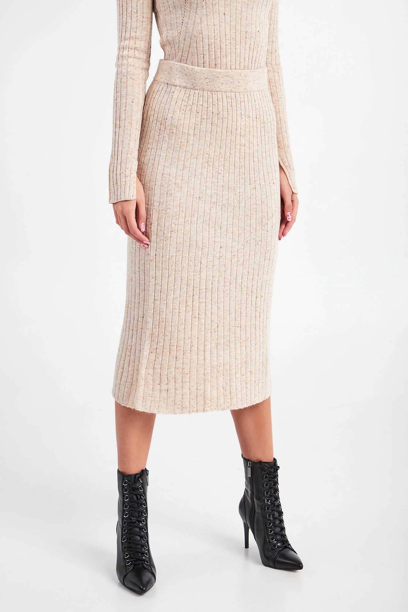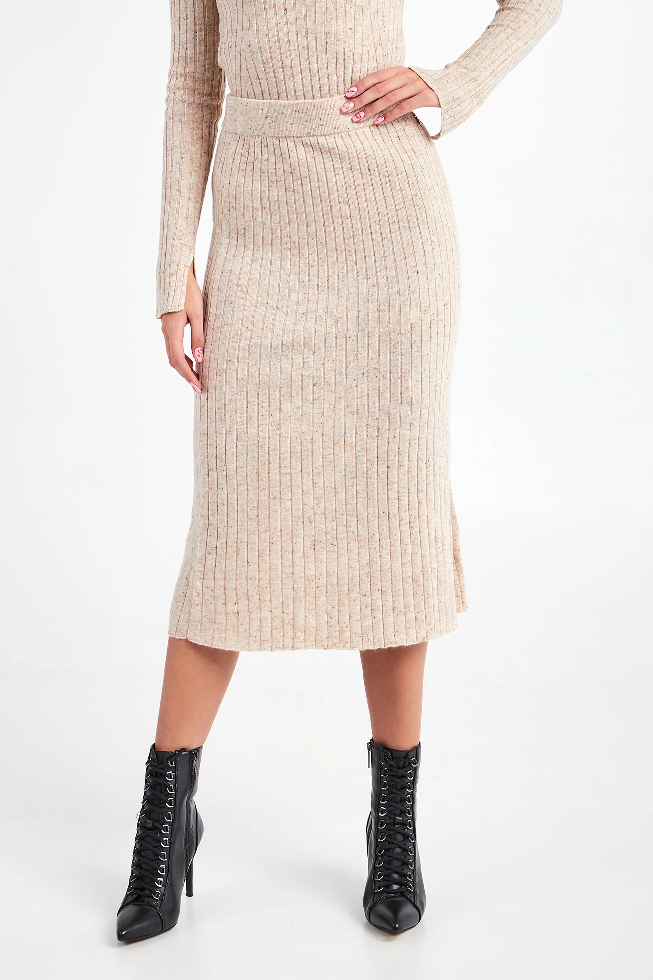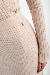 Prążkowana spódnica marki Patrizia Pepe w beżowym kolorze. Fason typu slim fit o długości midi. W talii ściągacz. Na całości kolorowe nitki. Z boku niewielka, metalowa aplikacja z logo marki w srebrnym kolorze. Wykonana z mieszanki materiałów z domieszką wełny.