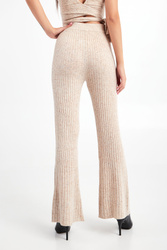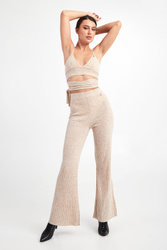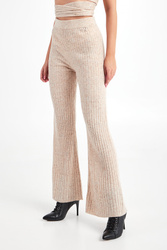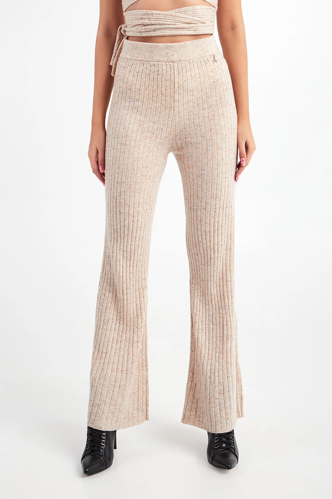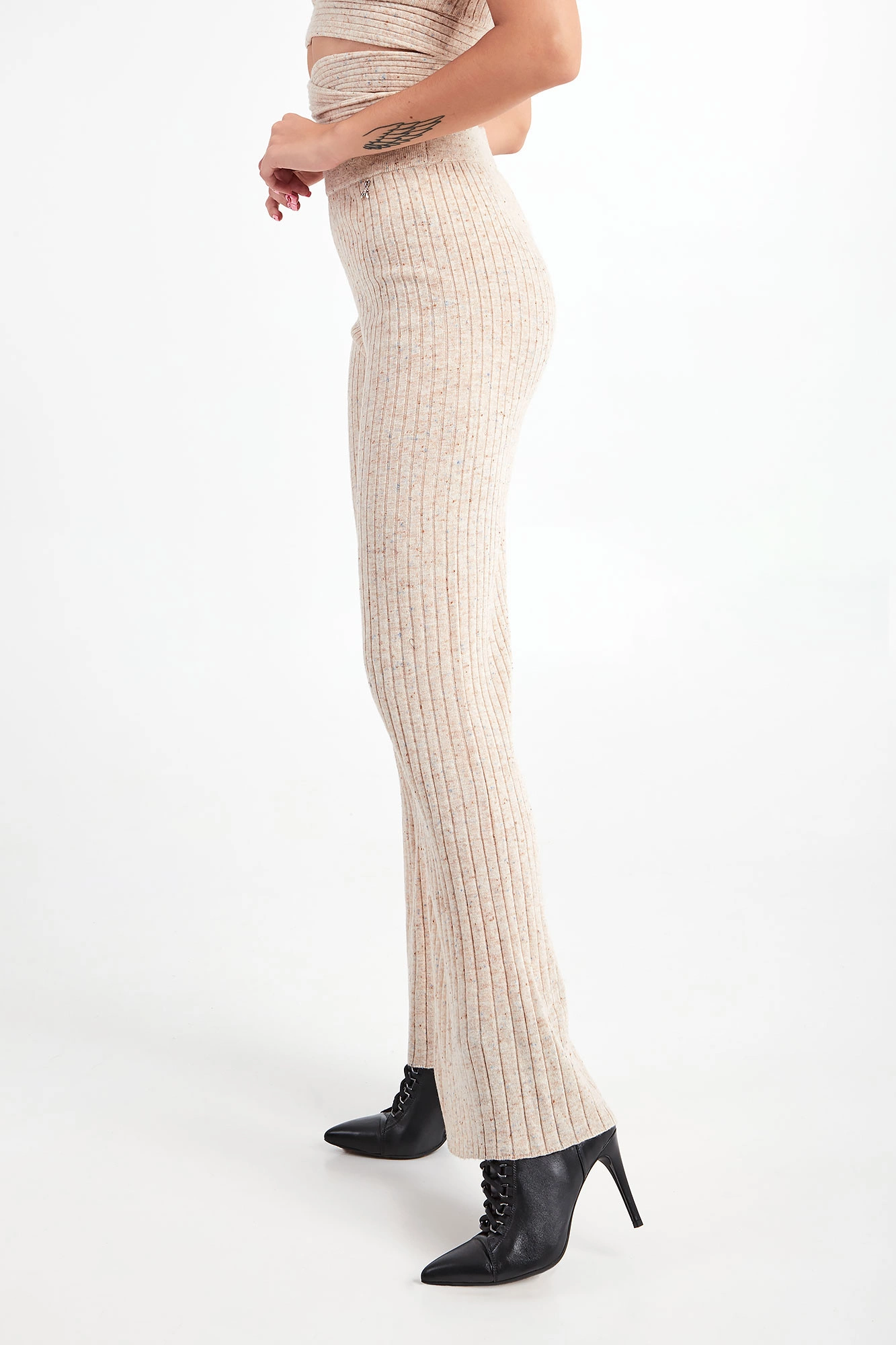 Prążkowane spodnie marki Patrizia Pepe w beżowym kolorze. Fason typu flare. W talii ściągacz. Na całości kolorowe nitki. Z przodu niewielka, metalowa aplikacja z logo marki w srebrnym kolorze. Wykonana z mieszanki materiałów z domieszką wełny.