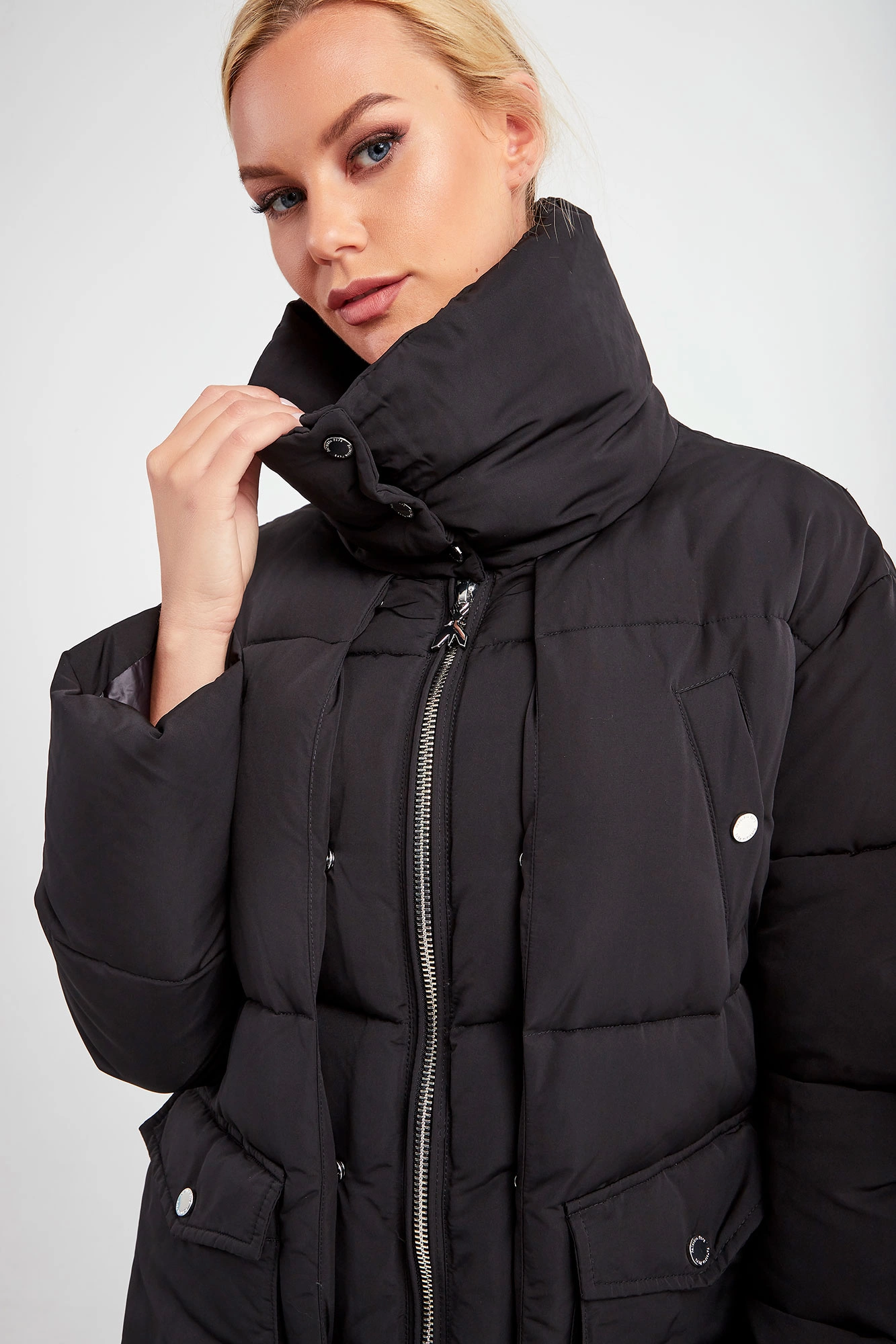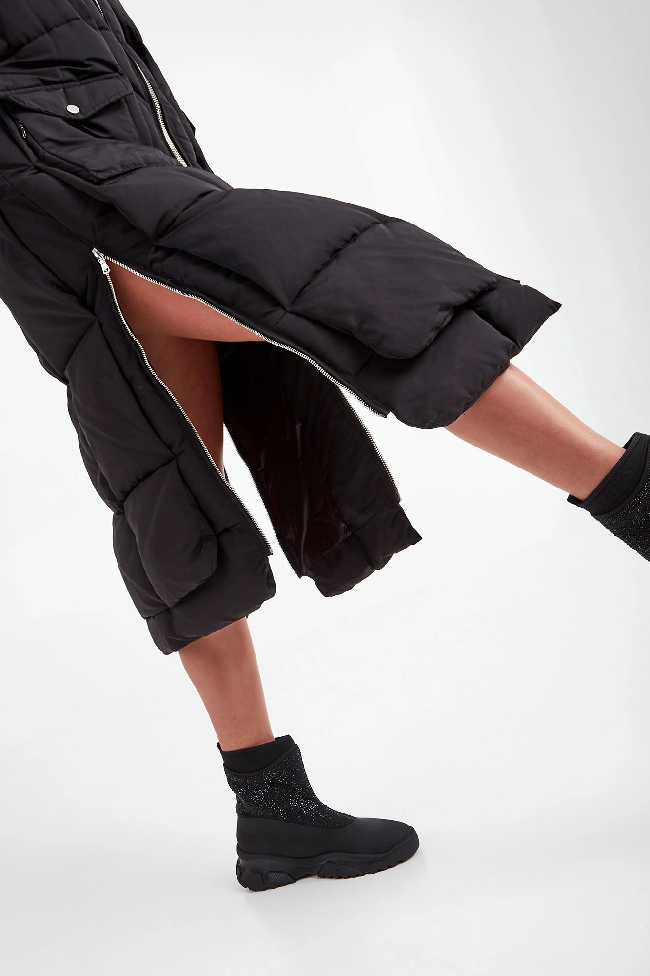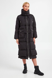 Pikowany płaszcz marki Patrizia Pepe w czarnym kolorze. Fason typu regular. Na całości przeszycia. Ze stójka. Model z czterema, zapinanymi kieszeniami. Zapinany na dwukierunkowy zamek z sygnowanymi suwakami i sygnowane napy w srebrnym kolorze. Po bokach ozdobne rozcięcia zapinane na zamek błyskawiczny. Sztuczne wypełnienie.