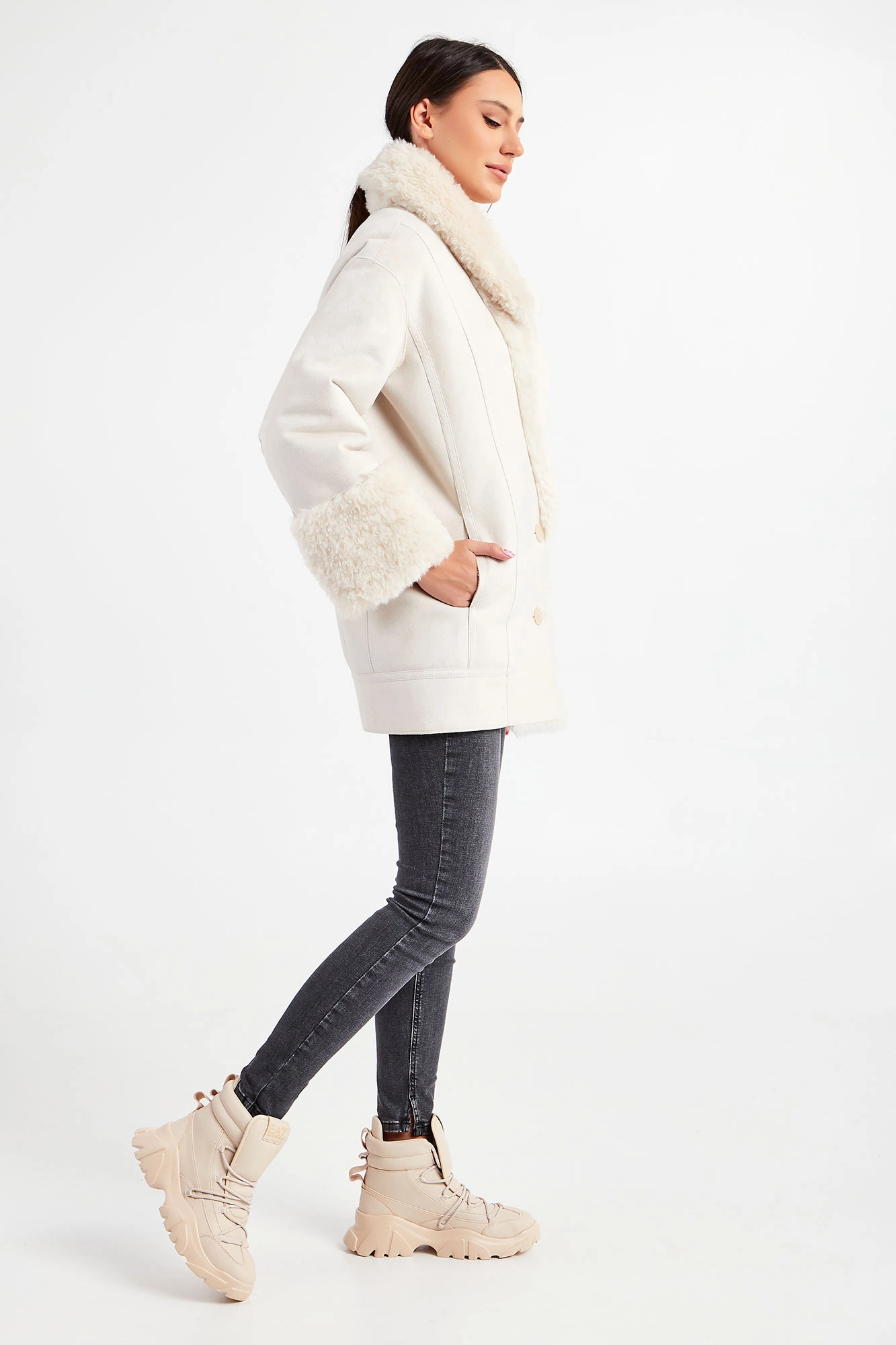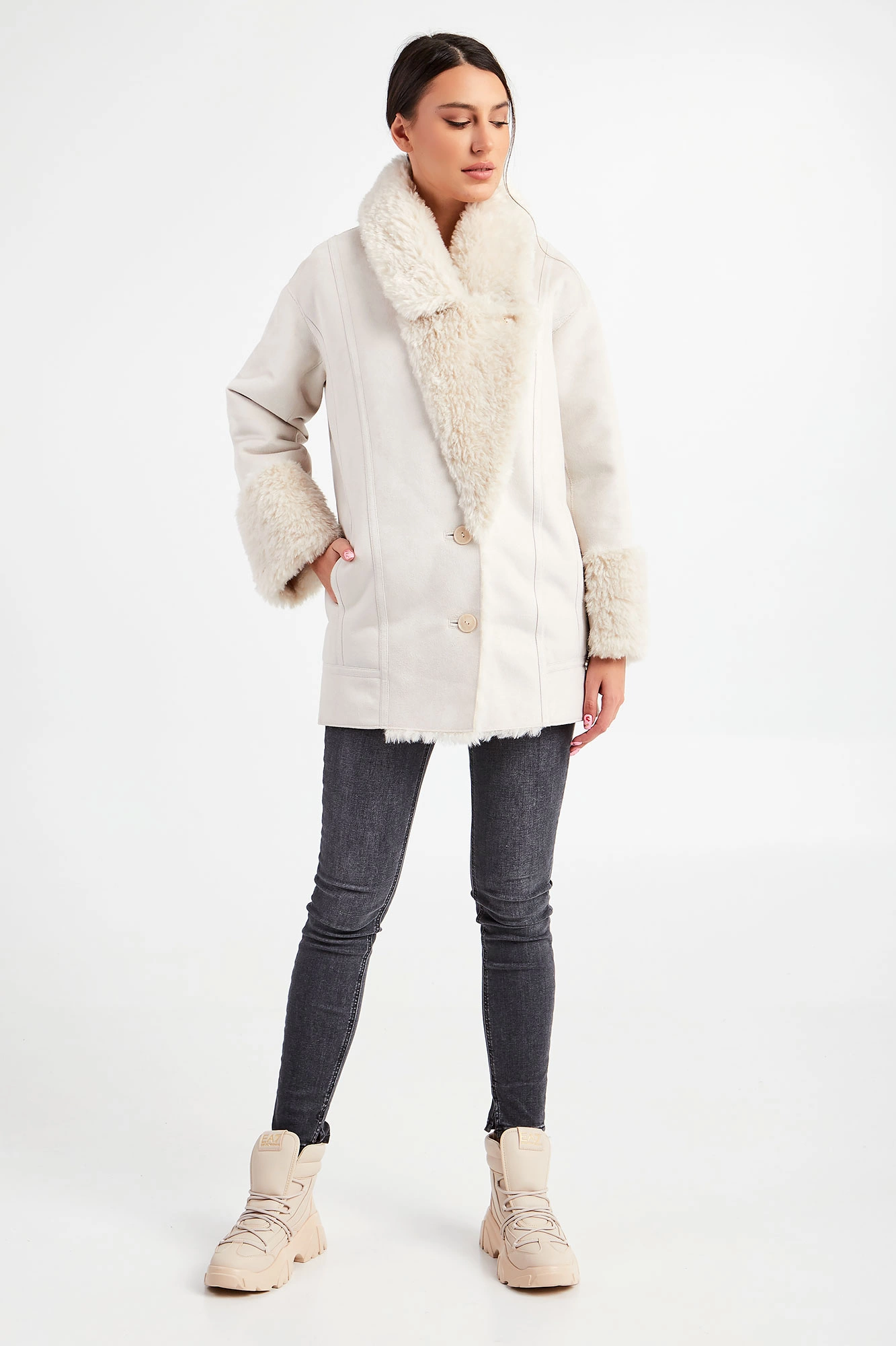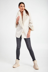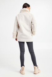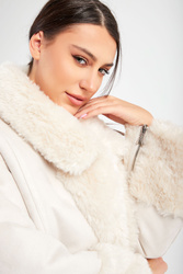 Kożuch marki Patrizia Pepe w beżowym kolorze. Fason typu relaxed. Z dużym, klasycznym, futerkowym kołnierzem. Zapinany na duże, sygnowane guziki. Na całości ozdobne przeszycia. Rękawy wykończone futerkiem i ozdobnymi zamkami błyskawicznymi z sygnowanym suwakiem. Model z dwoma kieszeniami. Bardzo ciepły i jednocześnie stylowy.