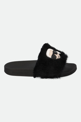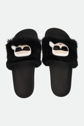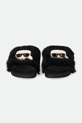 Klapki marki Karl Lagerfeld w czarnym kolorze. Z przodu szeroki pasek pokryty futerkiem z naszywką w kształcie postaci założyciela marki. Na bokach i w środku podeszwy tłoczona nazwa marki. Podeszwa tłoczona oraz profilowana. Wykonane z lekkiego tworzywa.