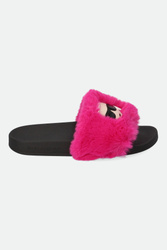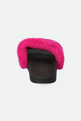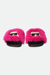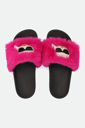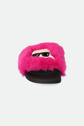 Klapki marki Karl Lagerfeld w różowym kolorze. Z przodu szeroki pasek pokryty futerkiem z naszywką w kształcie postaci założyciela marki. Na bokach i w środku podeszwy tłoczona nazwa marki. Podeszwa tłoczona oraz profilowana. Wykonane z lekkiego tworzywa.