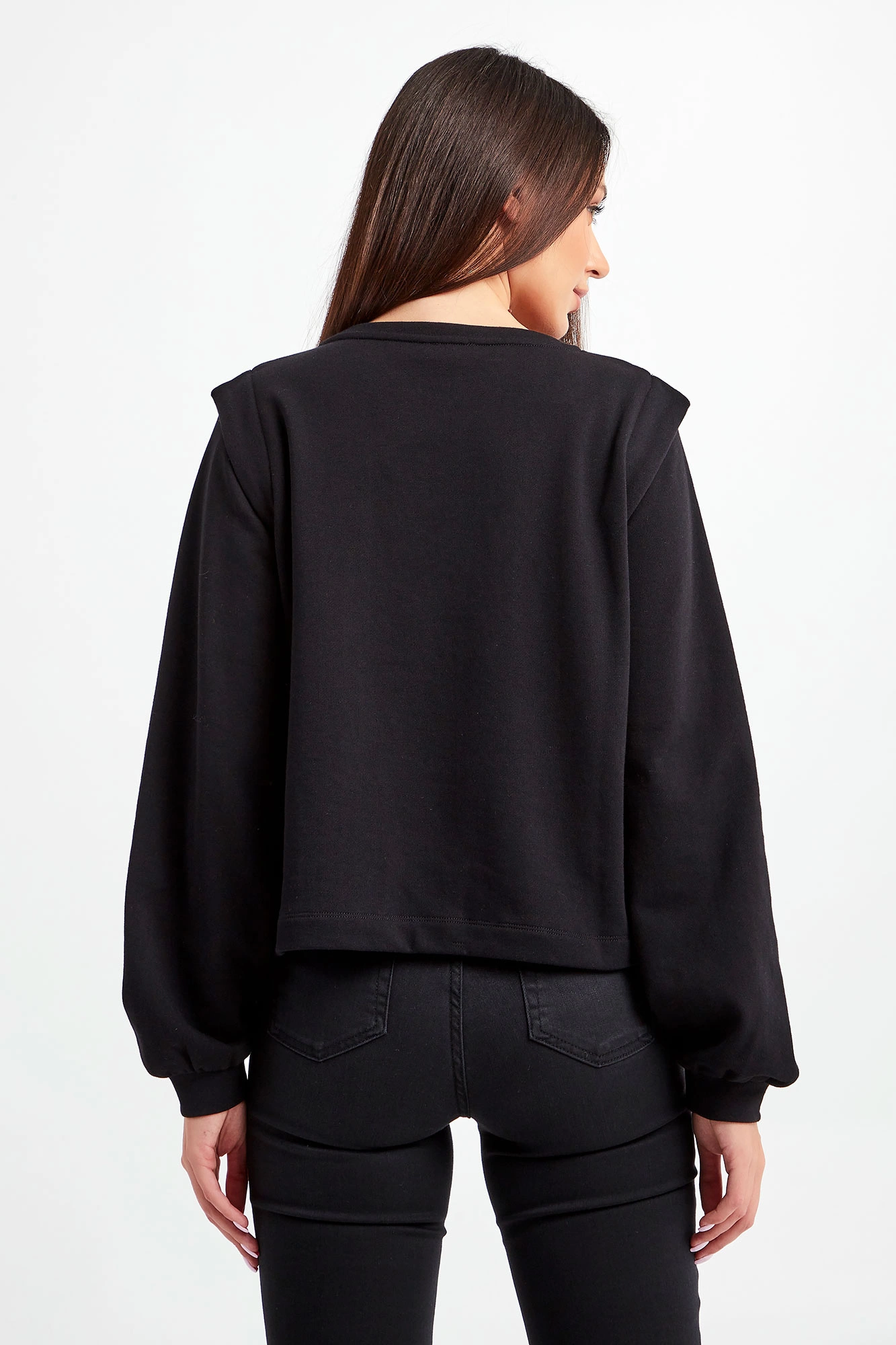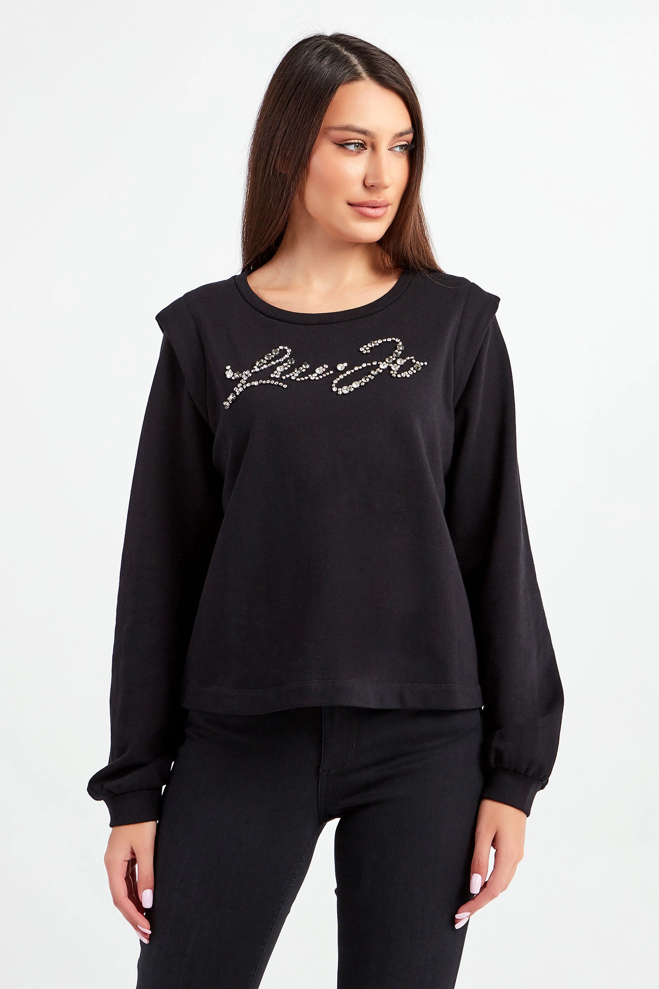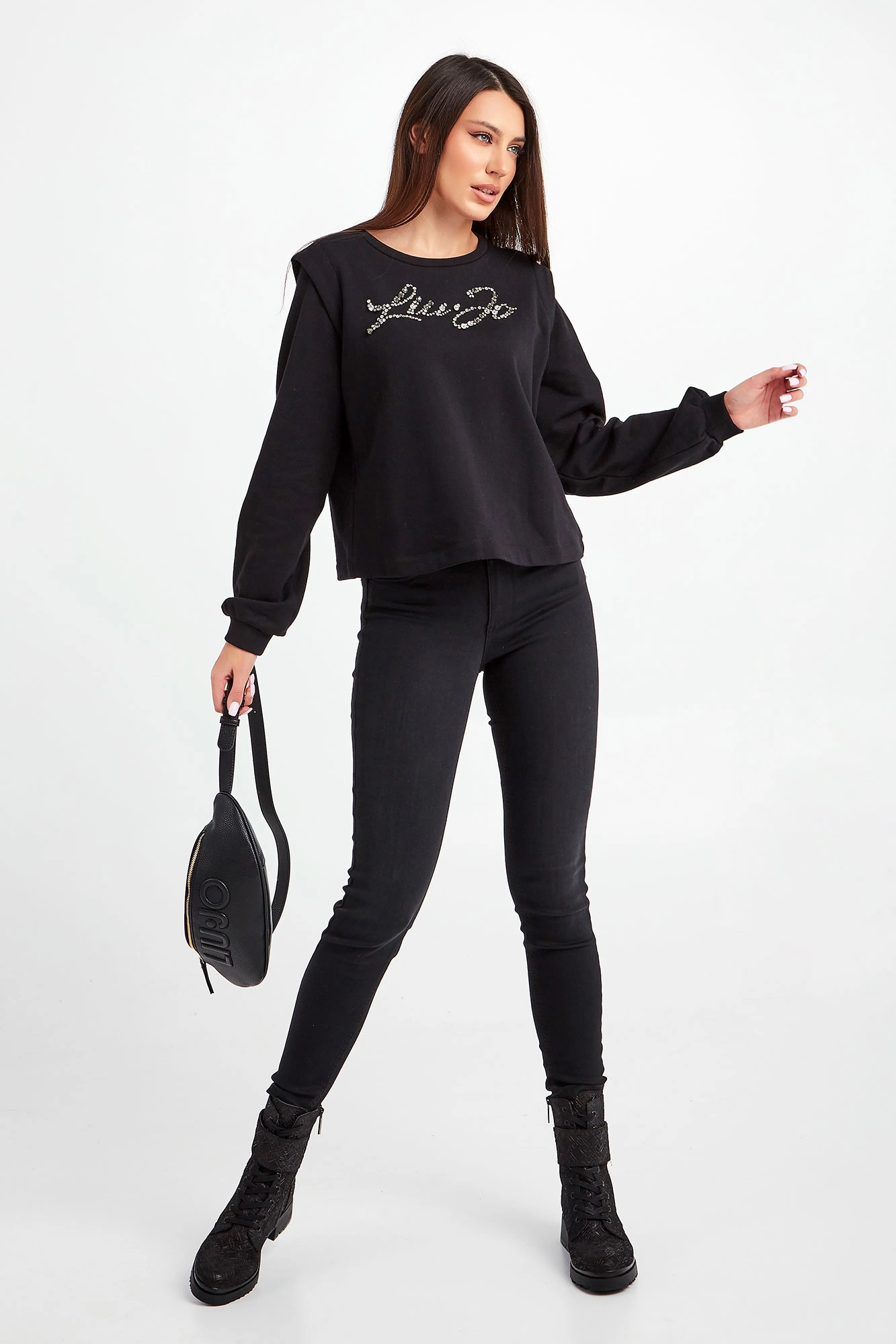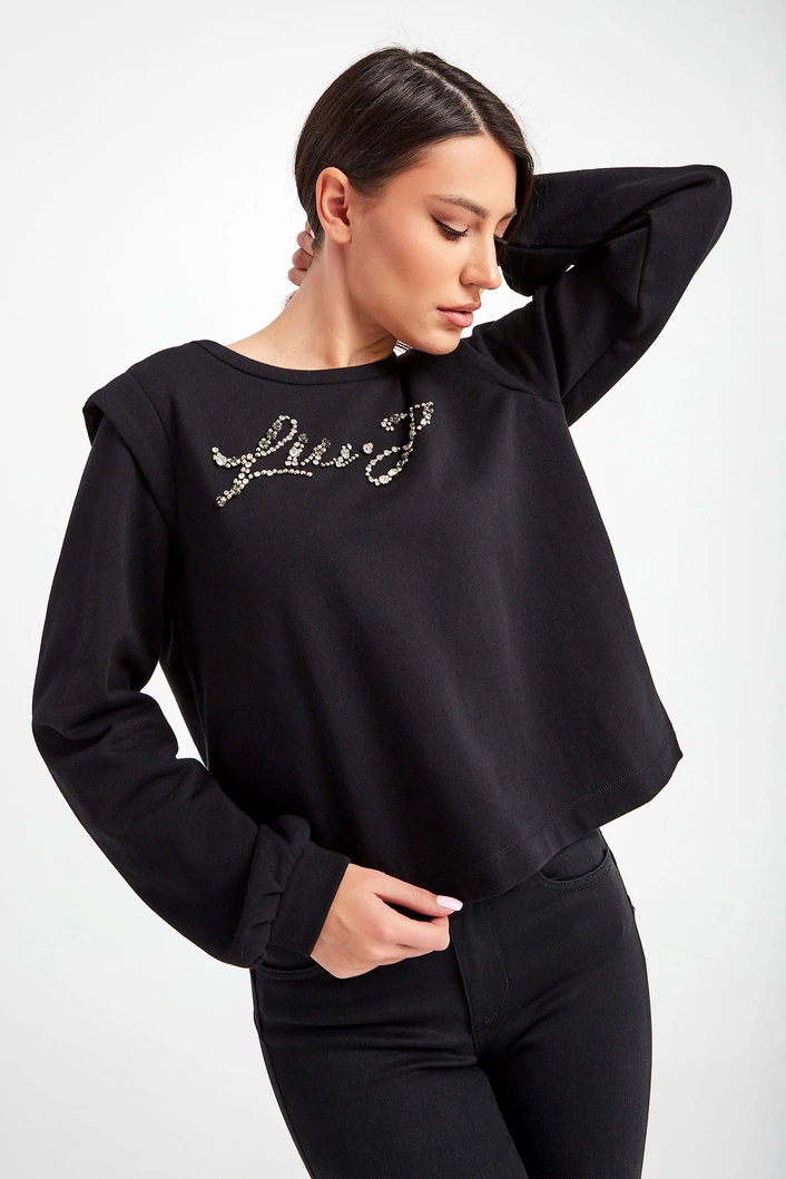 Bluza marki Liu Jo w czarnym kolorze. Fason typu regular. Bufiaste rękawy zakończone elastycznym ściągaczem. Z przodu duży napis w postaci nazwy marki składający się ze srebrnych i grafitowych kryształów. Dekolt typu o-neck i dół wykończone ściągaczem. Wykonana z elastycznej, mięsistej bawełny.