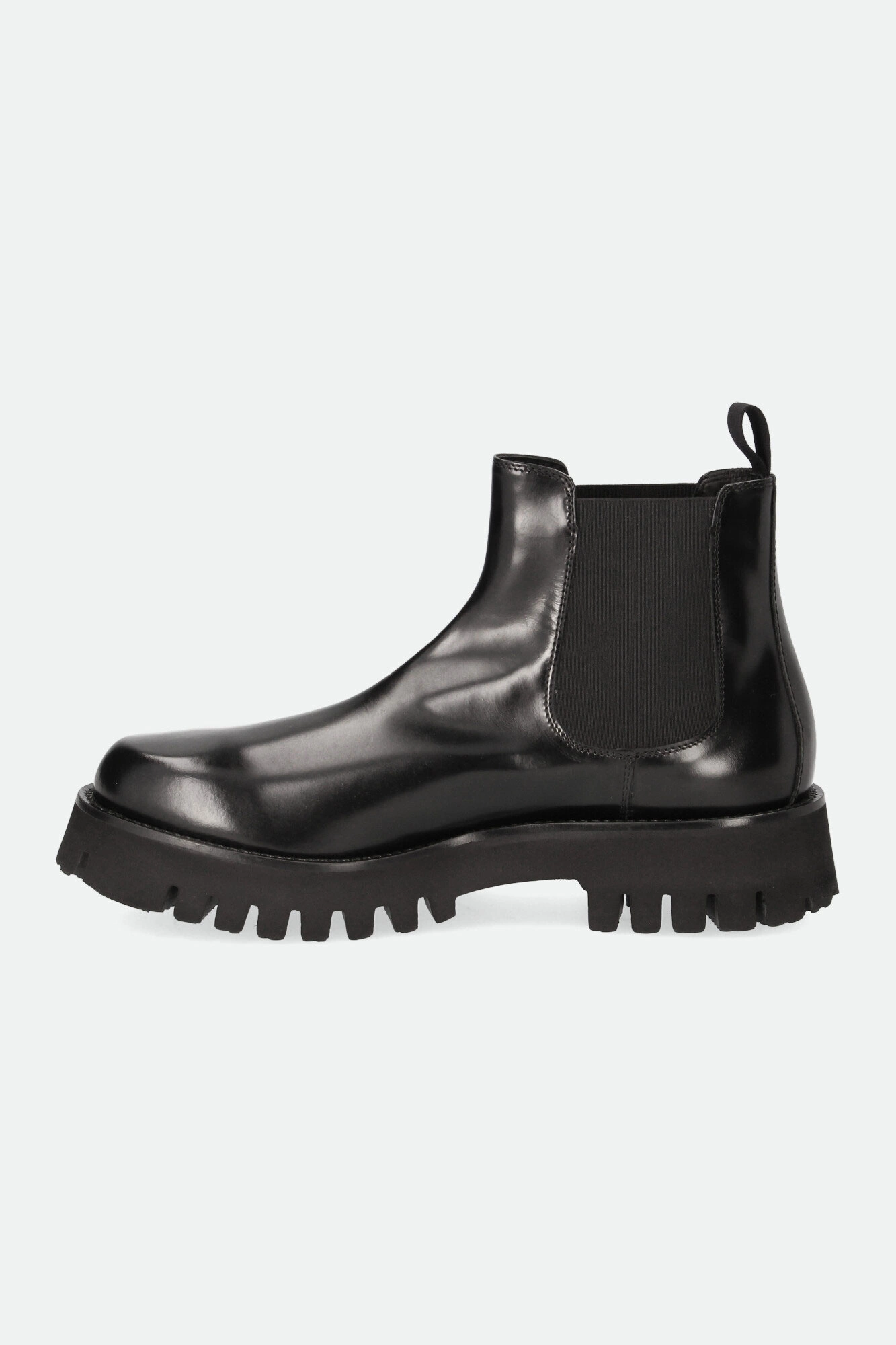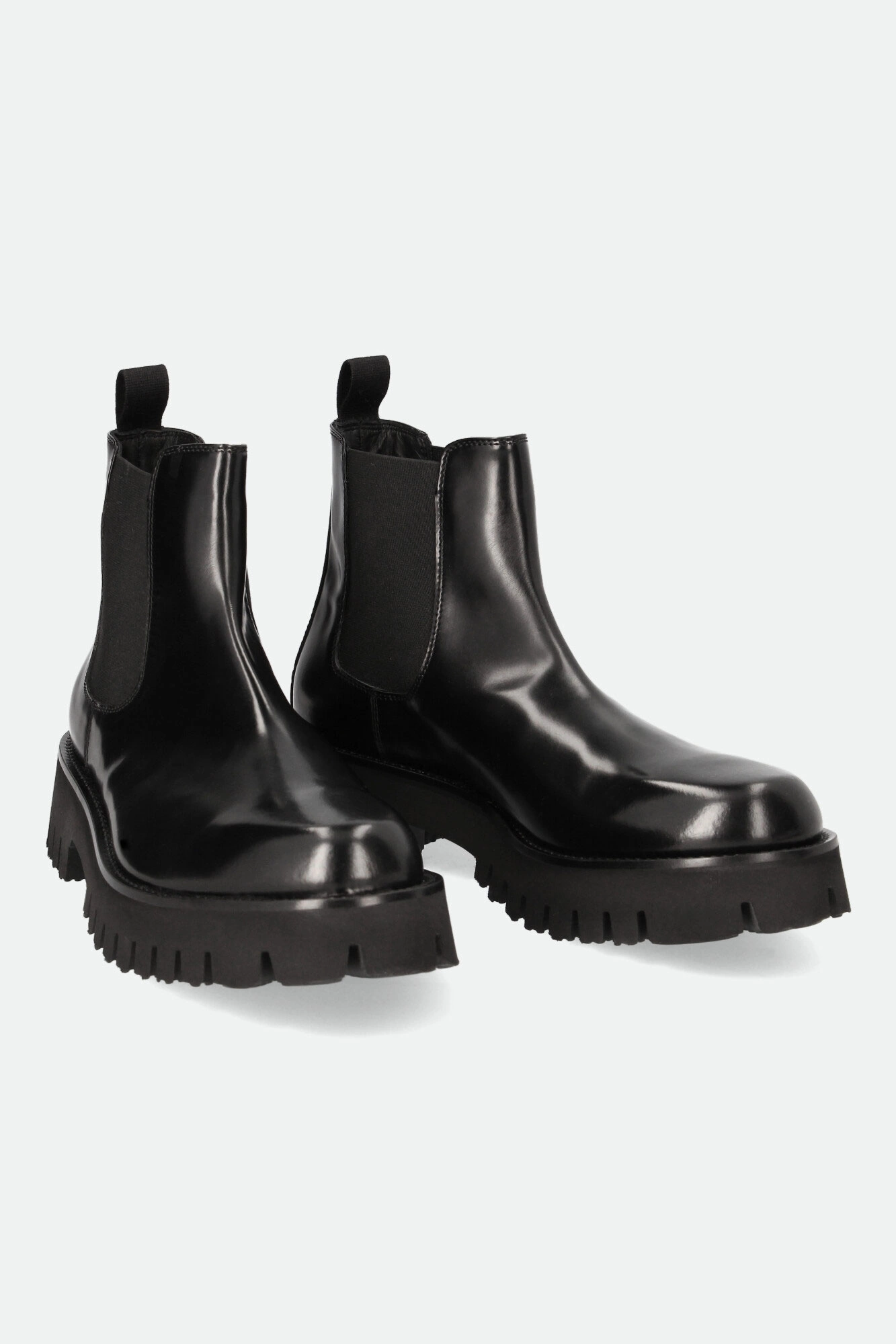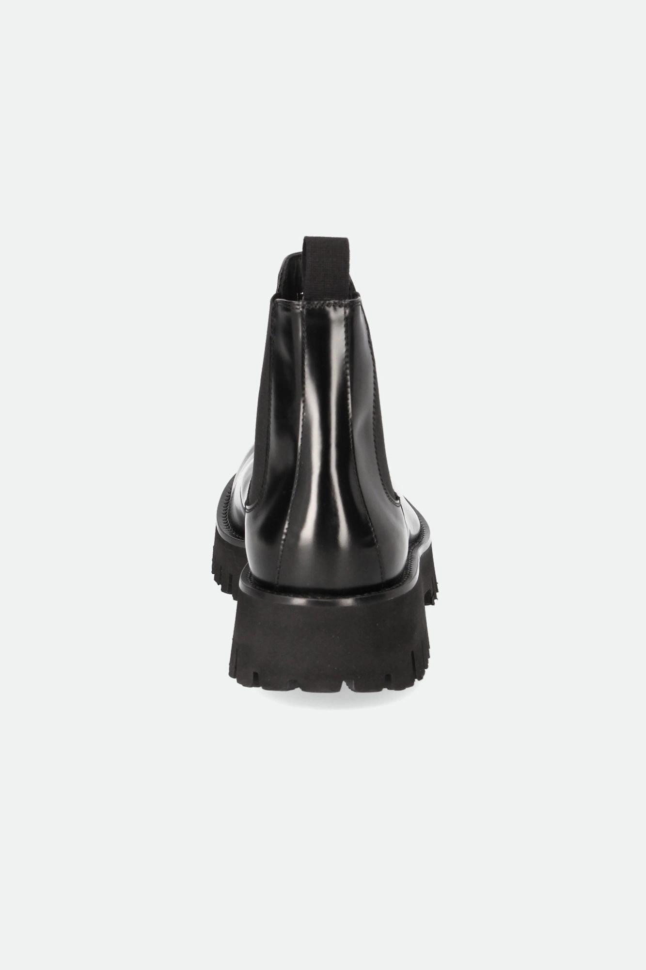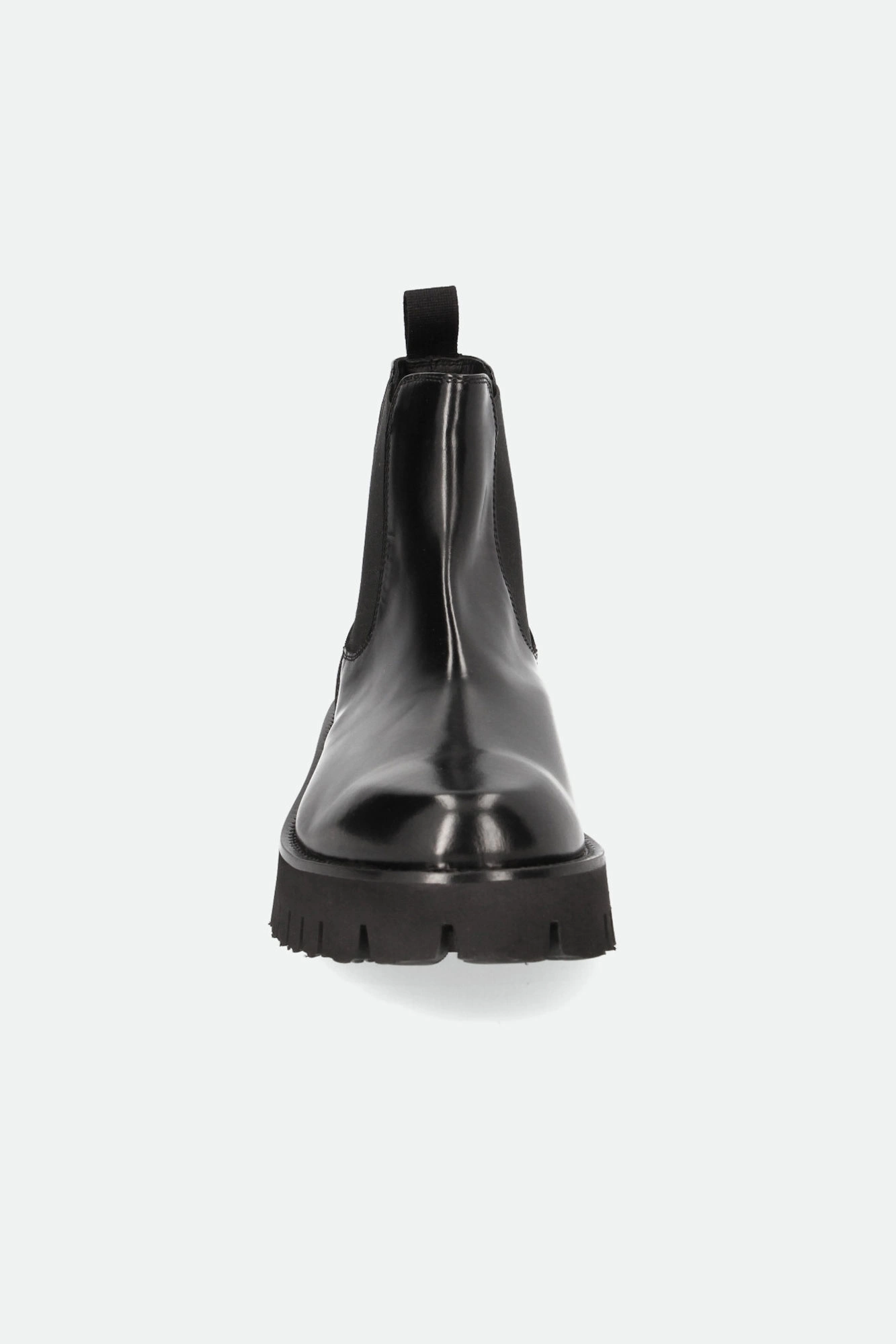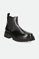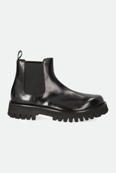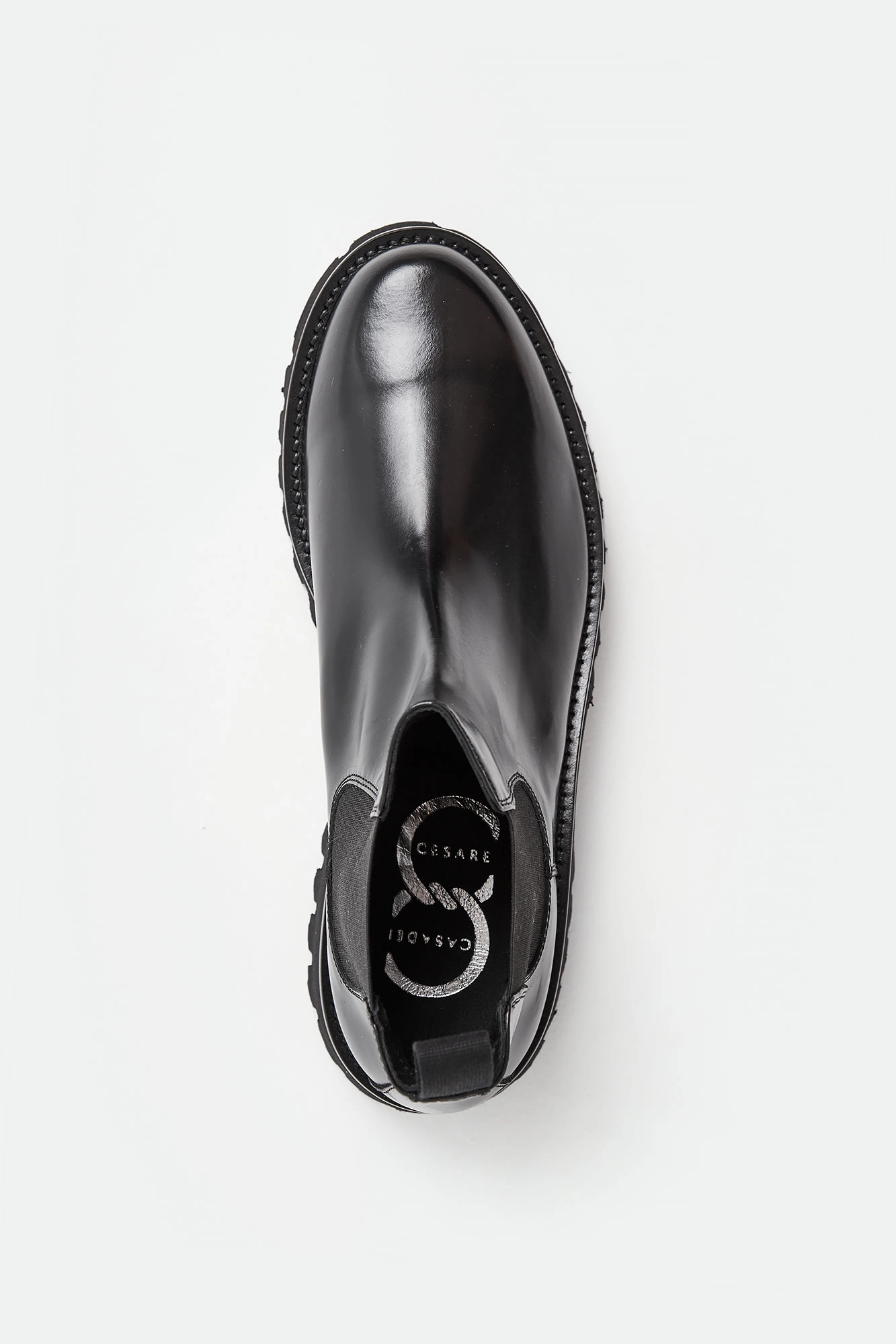 Sztyblety marki Cesare Casadei w kolorze czarnym. Wykonane ze skóry naturalnej. Cała powierzchnia gładka i połyskująca. Po obu stronach duże gumki ułatwiające wkładanie buta. Długość do kostki. Całości dopełnia gruba podeszwa o wysokości 3,5 cm. W komplecie worek przeciwkurzowy.