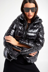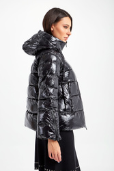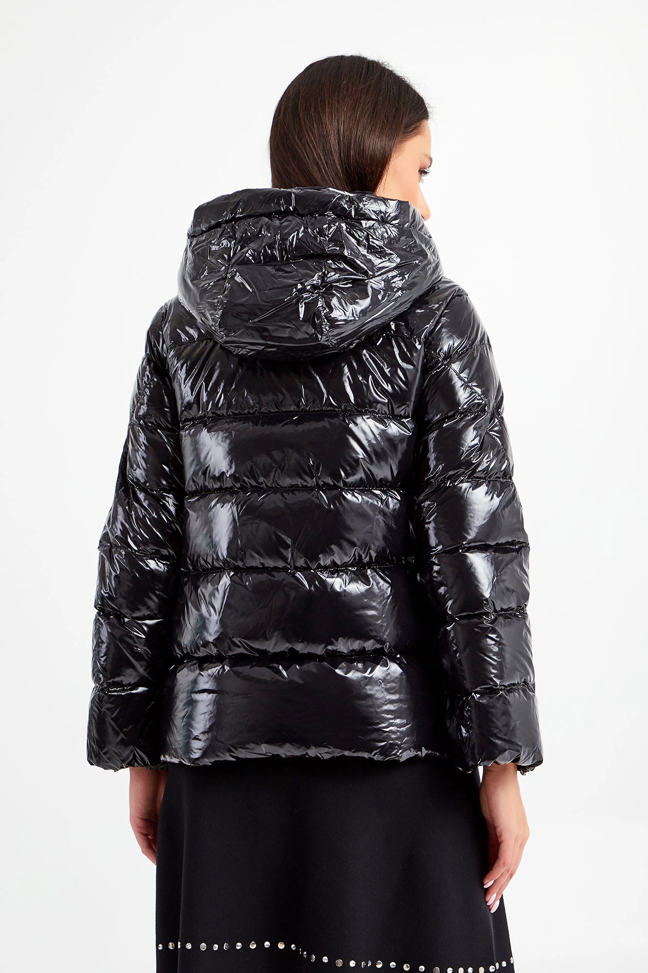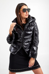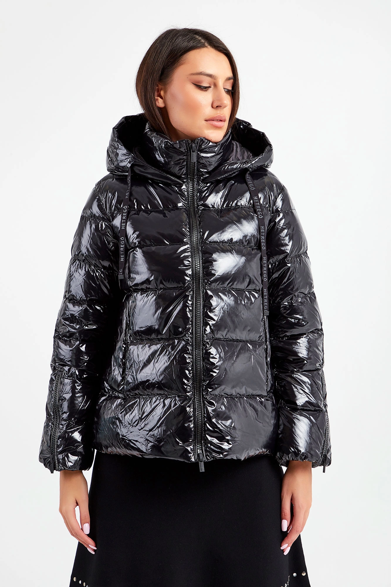 Pikowana, puchowa kurtka marki Hetrego w czarnym kolorze. Fason typu regular. Całość połyskująca z przeszyciami. Ze stójką i kapturem regulowanym za pomocą sygnowanych troczków, Zapinana na dwukierunkowy zamek błyskawiczny w kolorze kurtki. Długie rękawy z zamkiem błyskawicznym. Model z dwoma kieszeniami. Naturalne wypełnienie.