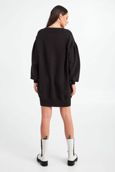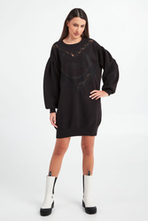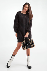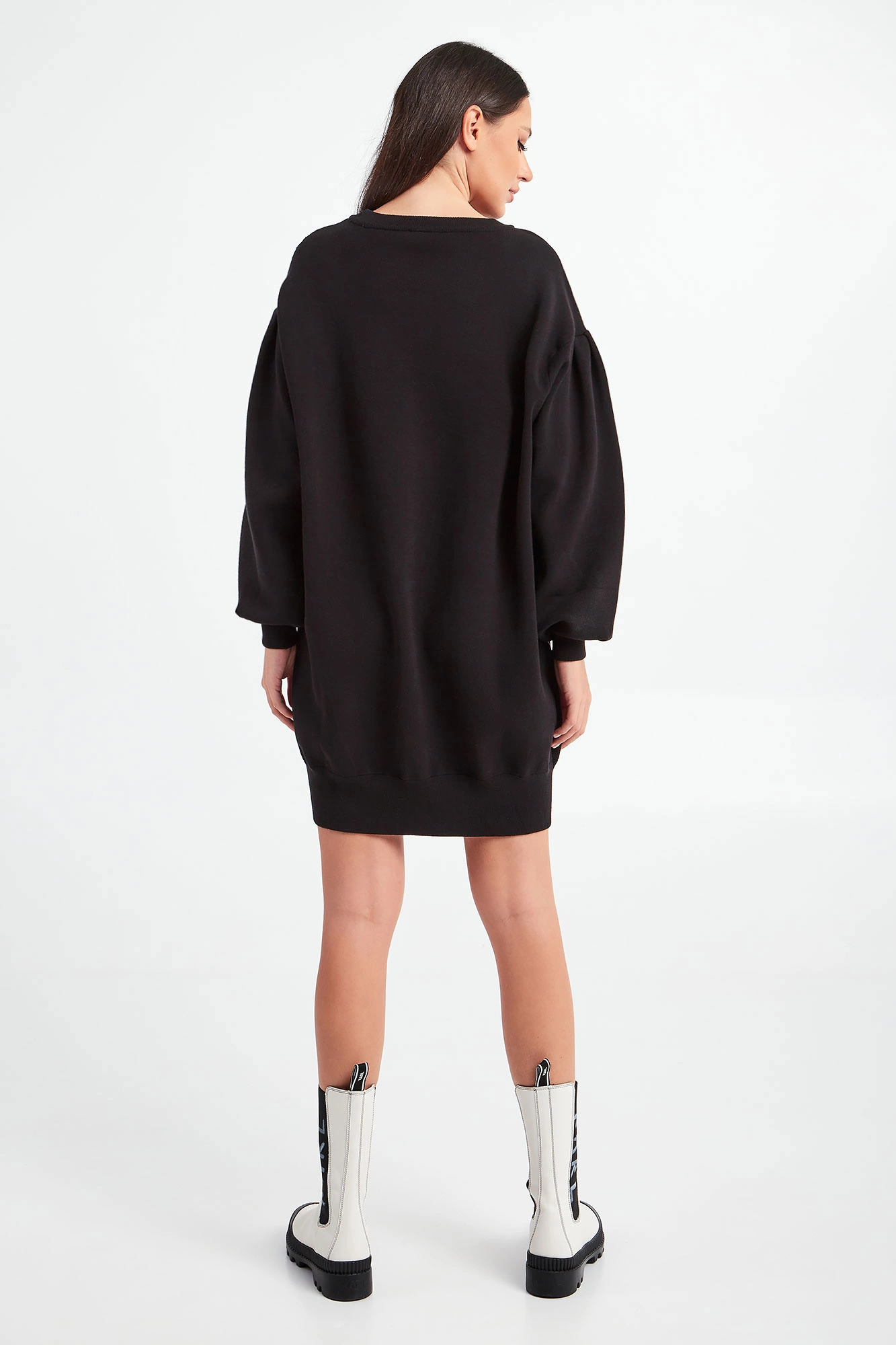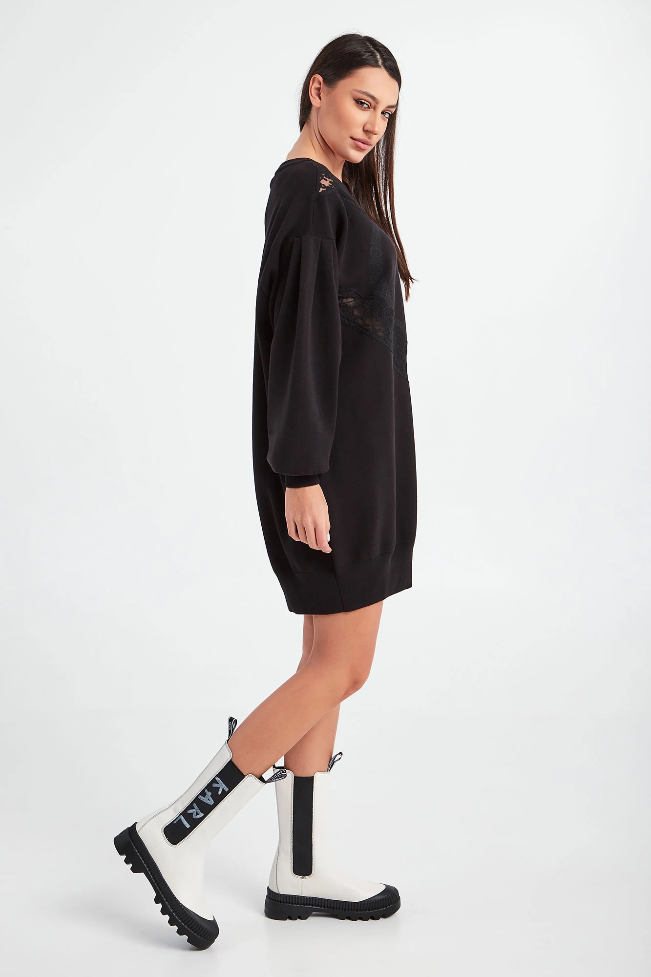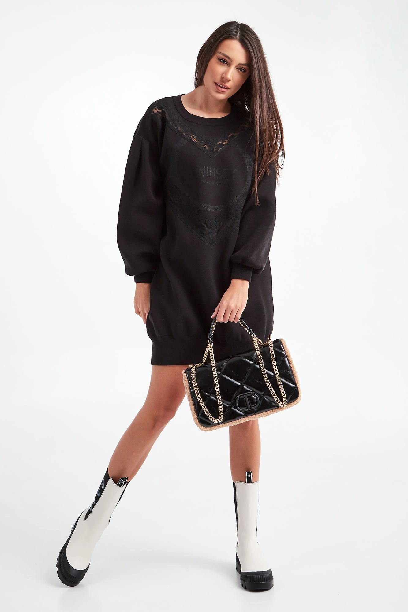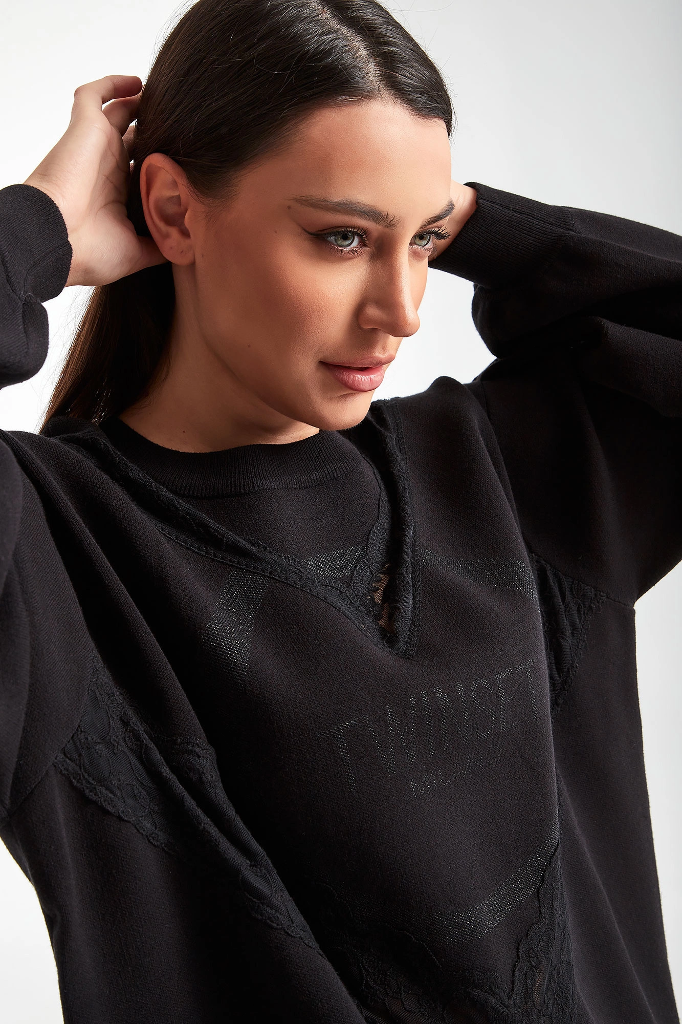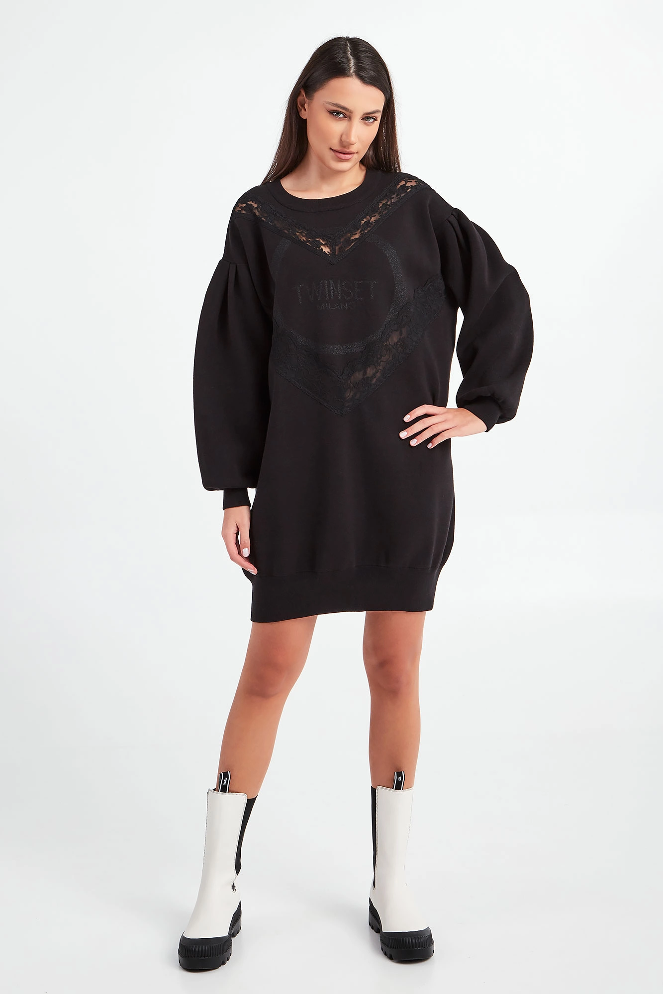 Sukienka marki Twinset w czarnym kolorze. Fason oversize, długość mini. Z przodu wzór z nazwą marki oraz czarna, kwiatowa koronka. Okrągły dekolt, długie, bufiaste rękawy oraz dół zakończone elastycznymi ściągaczami. Wykonana z elastycznej, wiskozowej tkaniny.