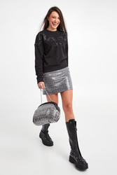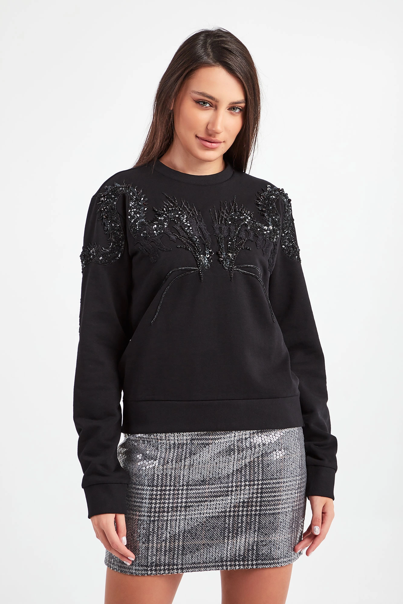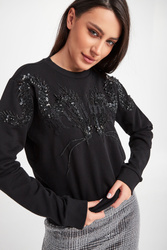 Bluza marki John Richmond w czarnym kolorze. Fason regular fit. Z przodu haft ozdobiony czarnymi, połyskującymi cekinami i koralikami. Dekolt typu o-neck, rękawy oraz dół wykończone elastycznymi ściągaczami. Wykonana ze stuprocentowej, czystej bawełny. Klasyczna propozycja z niebanalnym wykończeniem.