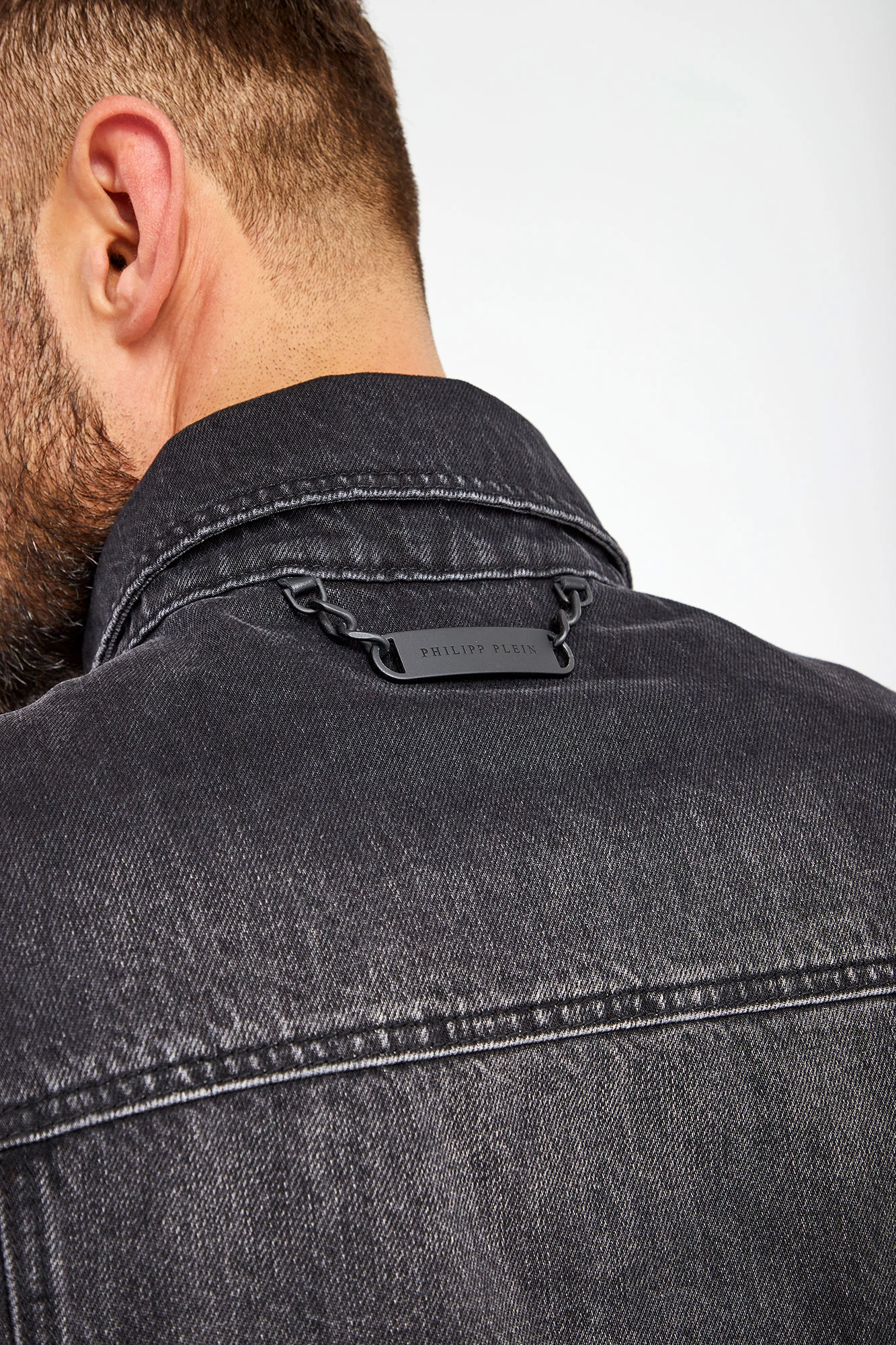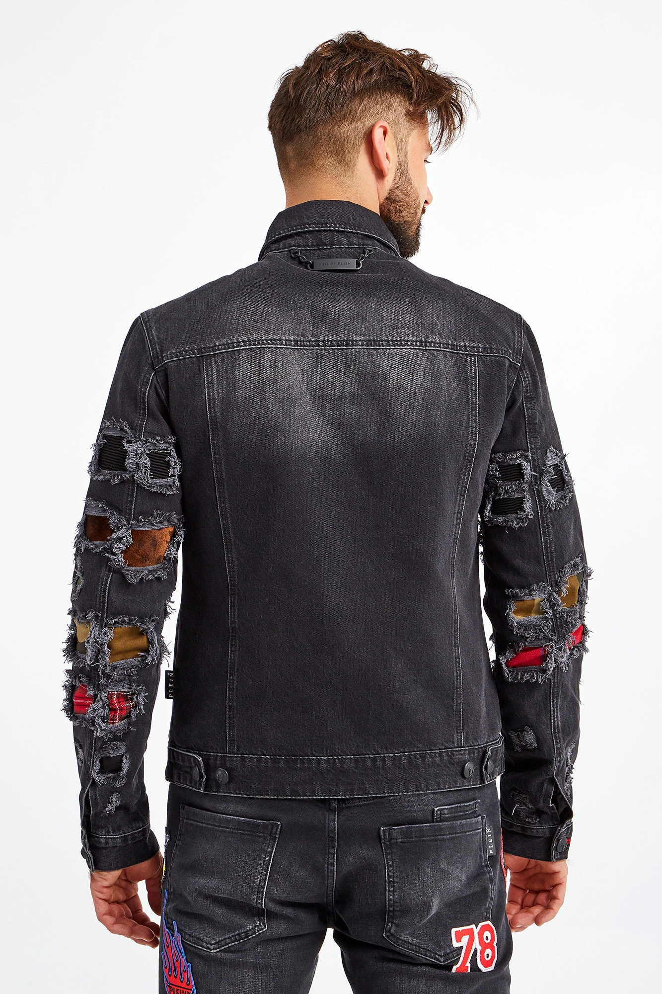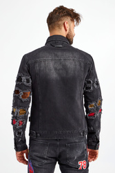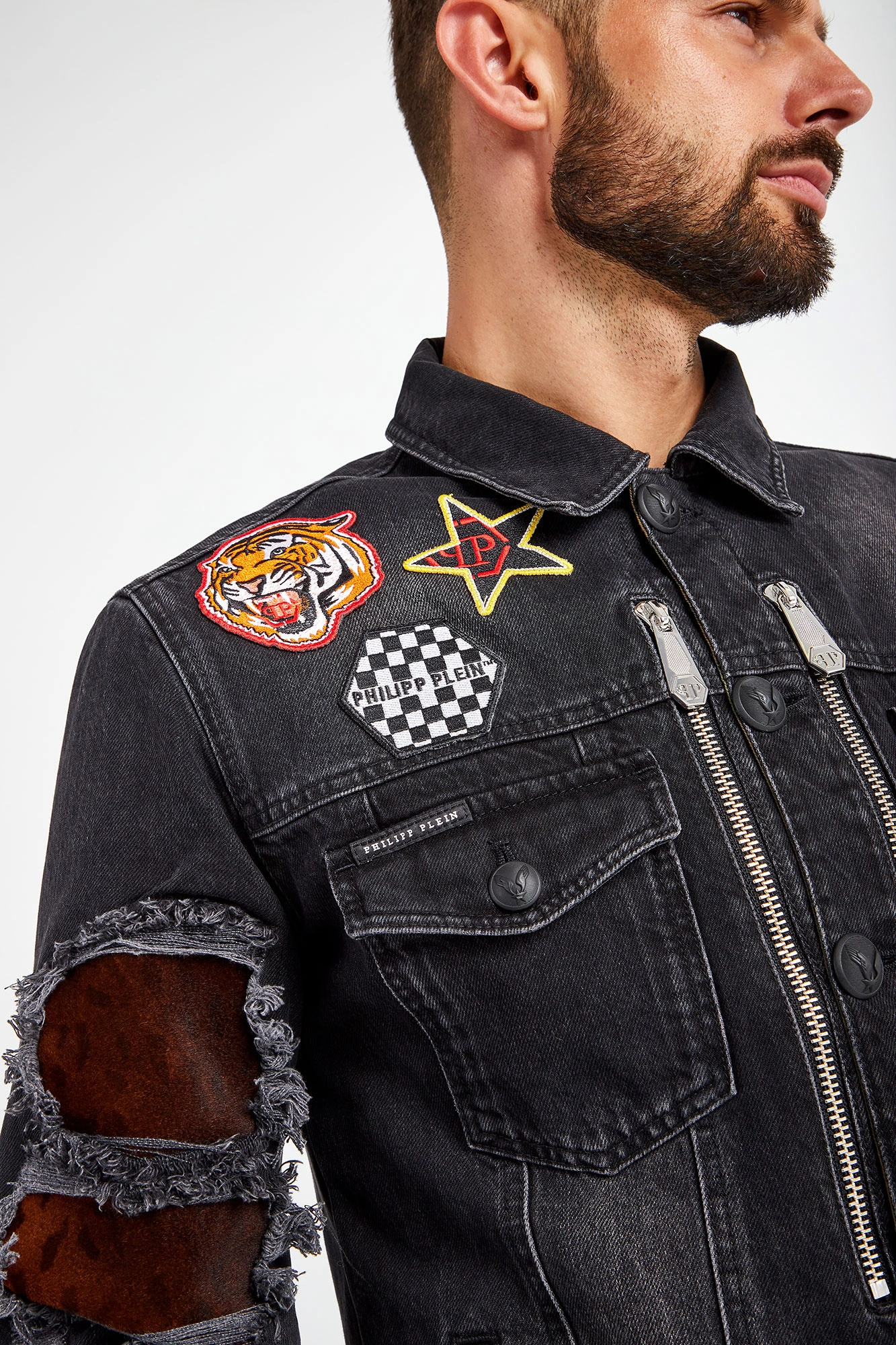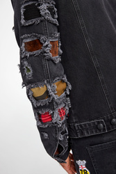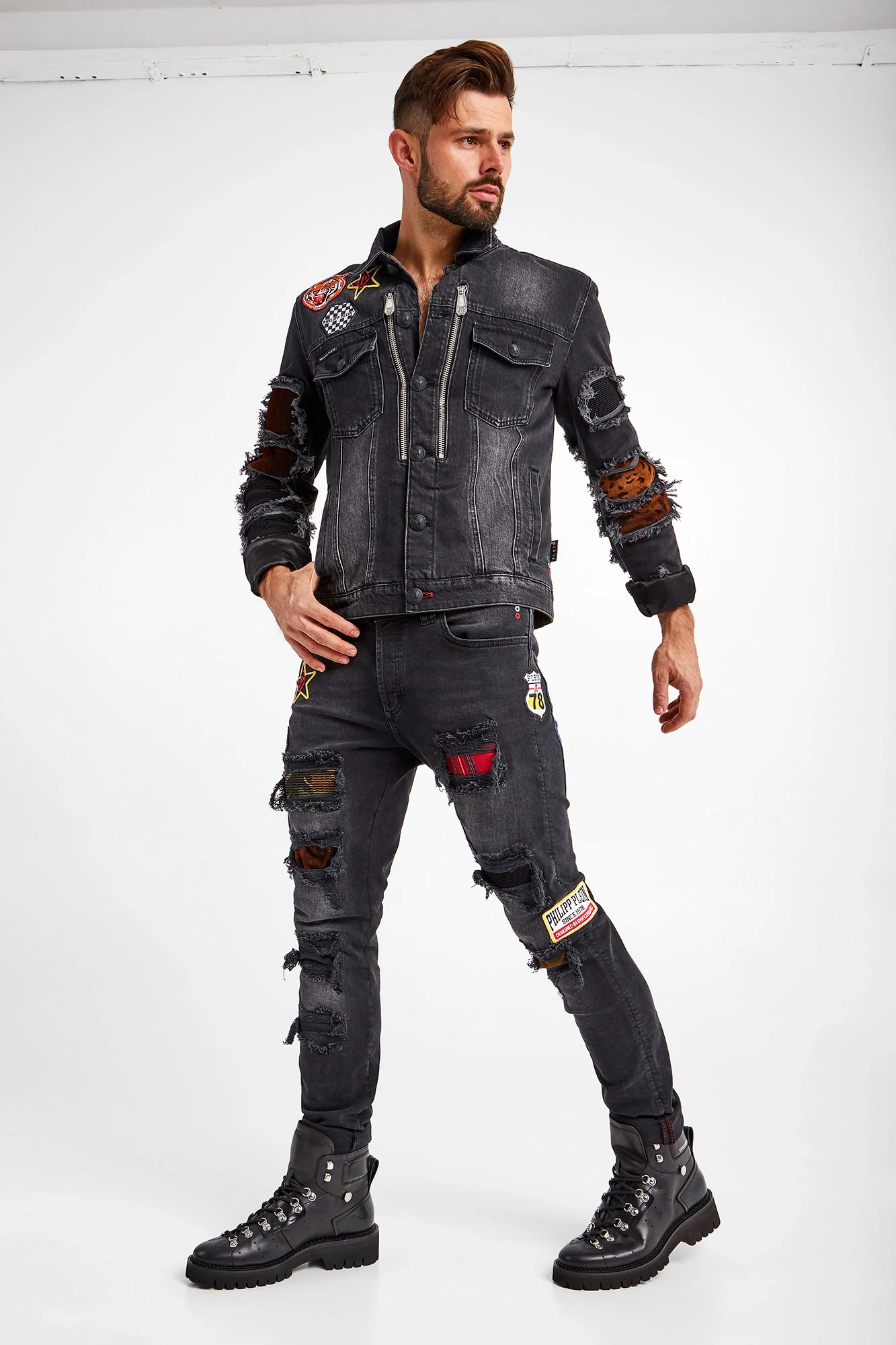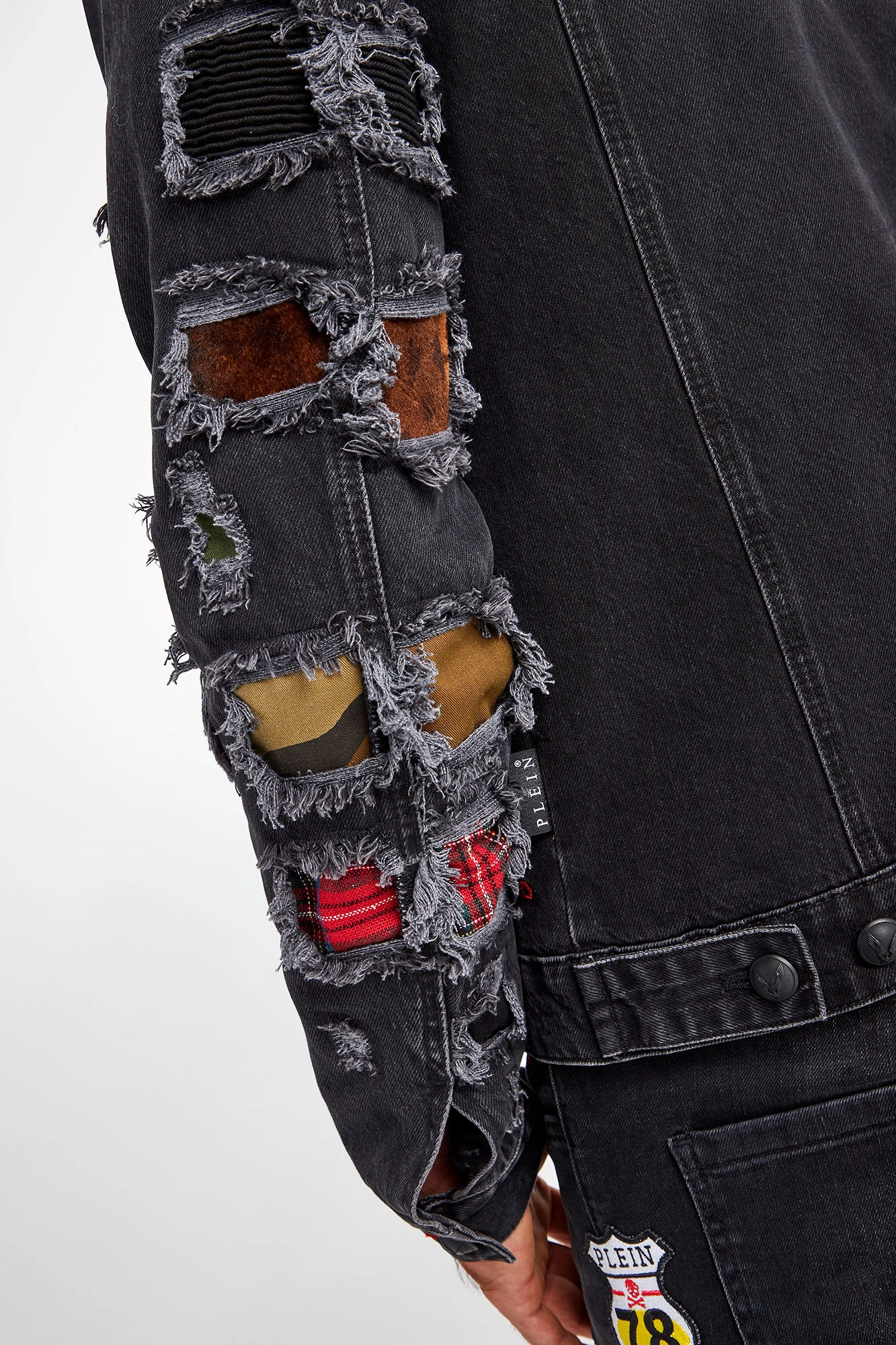 Kurtka jeansowa marki Philipp Plein w czarnym kolorze. Fason regular fit. Na całości modne rozdarcia, cerowanie z różnych materiałów i haftowane naszywki. Zapinana za pomocą sygnowanych guzików. Po bokach dwa ozdobne suwaki z logowanymi zawieszkami. Model z czterema kieszeniami. Klasyczny kołnierz. Rękawy zakończone zapinanymi mankietami. Na linii karku zawieszka z logo. Czarna, pikowana, satynowa podszewka ze wstawkami z efektem kamuflażu.