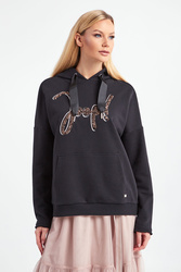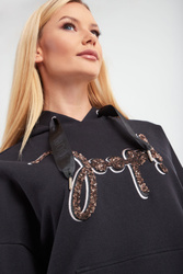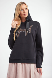 Bluza z kapturem marki Joop! w czarnym kolorze. Krój regular fit. Nierozpinana. Na kangurkowej kieszeni metalowa aplikacja z nazwą marki. Długie rękawy oraz dół zakończone szerokimi ściągaczami. Z przodu duży haft z nazwa marki, wykończony cekinami. Kaptur regulowany za pomocą szerokich troczków w kolorze bluzy. Wykonana z ciepłej, miękkiej, bawełnianej tkaniny.
