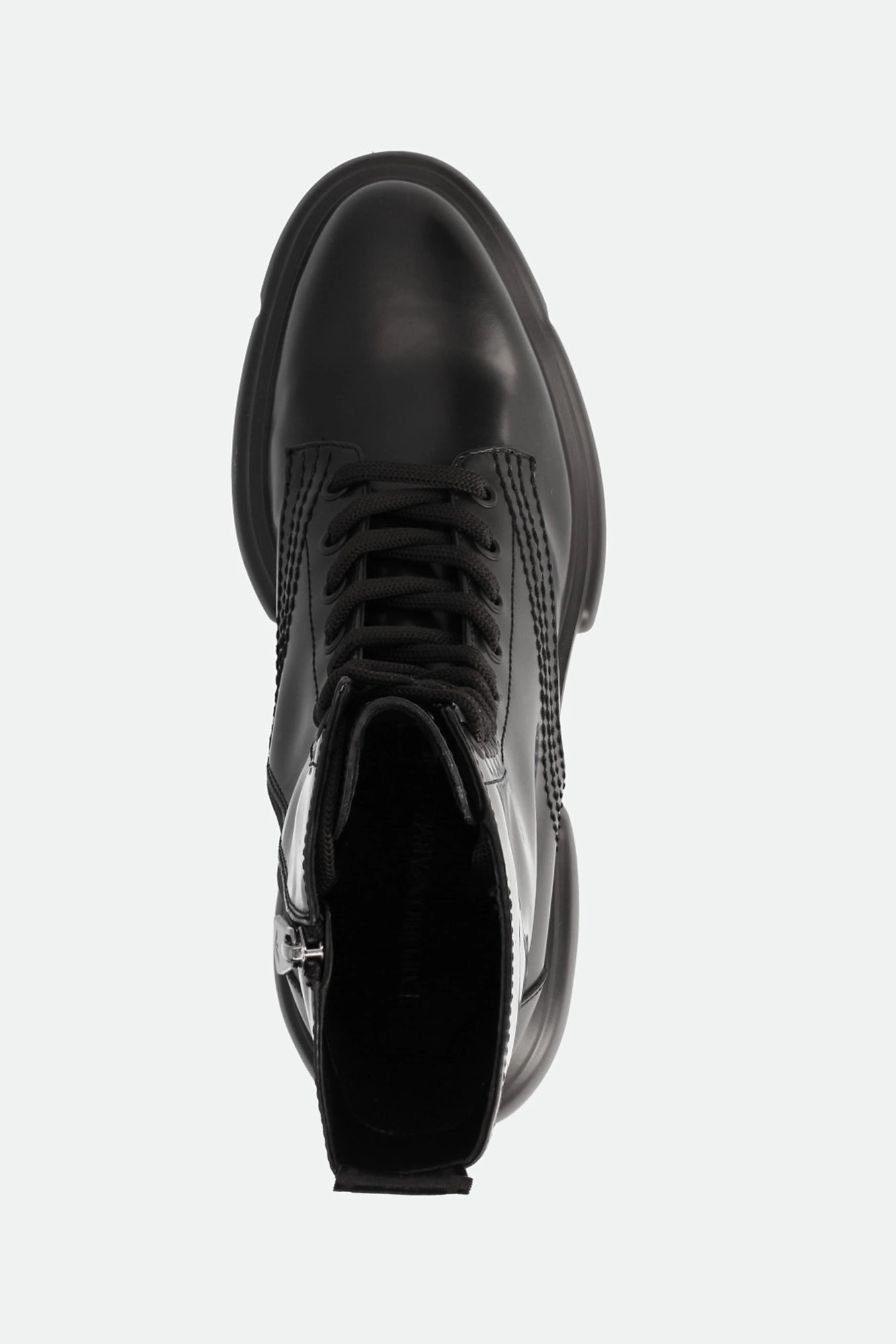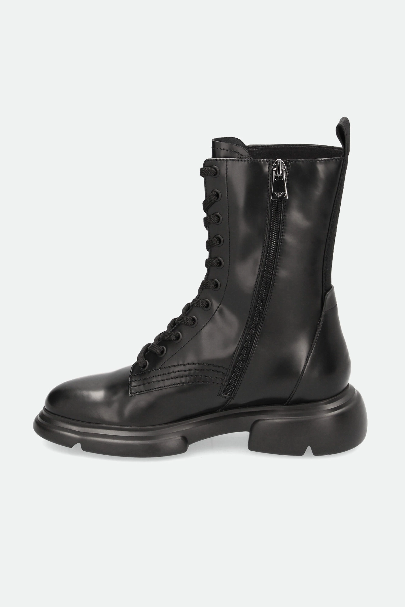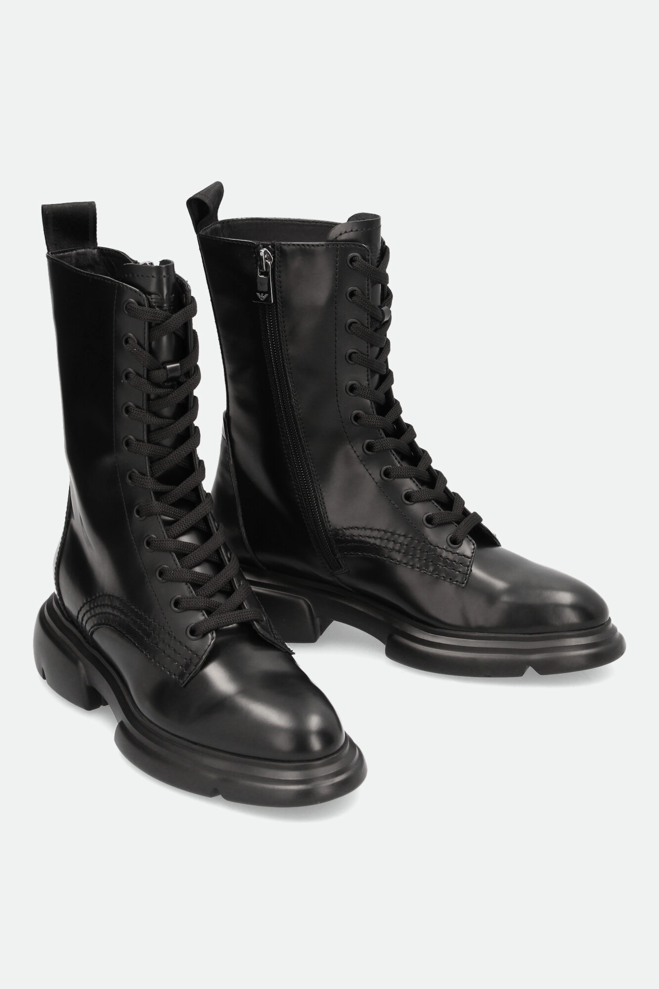 Trapery marki Emporio Armani w czarnym kolorze. Mocno zaokrąglony nosek. Po bokach zapinane na zamek błyskawiczny w czarnym kolorze. Z przodu wiązane za pomocą sznurówek. Na języku tłoczone logo marki. Z tyłu sygnowany pasek ułatwiający zakładanie butów. Wykonane z gładkiej, naturalnej skóry. Podeszwa wykonana w technologii XL EXTRALIGHT®, którą cechuje mała waga i wysoka amortyzacja.