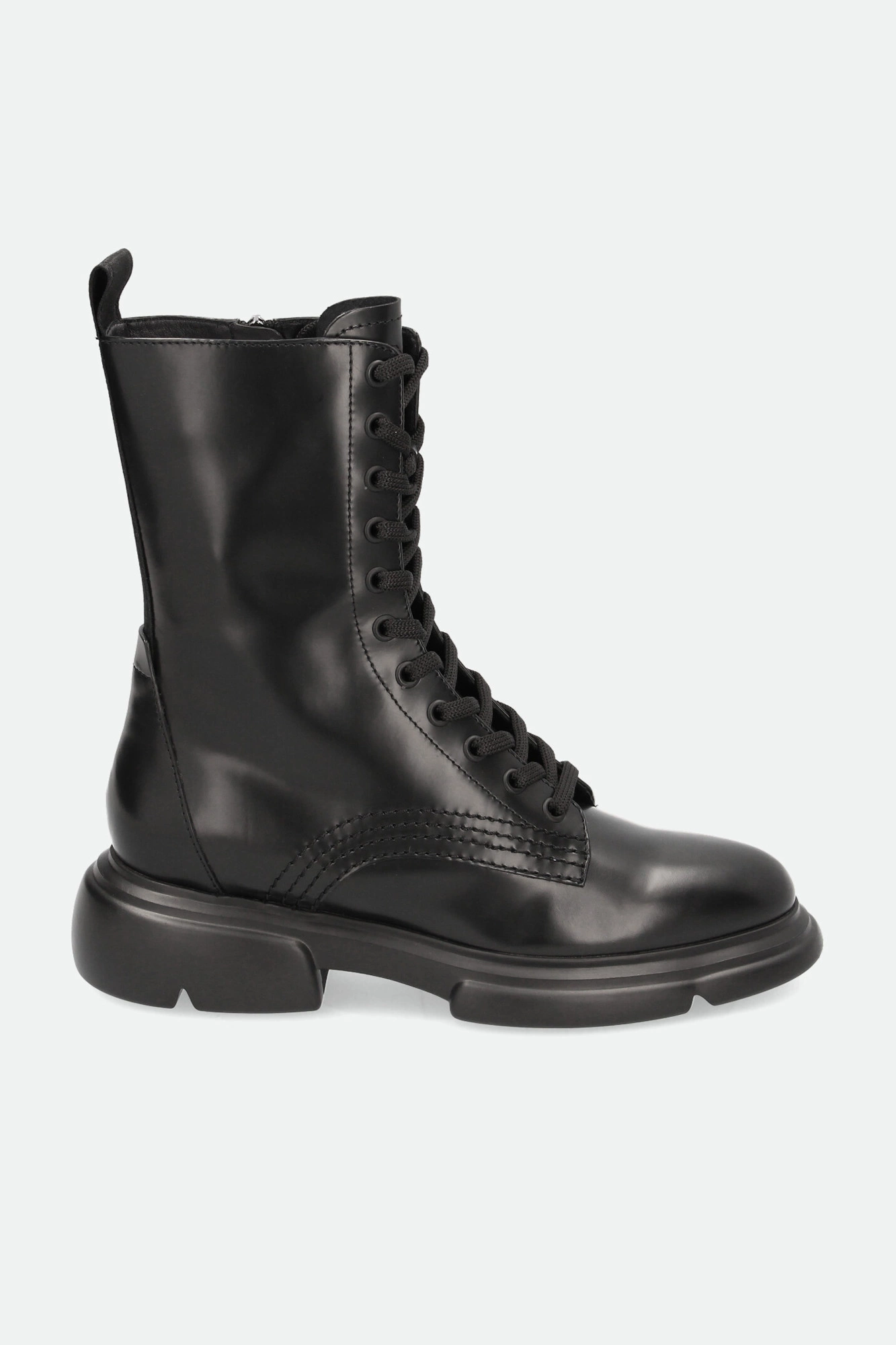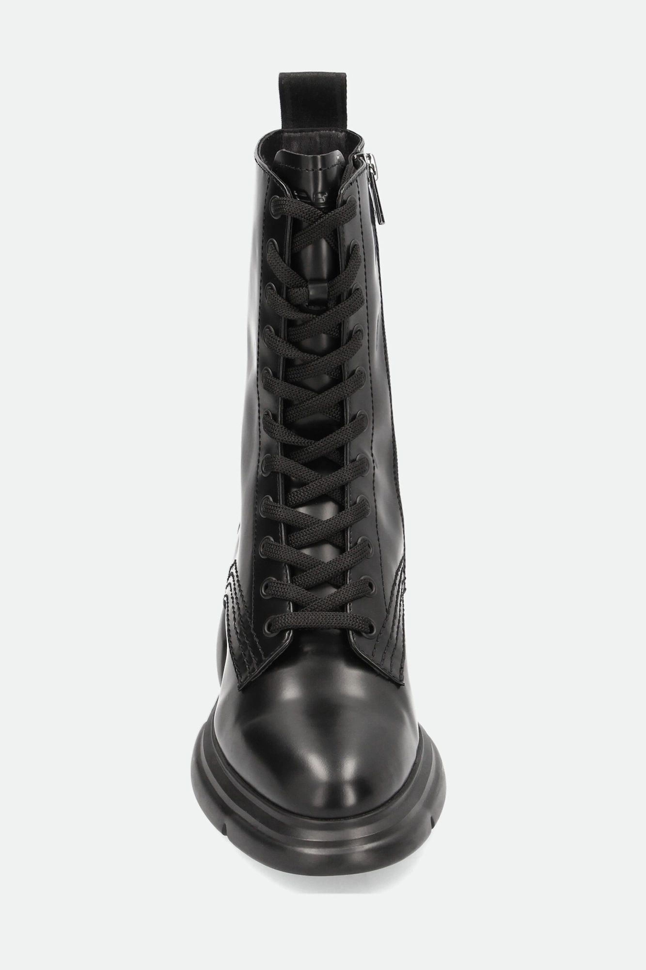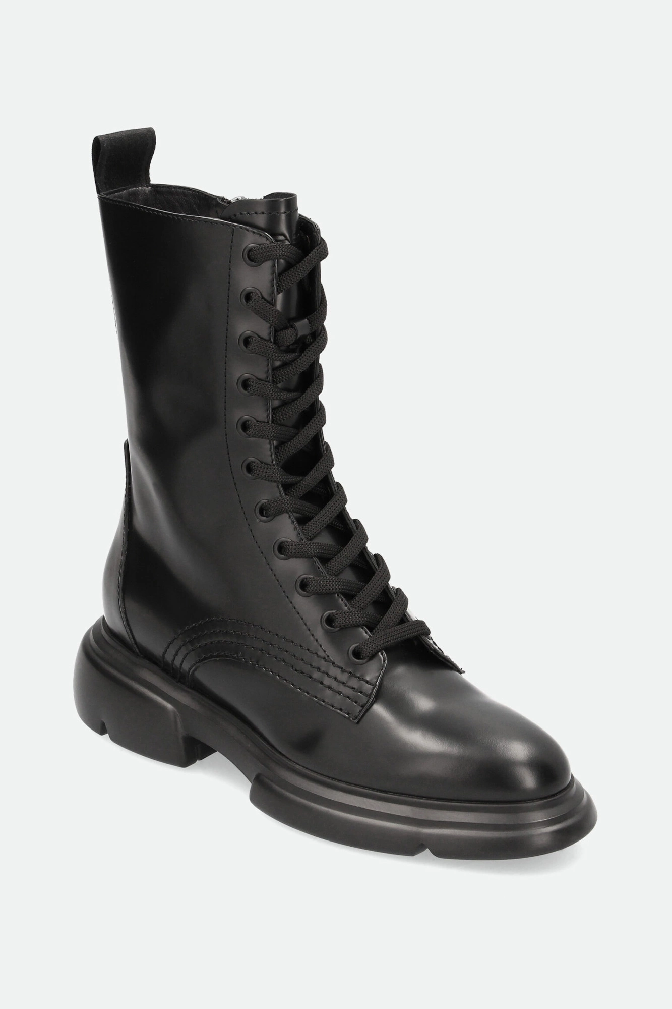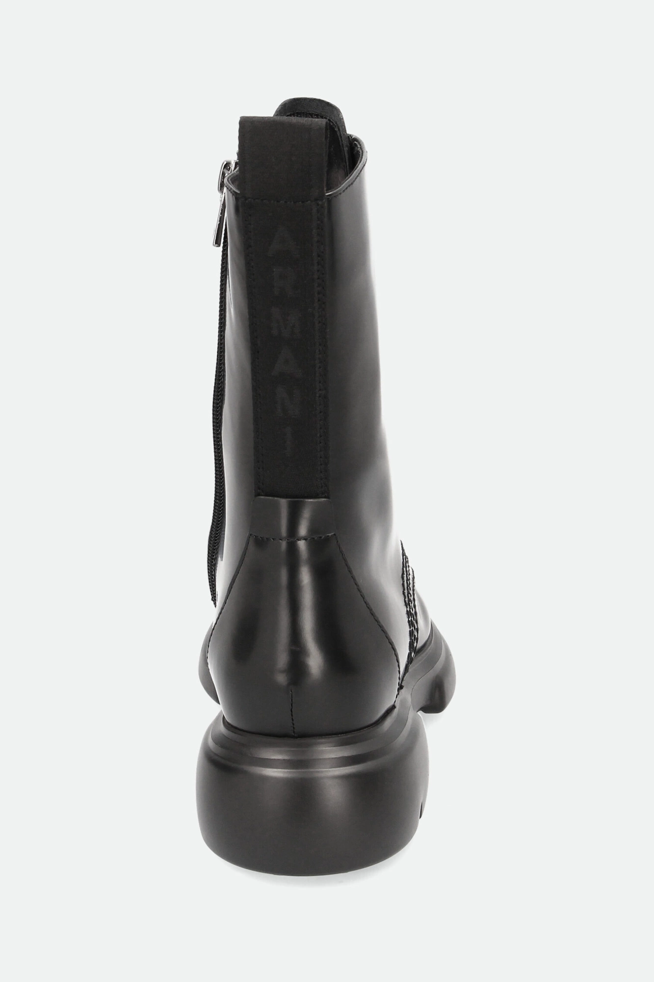 Trapery marki Emporio Armani w czarnym kolorze. Mocno zaokrąglony nosek. Po bokach zapinane na zamek błyskawiczny w czarnym kolorze. Z przodu wiązane za pomocą sznurówek. Na języku tłoczone logo marki. Z tyłu sygnowany pasek ułatwiający zakładanie butów. Wykonane z gładkiej, naturalnej skóry. Podeszwa wykonana w technologii XL EXTRALIGHT®, którą cechuje mała waga i wysoka amortyzacja.
