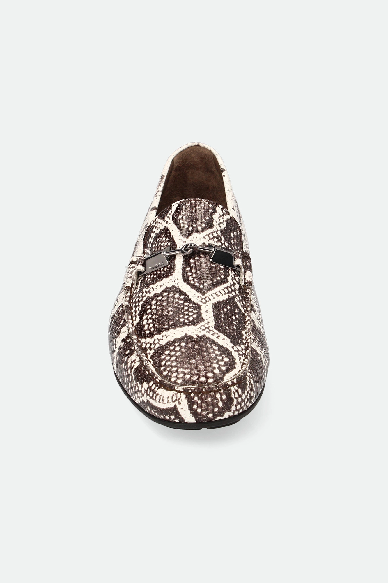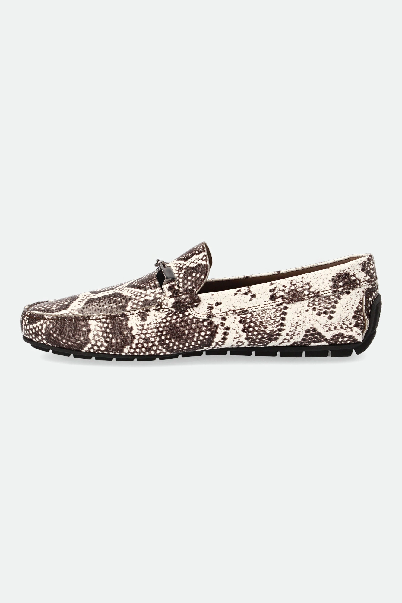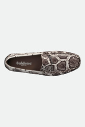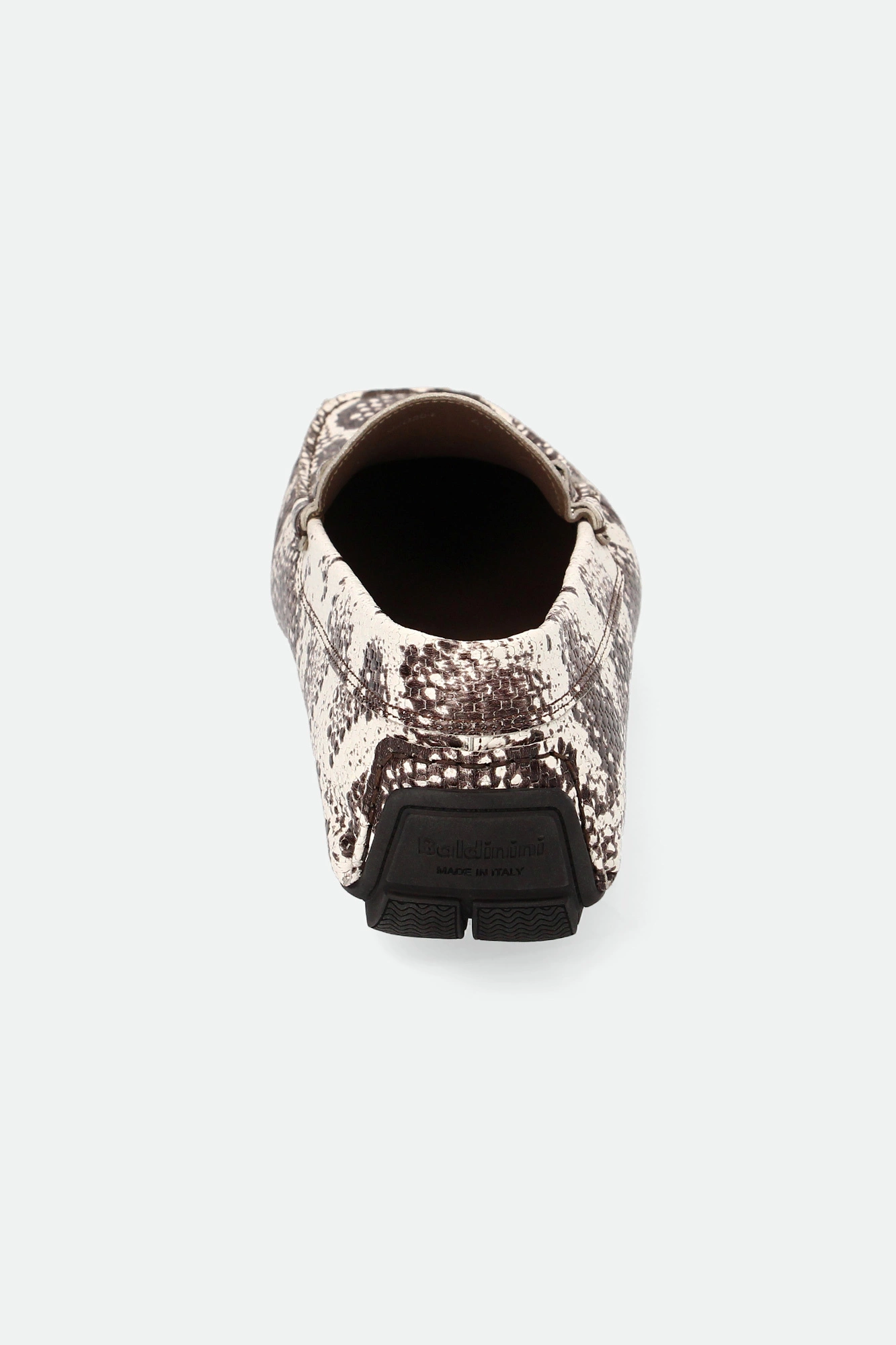 Designerskie mokasyny marki Baldinini wykonane ze skóry naturalnej. Na całości zwierzęcy motyw utrzymany w odcieniach brązu i bieli. Wnętrze w brązowym kolorze. Z przodu srebrna, metalowa i połyskująca klamra z logo marki. Od zewnętrznej strony nazwa marki wytłoczona w gumie. Doskonałe połączenie funkcjonalności i stylowego włoskiego designu.
