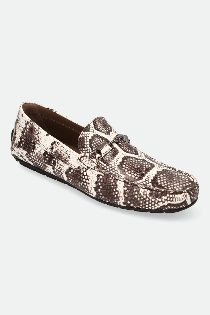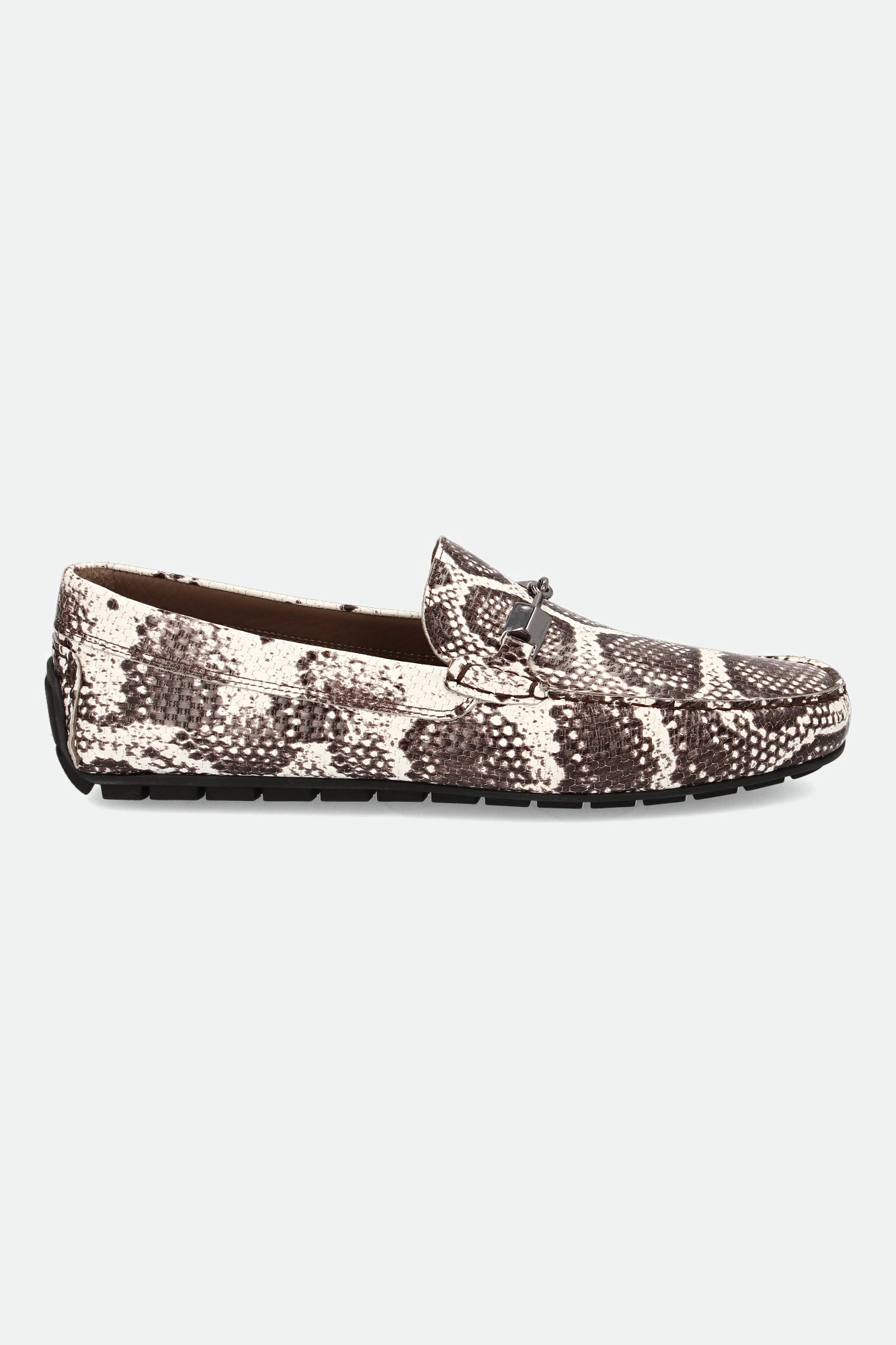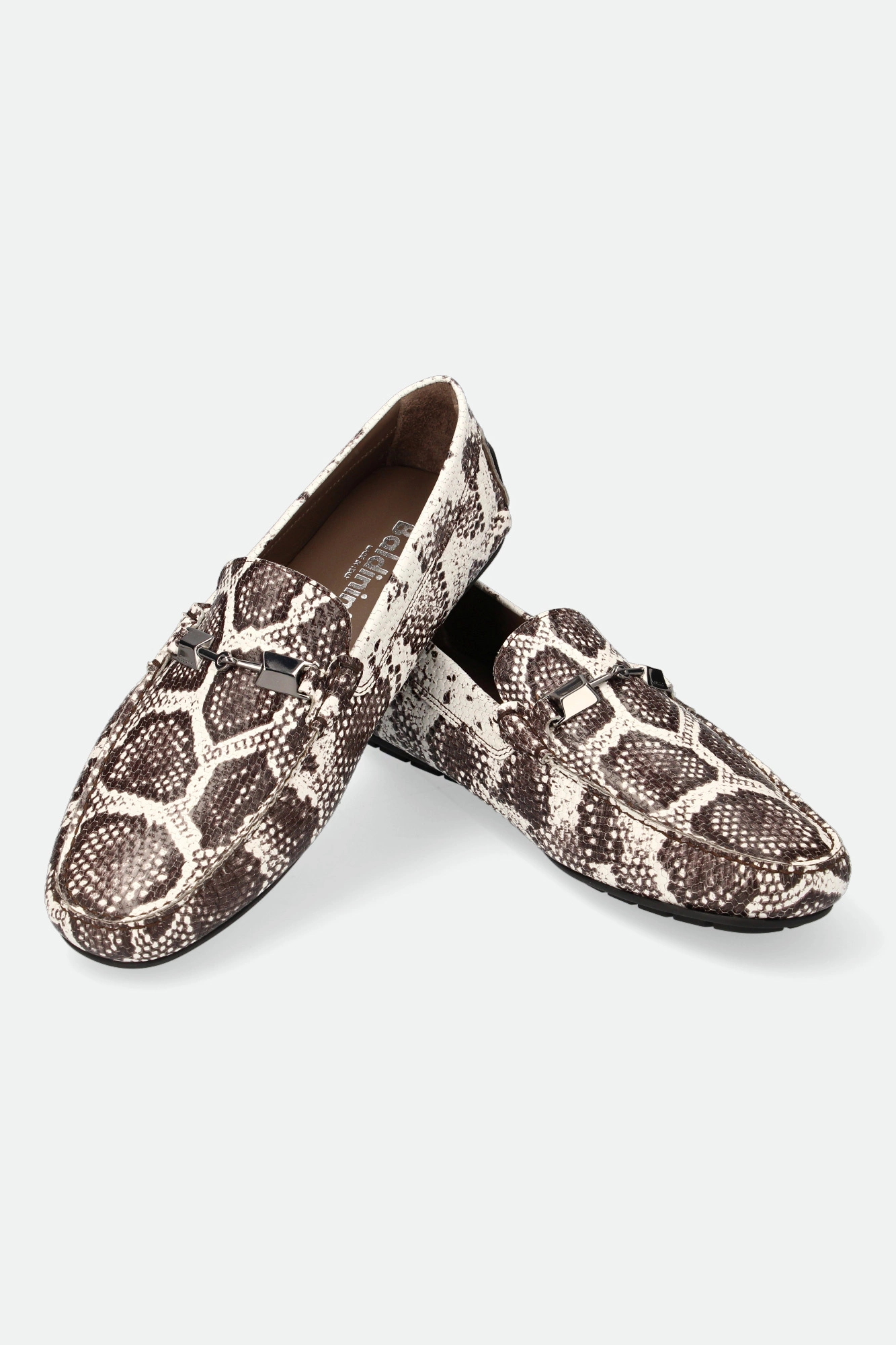 Designerskie mokasyny marki Baldinini wykonane ze skóry naturalnej. Na całości zwierzęcy motyw utrzymany w odcieniach brązu i bieli. Wnętrze w brązowym kolorze. Z przodu srebrna, metalowa i połyskująca klamra z logo marki. Od zewnętrznej strony nazwa marki wytłoczona w gumie. Doskonałe połączenie funkcjonalności i stylowego włoskiego designu.