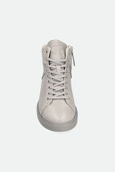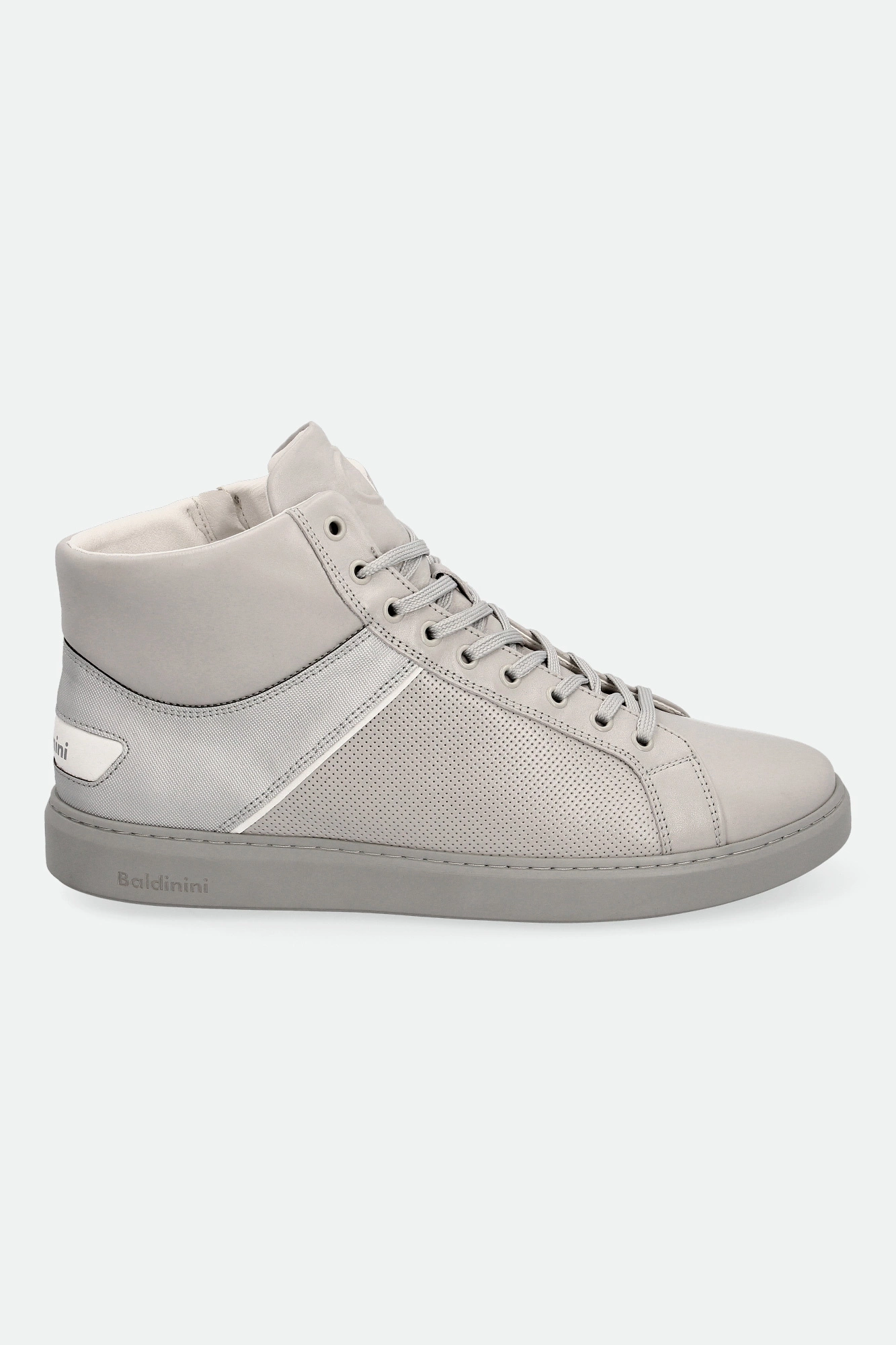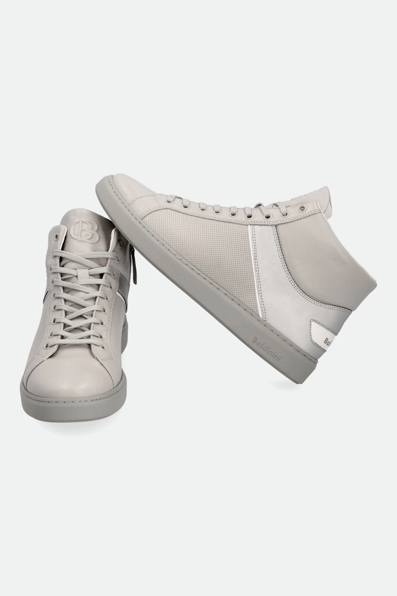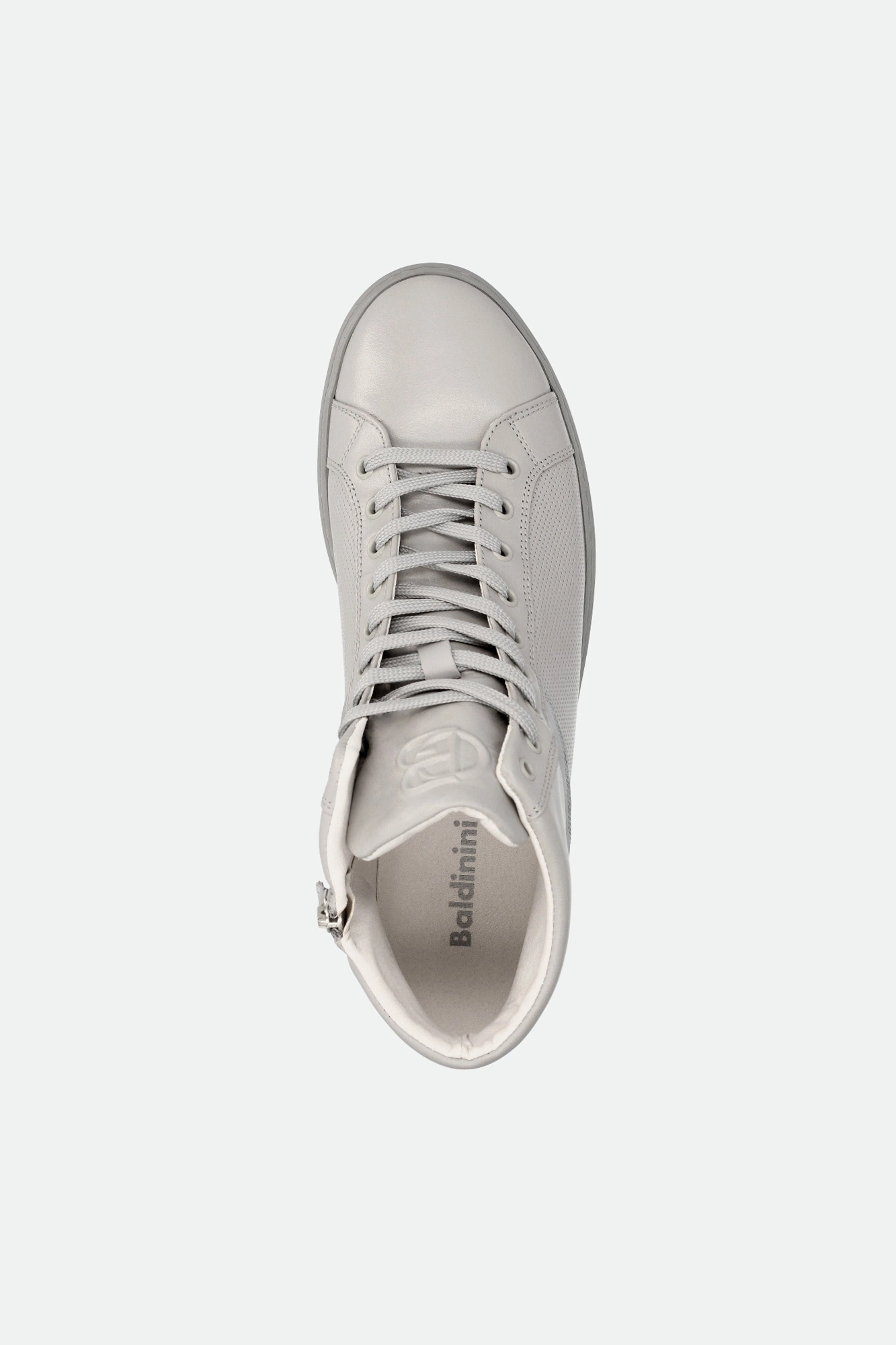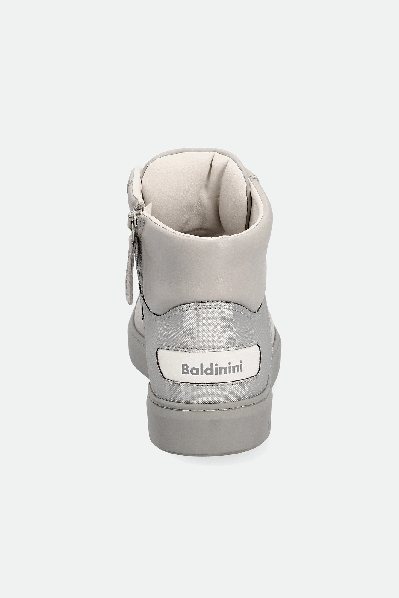 Wysokie sneakersy marki Baldinini w szarym kolorze. Lekko zaokrąglony nosek. Na całości przeszycia. Po bokach fragmenty skóry strukturalnej oraz wstawki ze skóry w białym kolorze oraz z tyłu z nadrukowaną nazwą marki. Na języku tłoczone logo marki. Wiązane za pomocą sznurówek w szarym kolorze. Od wewnętrznej strony zapinane na zamek. Wyściółka sygnowana w białym kolorze. Podeszwa z tłoczoną nazwą marki w czarnym kolorze. Wykonane ze skóry naturalnej.
