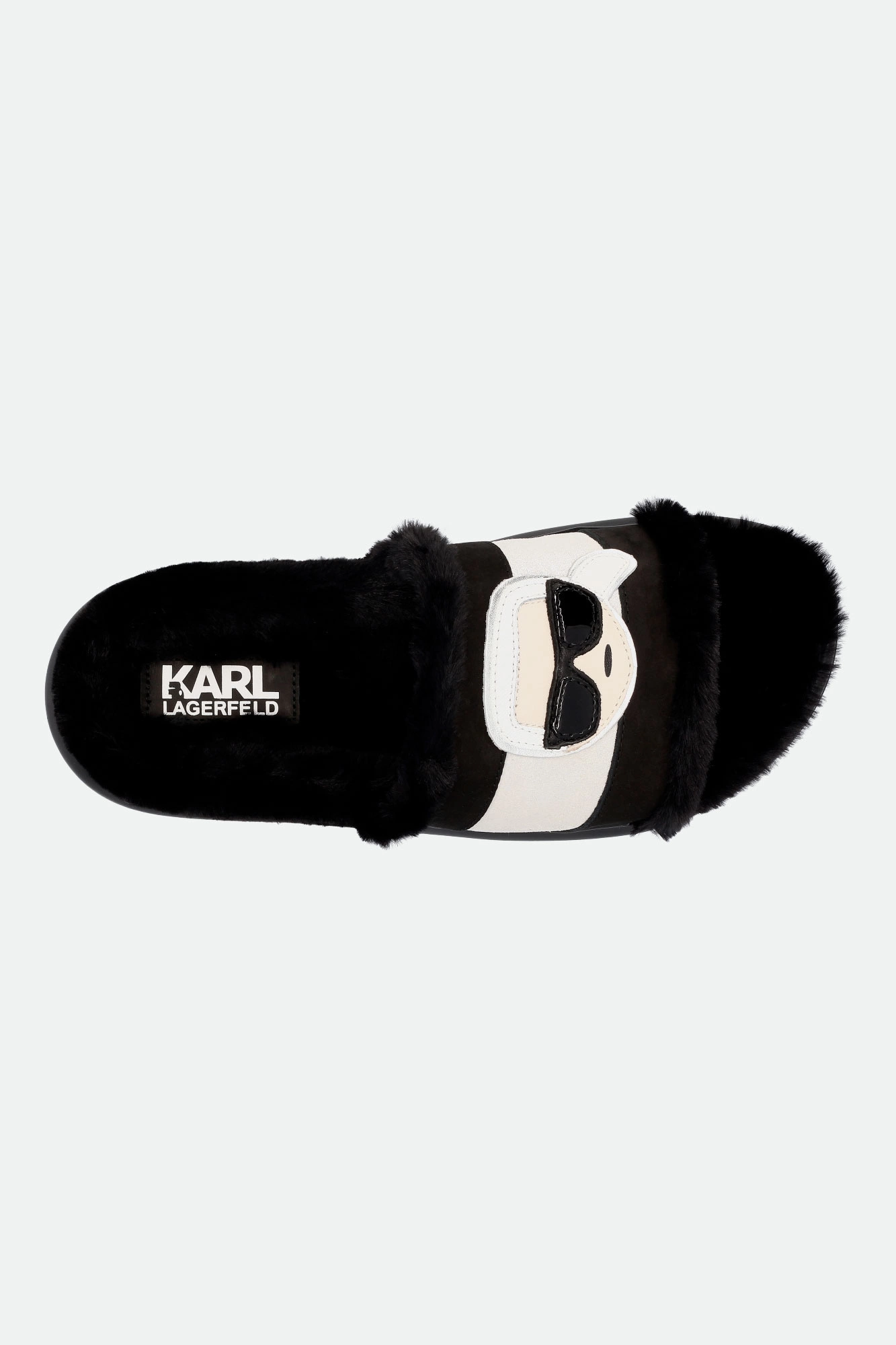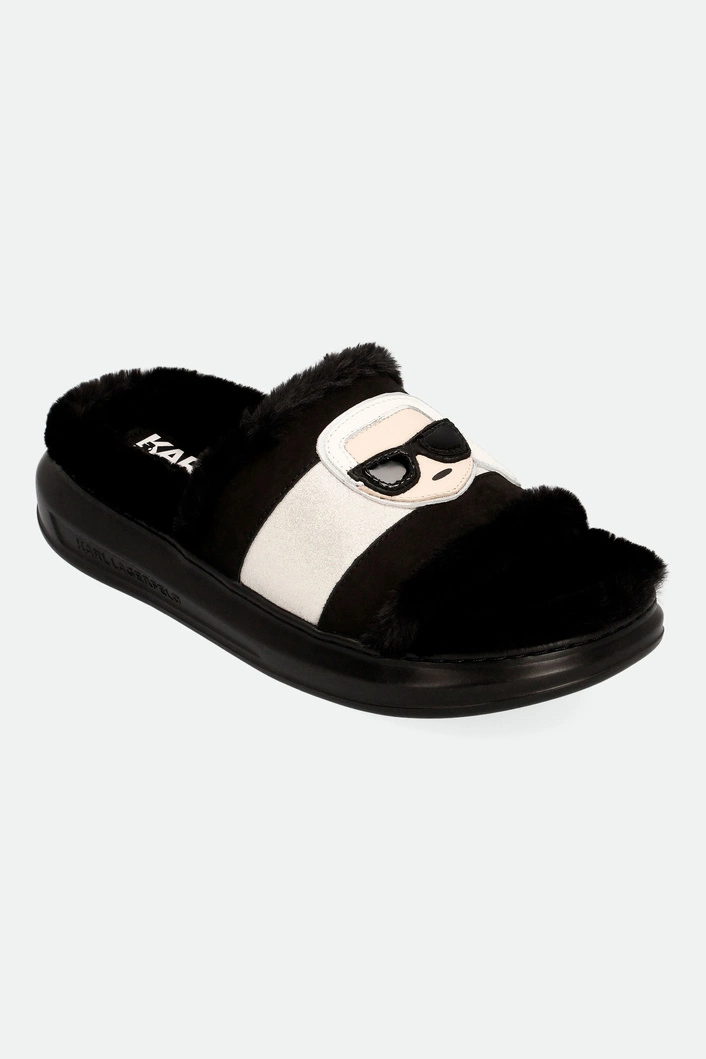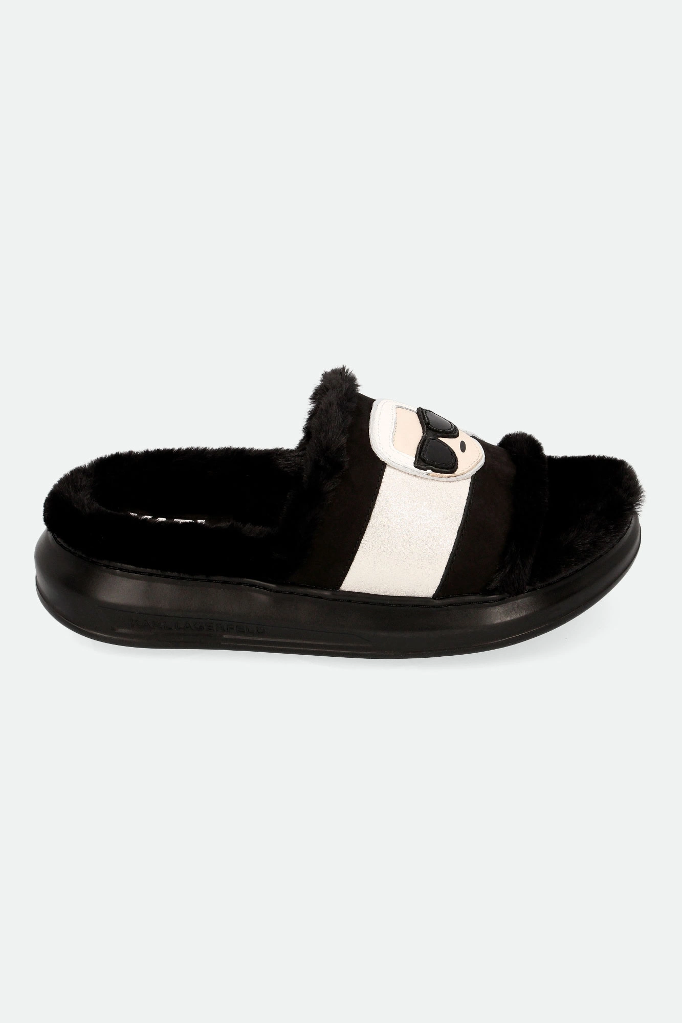 Klapki marki Karl Lagerfeld w czarnym kolorze. Z przodu szeroki, dwukolorowy pasek z dużą naszywką z wizerunkiem założyciela marki. Wyprofilowana, sygnowana wkładka i pasek wykończone miękkim futerkiem. Wyższa, sygnowana podeszwa. Klapki wykonane ze skóry naturalnej i sztucznego futerka.