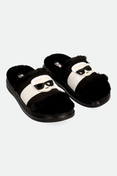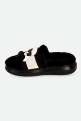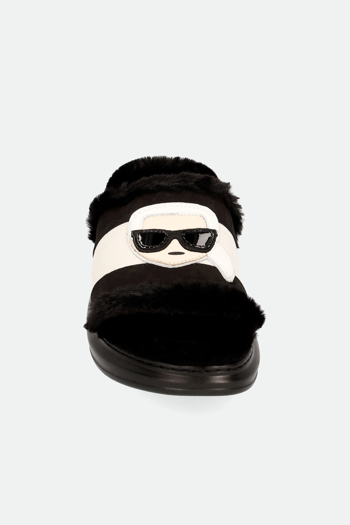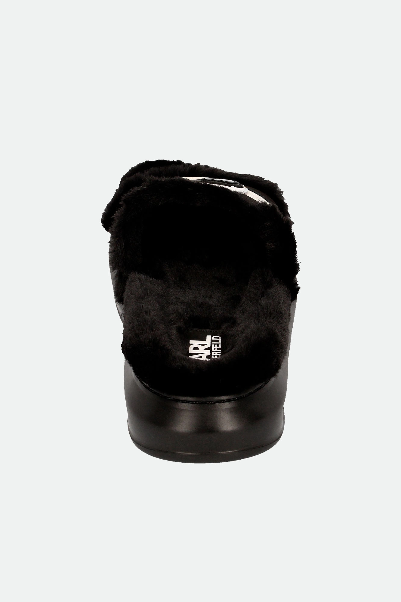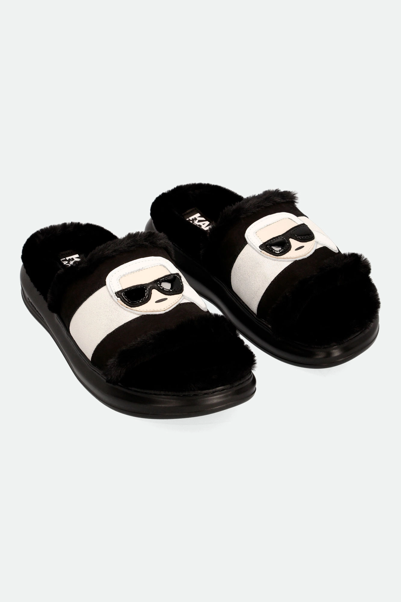 Klapki marki Karl Lagerfeld w czarnym kolorze. Z przodu szeroki, dwukolorowy pasek z dużą naszywką z wizerunkiem założyciela marki. Wyprofilowana, sygnowana wkładka i pasek wykończone miękkim futerkiem. Wyższa, sygnowana podeszwa. Klapki wykonane ze skóry naturalnej i sztucznego futerka.