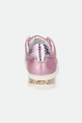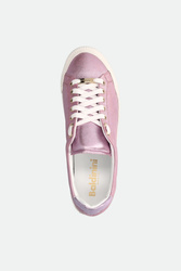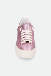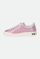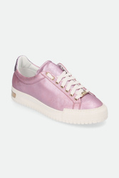 Sneakersy marki Baldinini w fiołkowym kolorze. Całość wykonana z połyskującej naturalnej skóry. Lekko zaokrąglony nosek. Wiązane na sznurówki w kontrastowym, białym kolorze. Z tyłu wstawka skóry z tłoczonym wzorem imitującym skórę krokodyla i metalowa aplikacja z tłoczonym logo marki. Wewnątrz biała, sygnowana wyściółka.