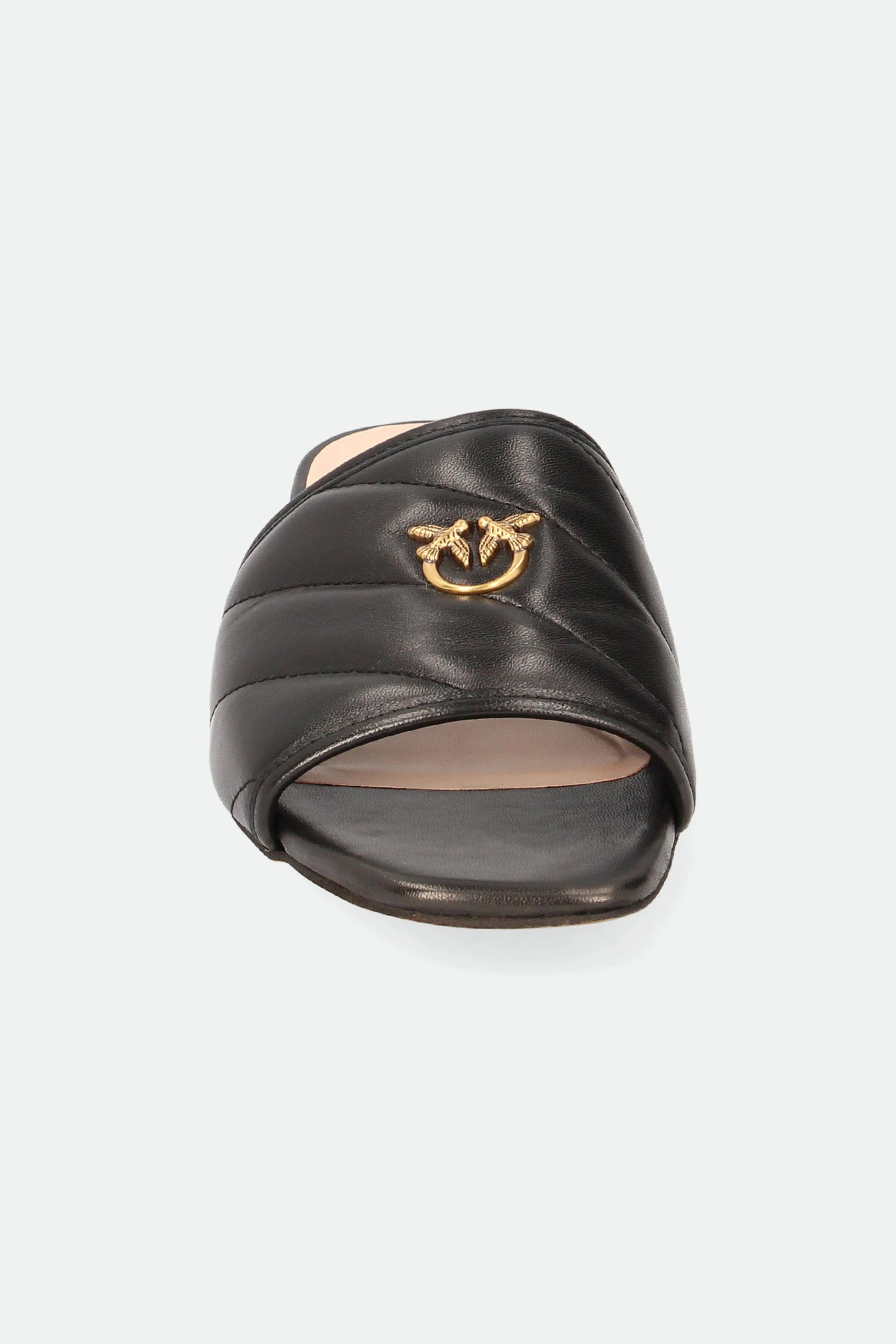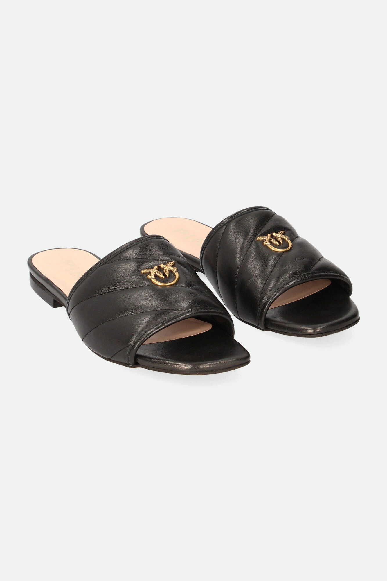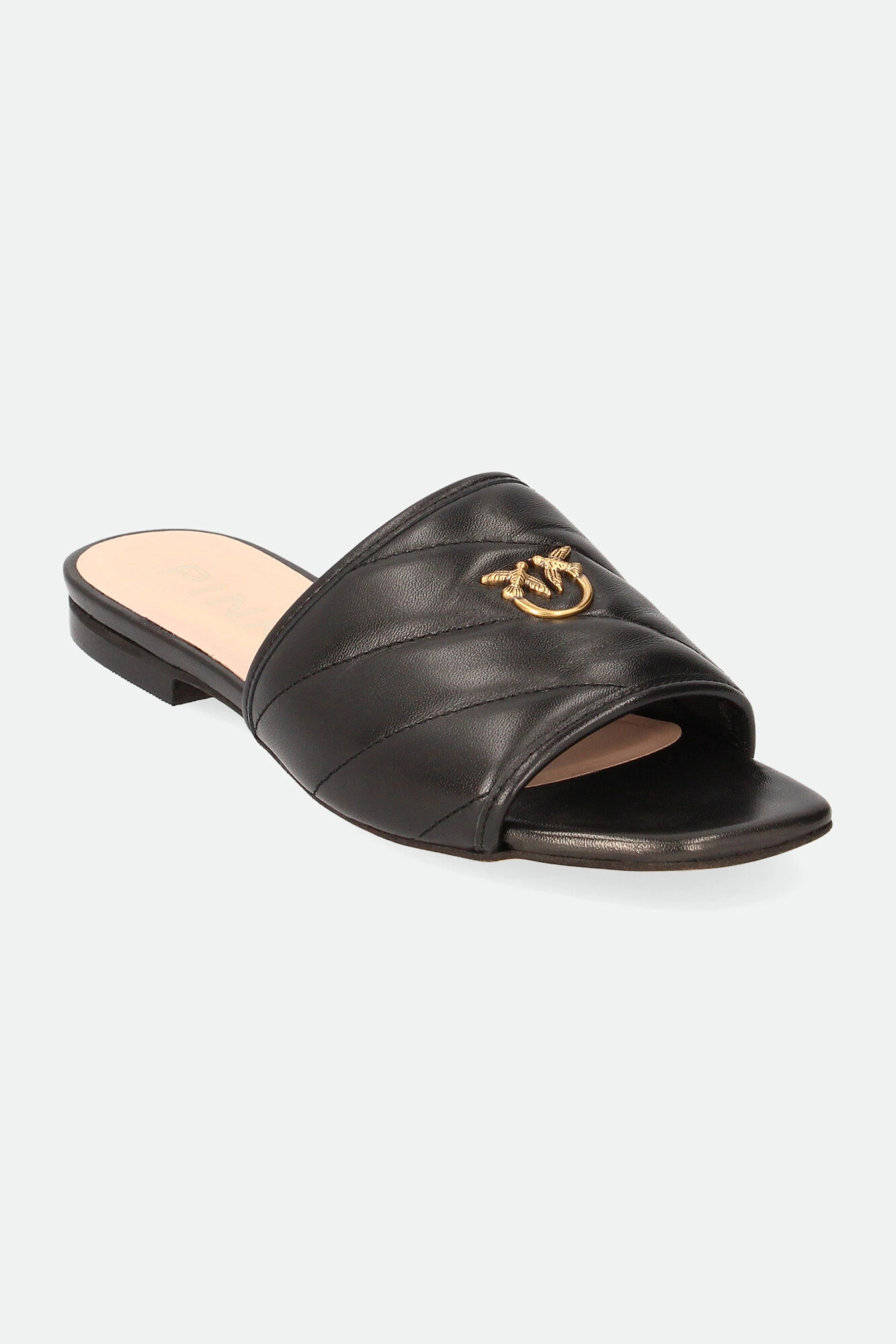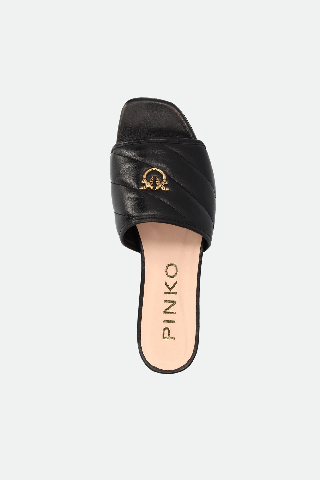 Klapki marki Pinko w czarnym kolorze. Z przodu szeroki pas z przeszyciami i pikowaniem, na nim metalowa aplikacja z logo marki w złotym kolorze. Sygnowana wyściółka. Wykonane z naturalnej skóry.