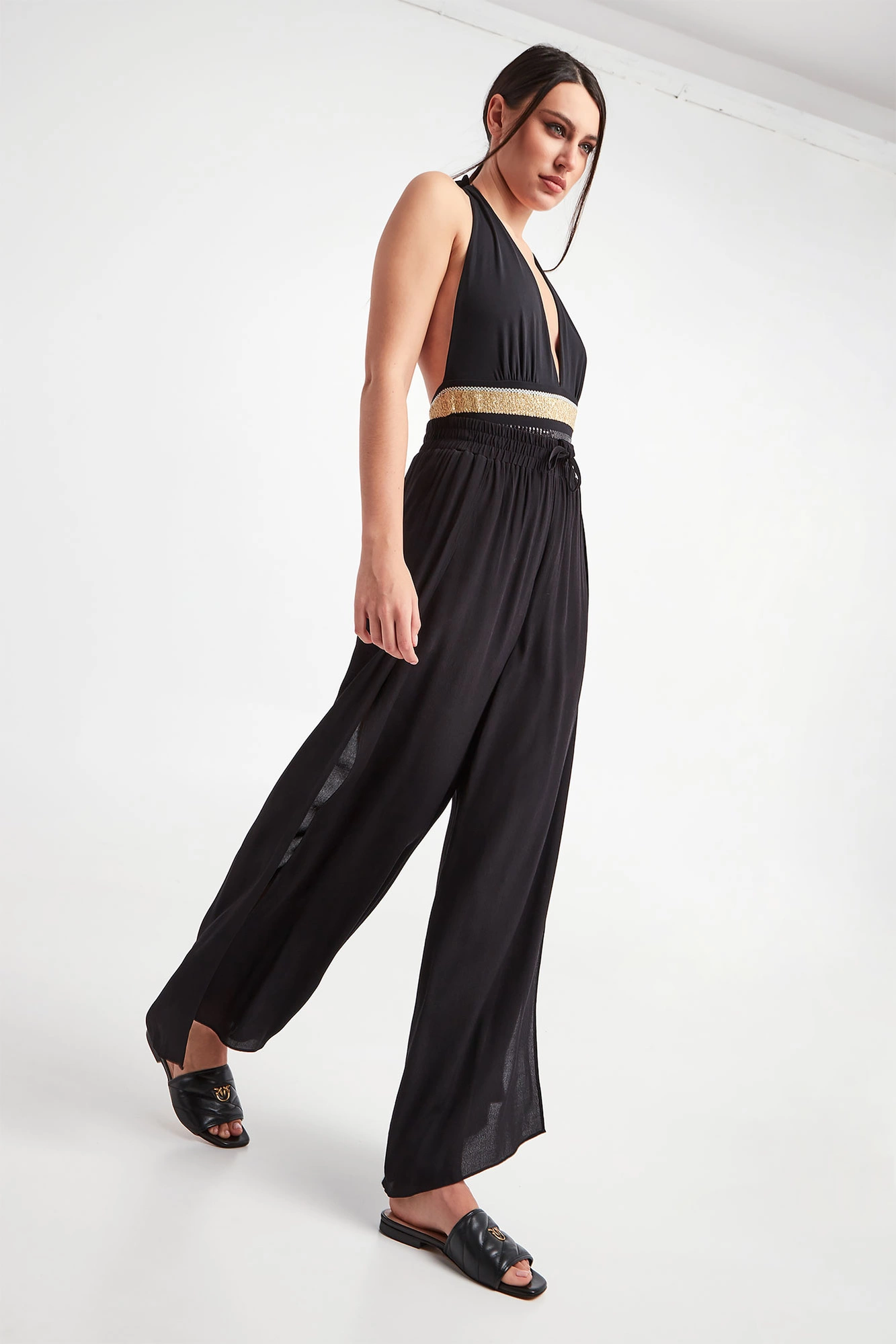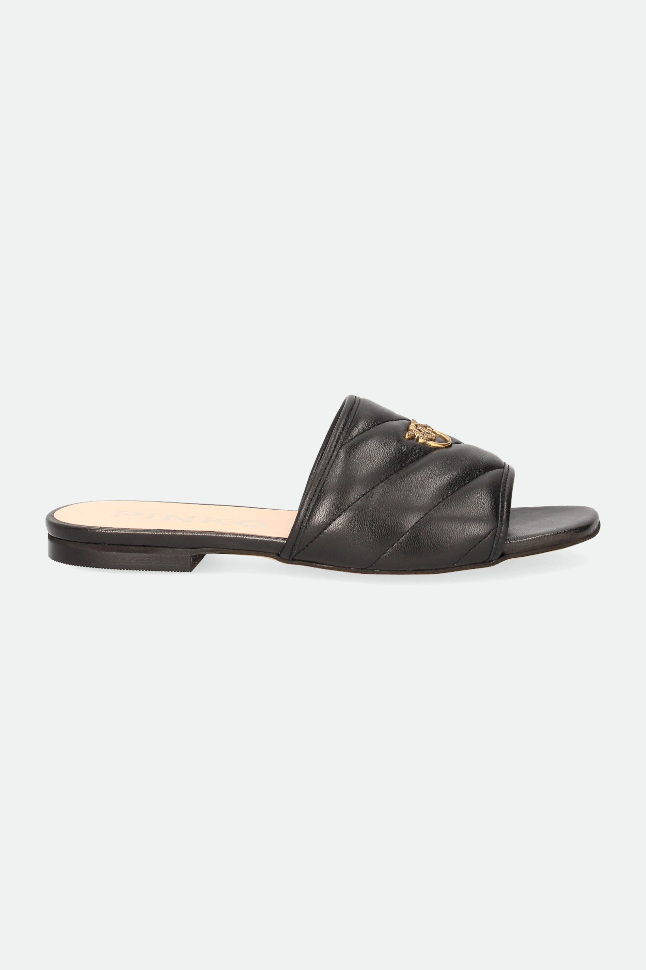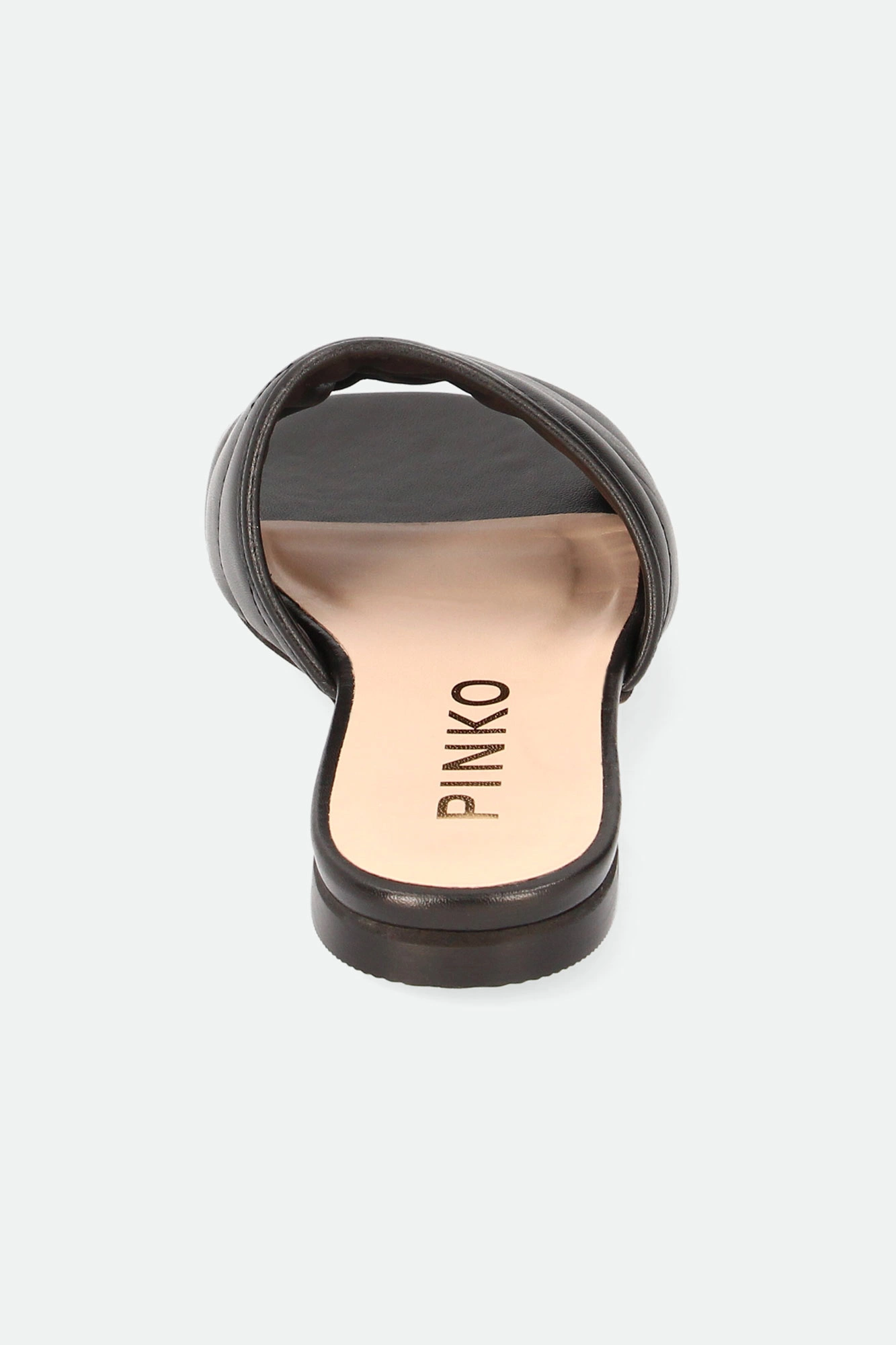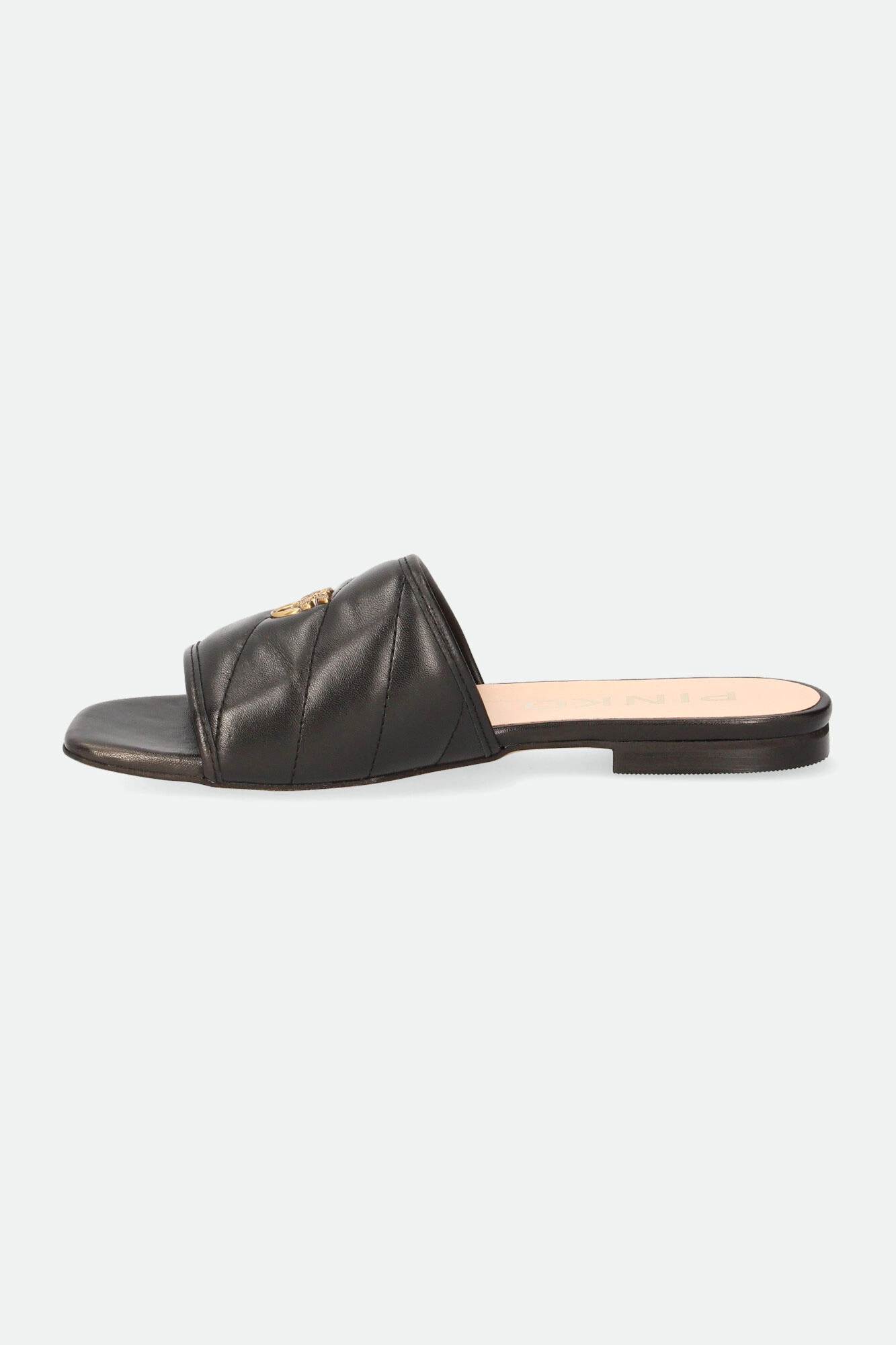 Klapki marki Pinko w czarnym kolorze. Z przodu szeroki pas z przeszyciami i pikowaniem, na nim metalowa aplikacja z logo marki w złotym kolorze. Sygnowana wyściółka. Wykonane z naturalnej skóry.