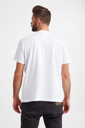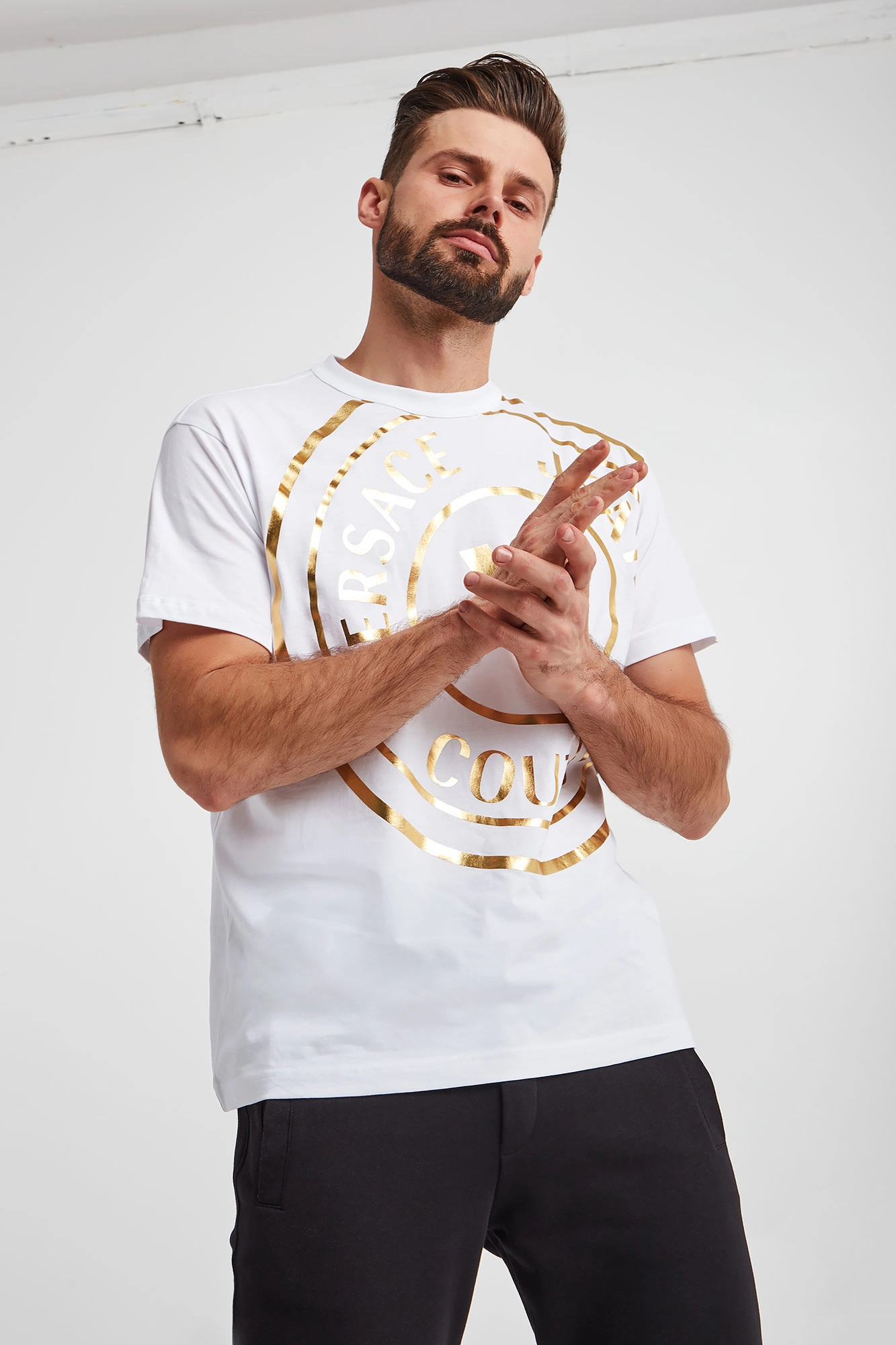 Biały t-shirt marki Versace Jeans Couture. Krój regular fit. Z przodu duży, złoty nadruk w postaci logo marki. Dekolt typu o-neck zakończony ściągaczem. Krótkie rękawy oraz dół wykończone lamówką. Wykonany z czystej, przyjemnej w dotyku bawełny.