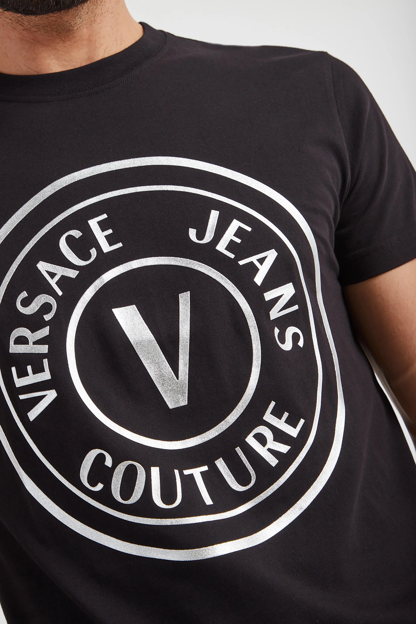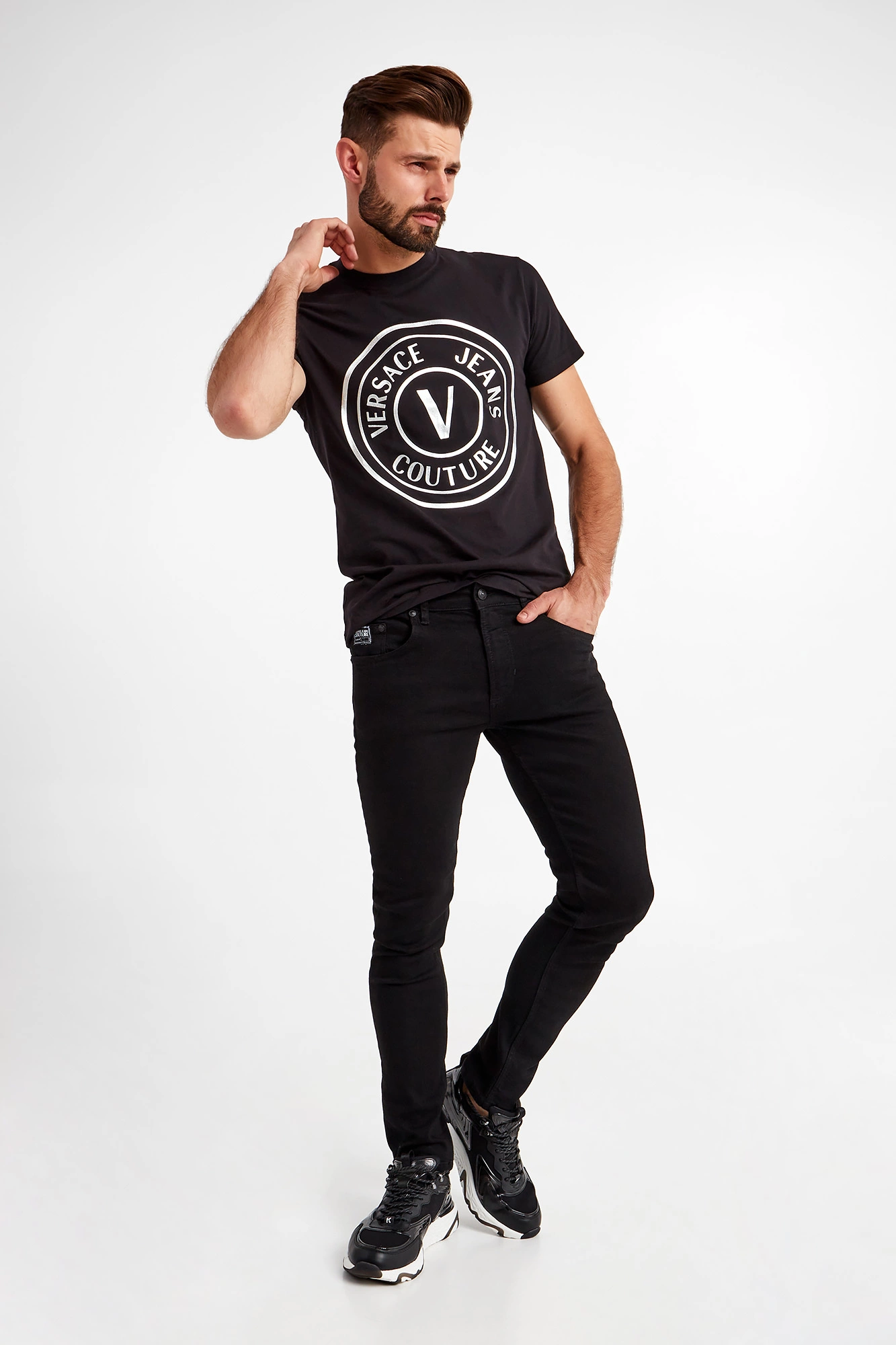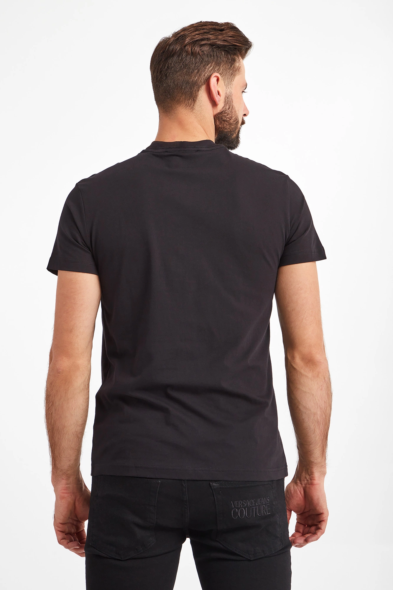 T-shirt w czarnym kolorze. Fason slim fit. Dekolt typu o-neck wykończony ściągaczem. Rękawy i dół wykończone lamówką. Z przodu srebrny nadruk z logo i z nazwą marki. T-shirt w całości wykonany z bawełny. Wygodny i elastyczny.