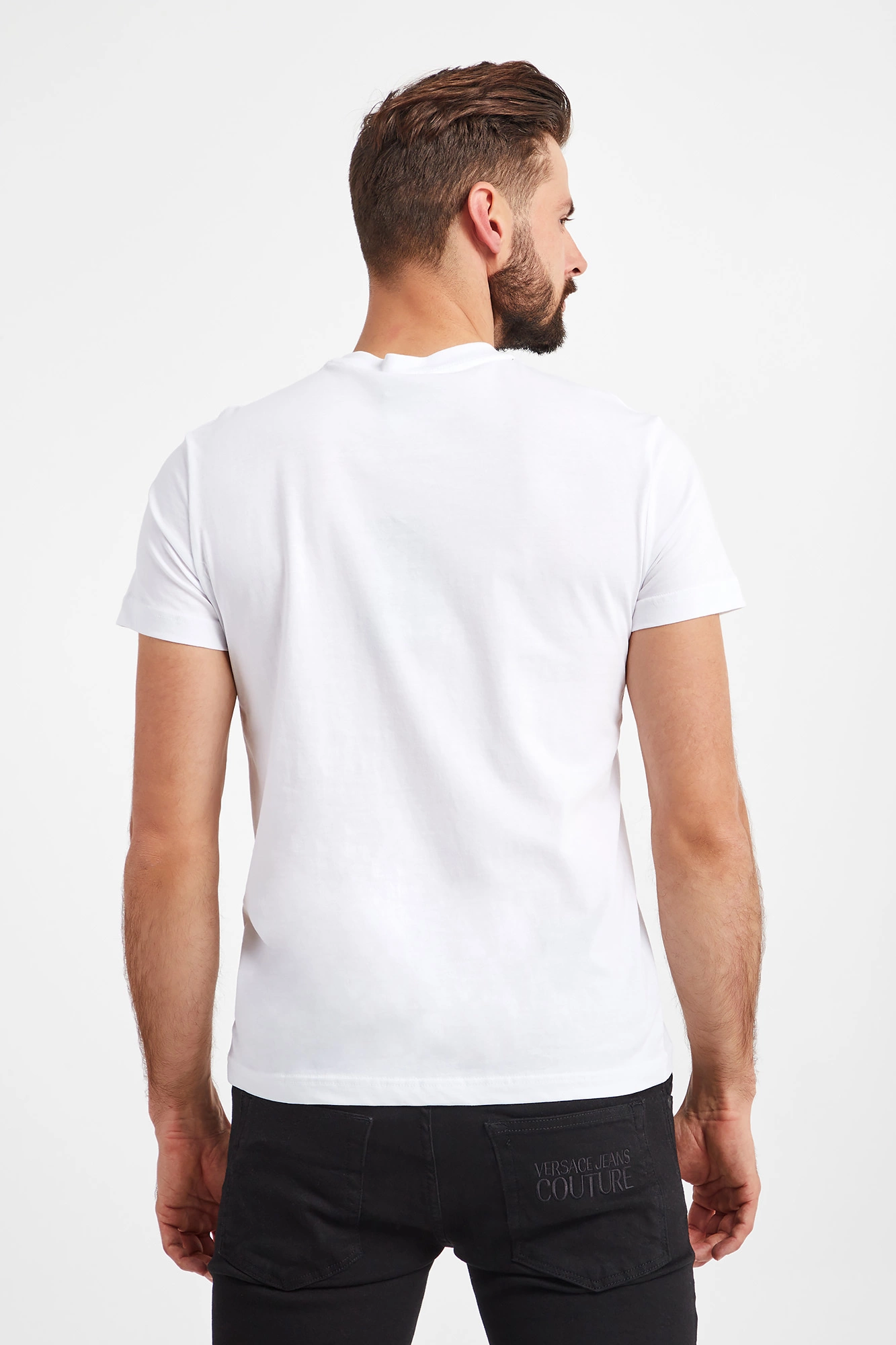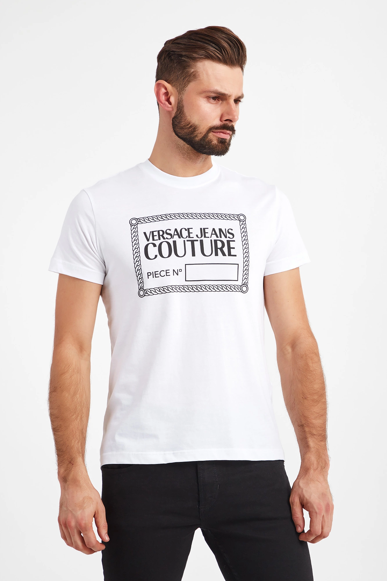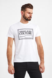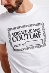 T-shirt marki Versace Jeans Couture w białym kolorze. Dopasowany fason slim fit. Z przodu czarny, kontrastujący, gumowy nadruk z nazwą marki. Dekolt typu o-neck zakończony ściągaczem. Krótkie rękawy oraz dół wykończone lamówką. Wykonany z czystej bawełny.