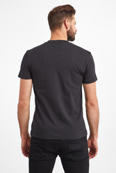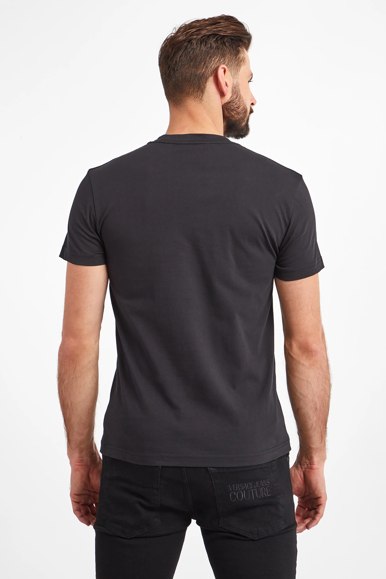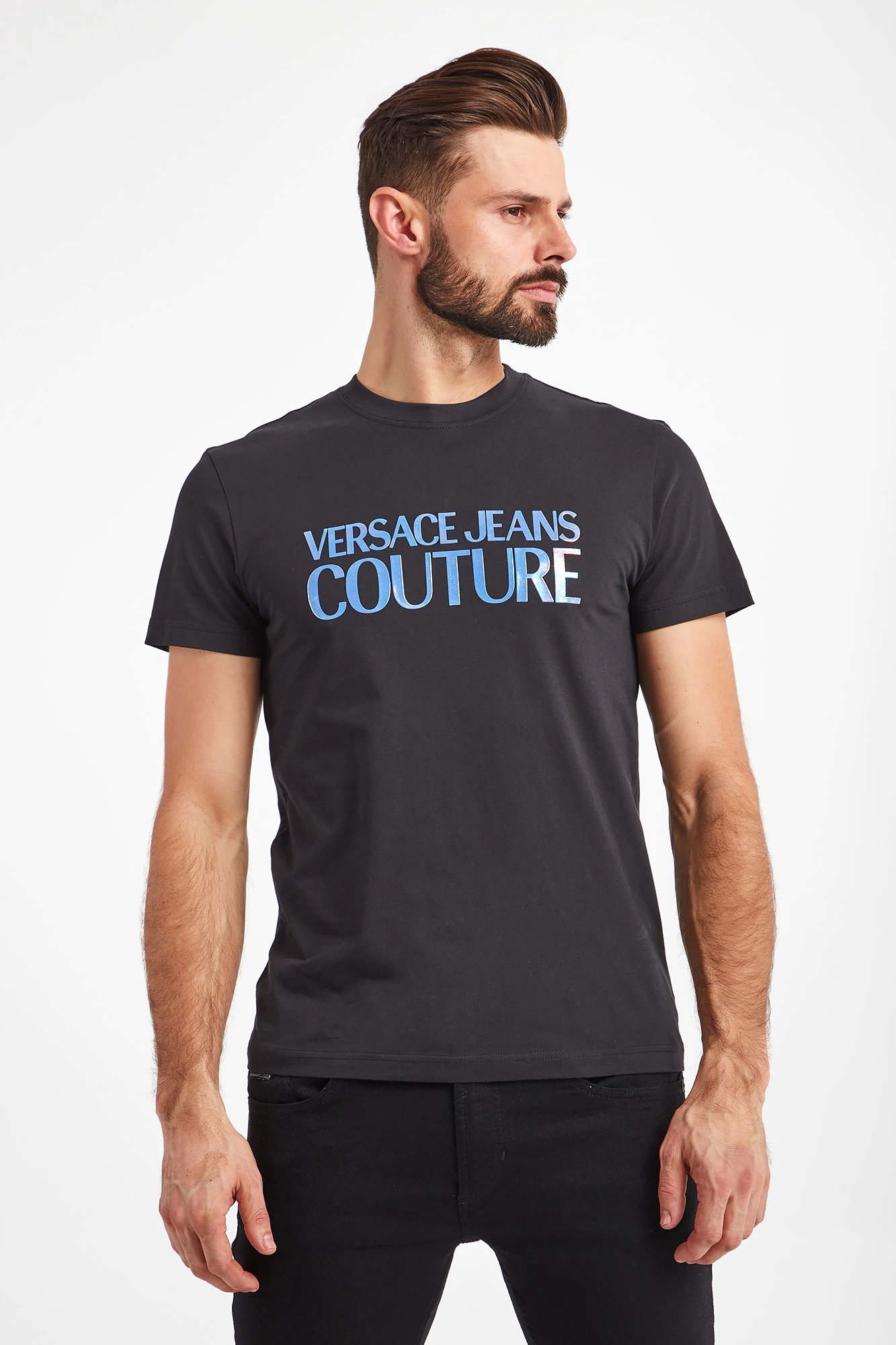 T-shirt marki Versace Jeans Couture w czarnym kolorze. Dopasowany fason slim fit. Z przodu opalizujący nadruk z nazwą marki. Dekolt typu o-neck zakończony ściągaczem. Krótkie rękawy oraz dół wykończone lamówką. Wykonany z bardzo miękkiej, czystej bawełny.