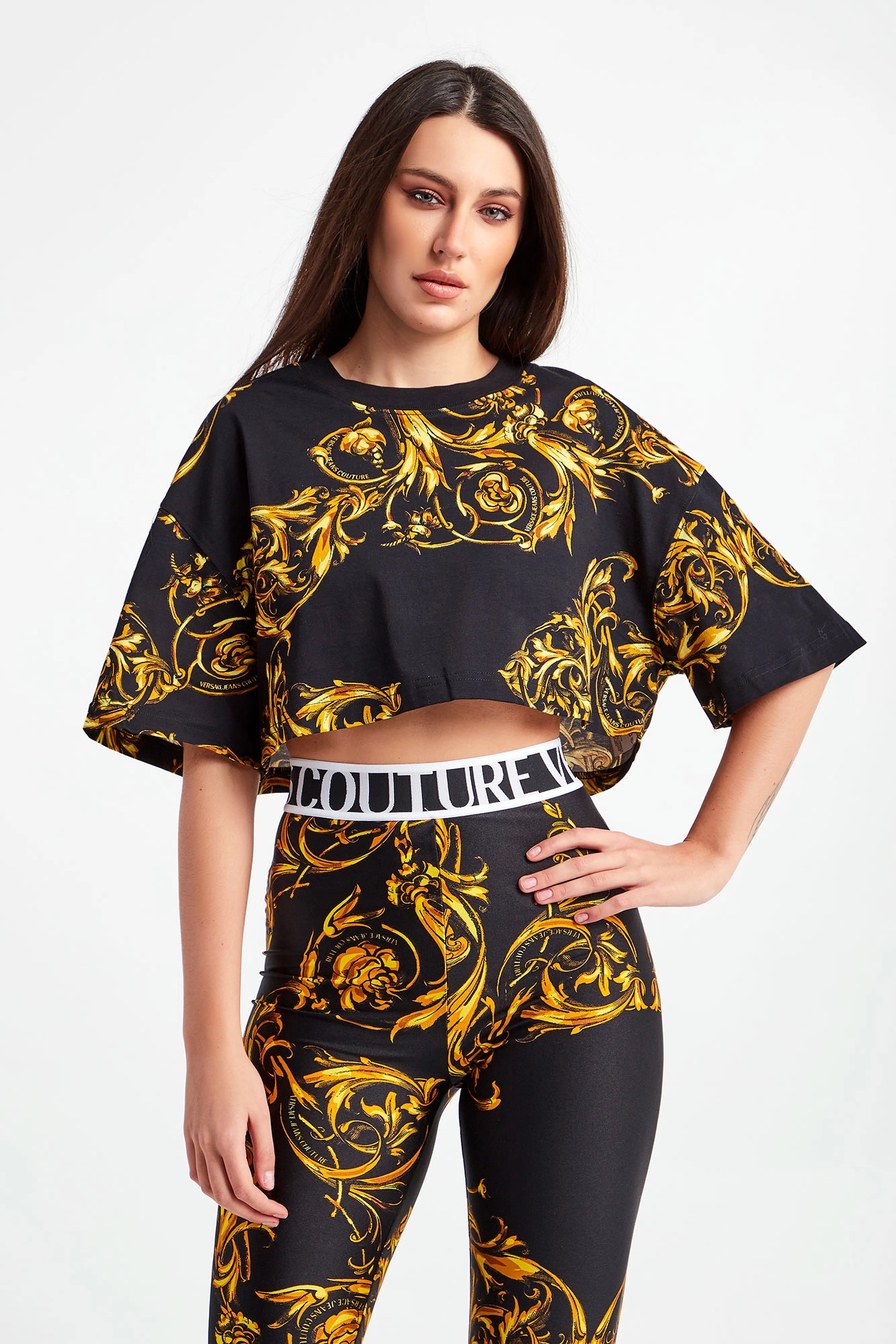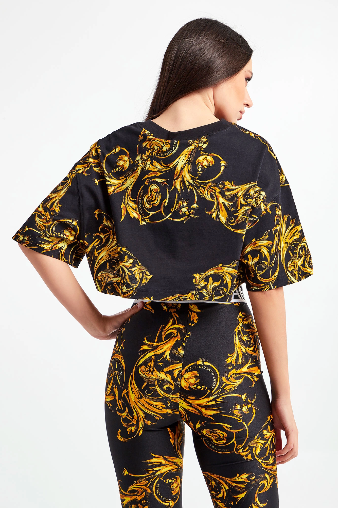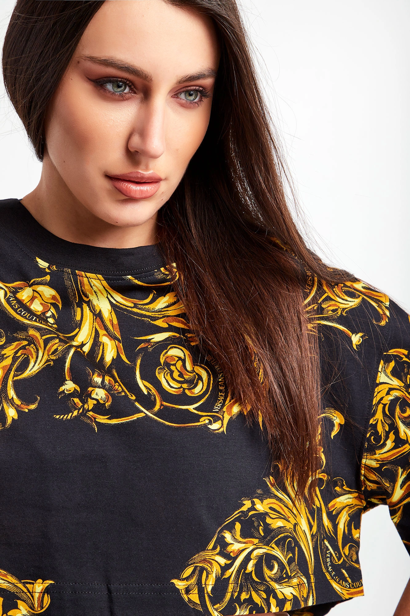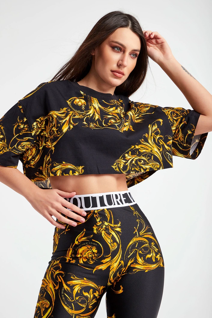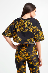 T-shirt marki Versace Jeans Couture w czarnym kolorze. Luźny fason typu cropped. Na całości charakterystyczny dla marki barokowy wzór w złotym kolorze. Krótkie rękawy i dół wykończone przeszyciem. Okrągły dekolt typu o-neck wykończony elastycznym ściągaczem. Wykonany z czystej bawełny o grubym splocie.