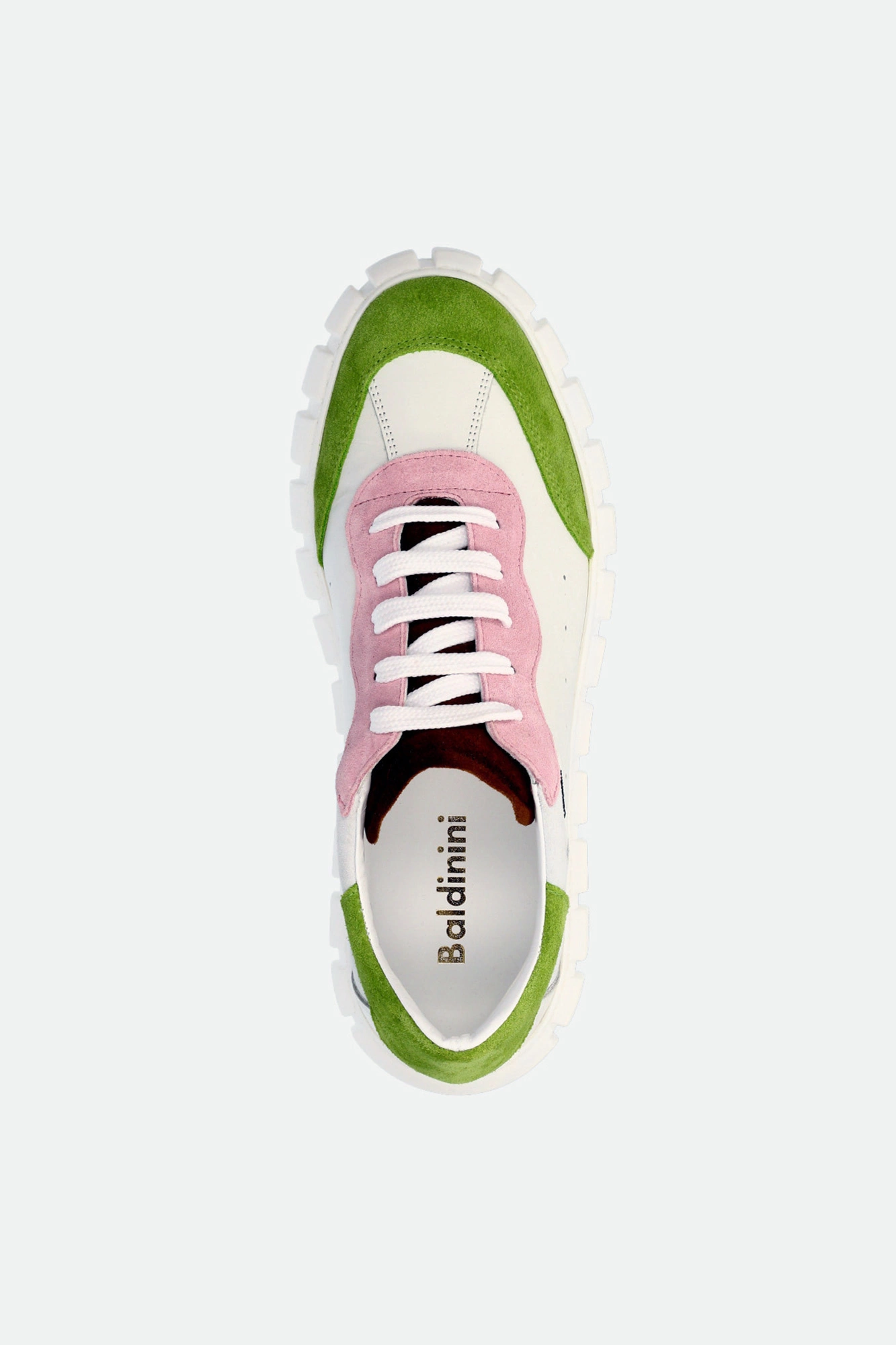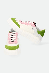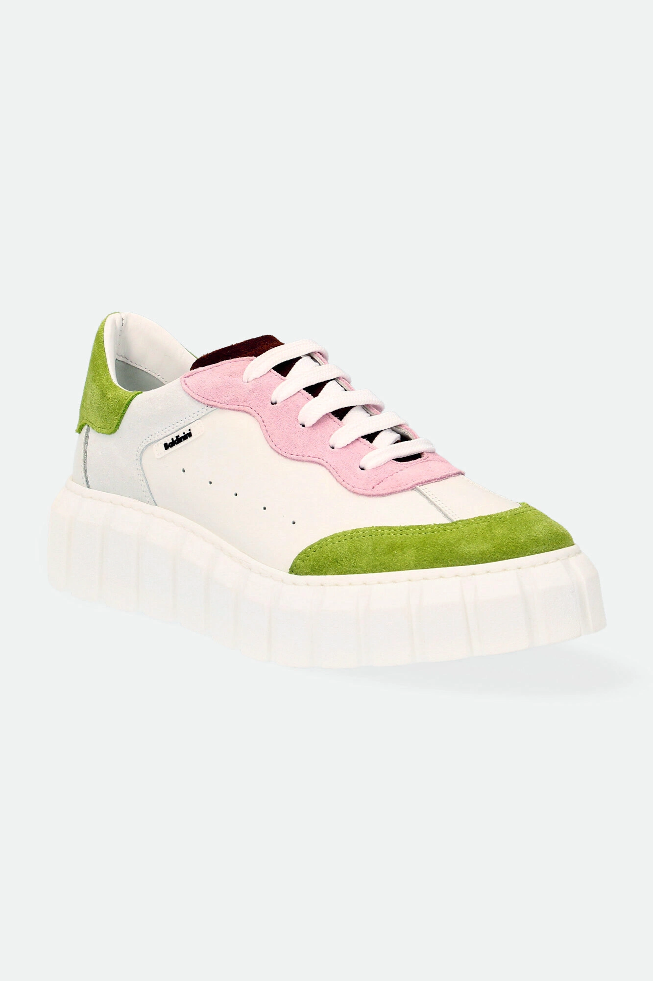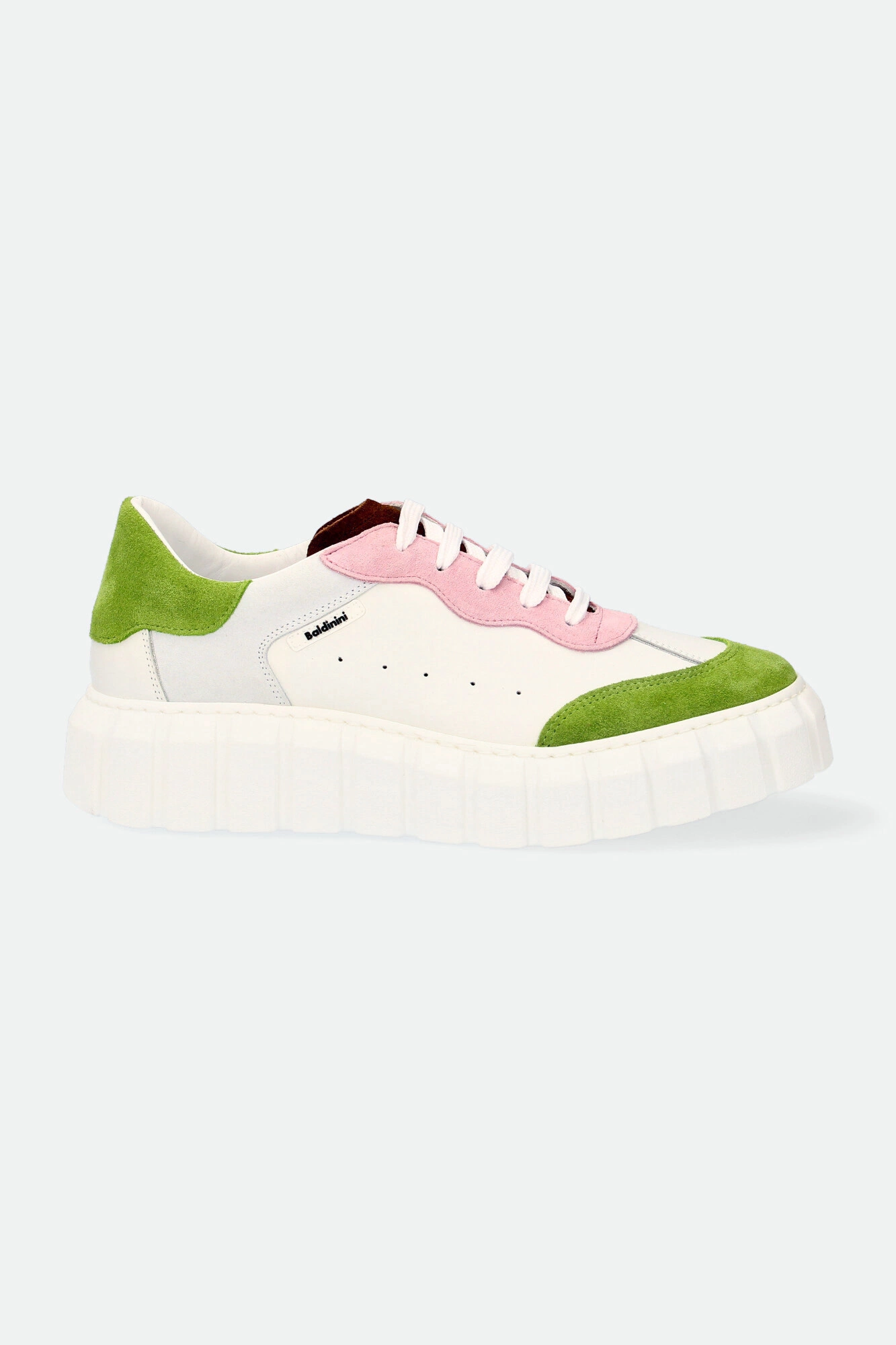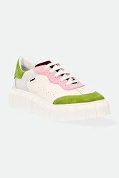 Sneakersy Baldinini w białym kolorze. Zaokrąglony nosek. Na całości wstawki zamszowej skóry w kilku kolorach. wiązane za pomocą sznurówek. Wyściółka sygnowana. Po boku naszywka z nazwą marki i ozdobne dziurki. Nowoczesna, wyższa podeszwa z ozdobnymi tłoczeniami. Wykonane z naturalnej skóry.