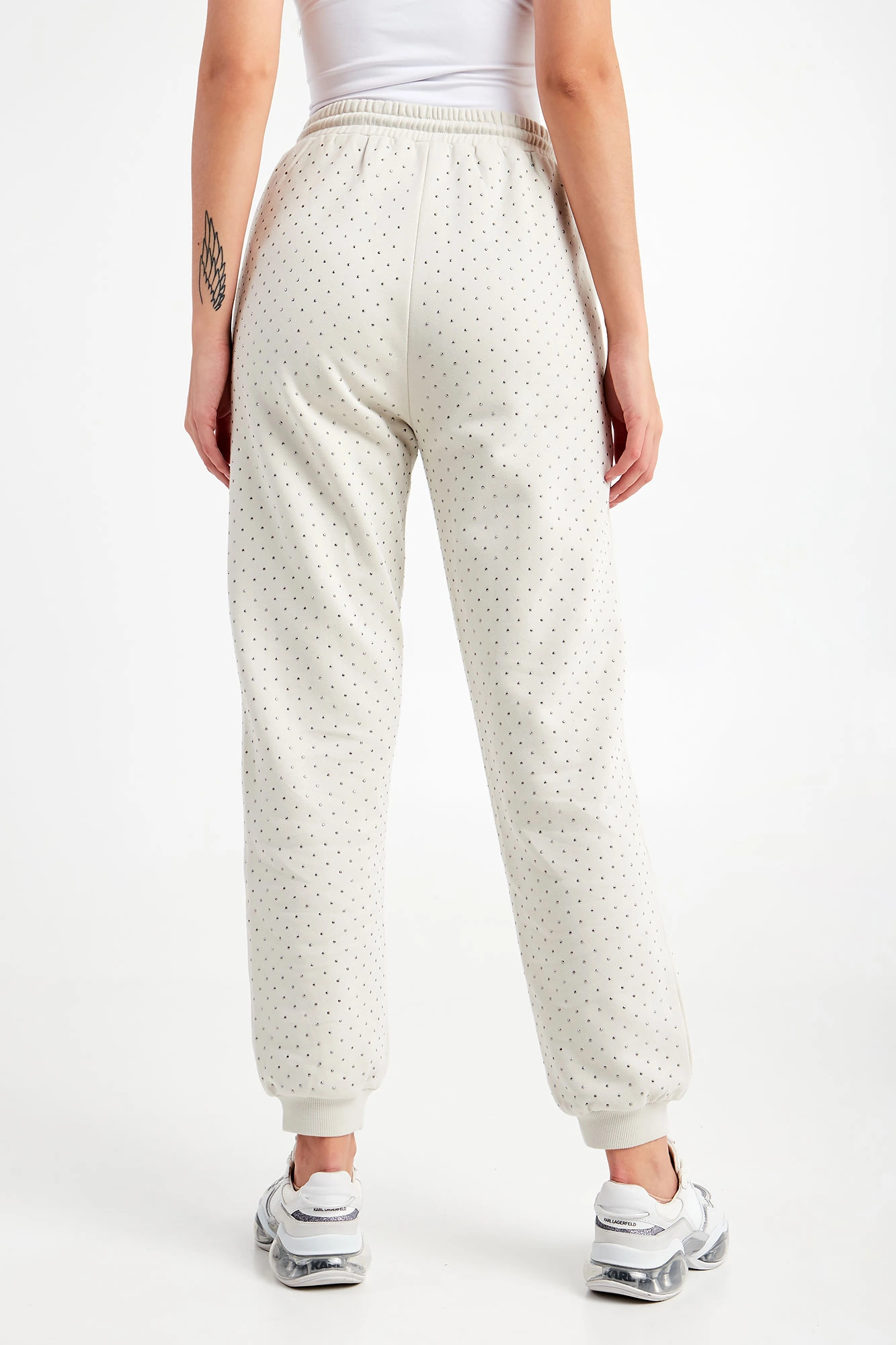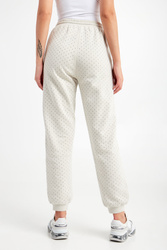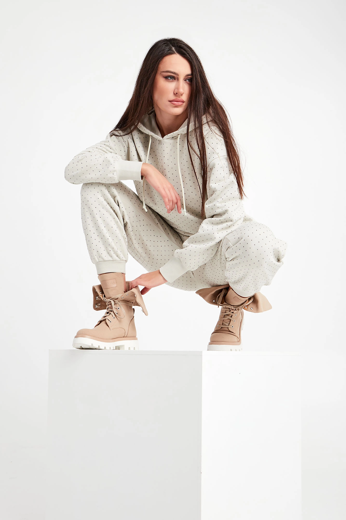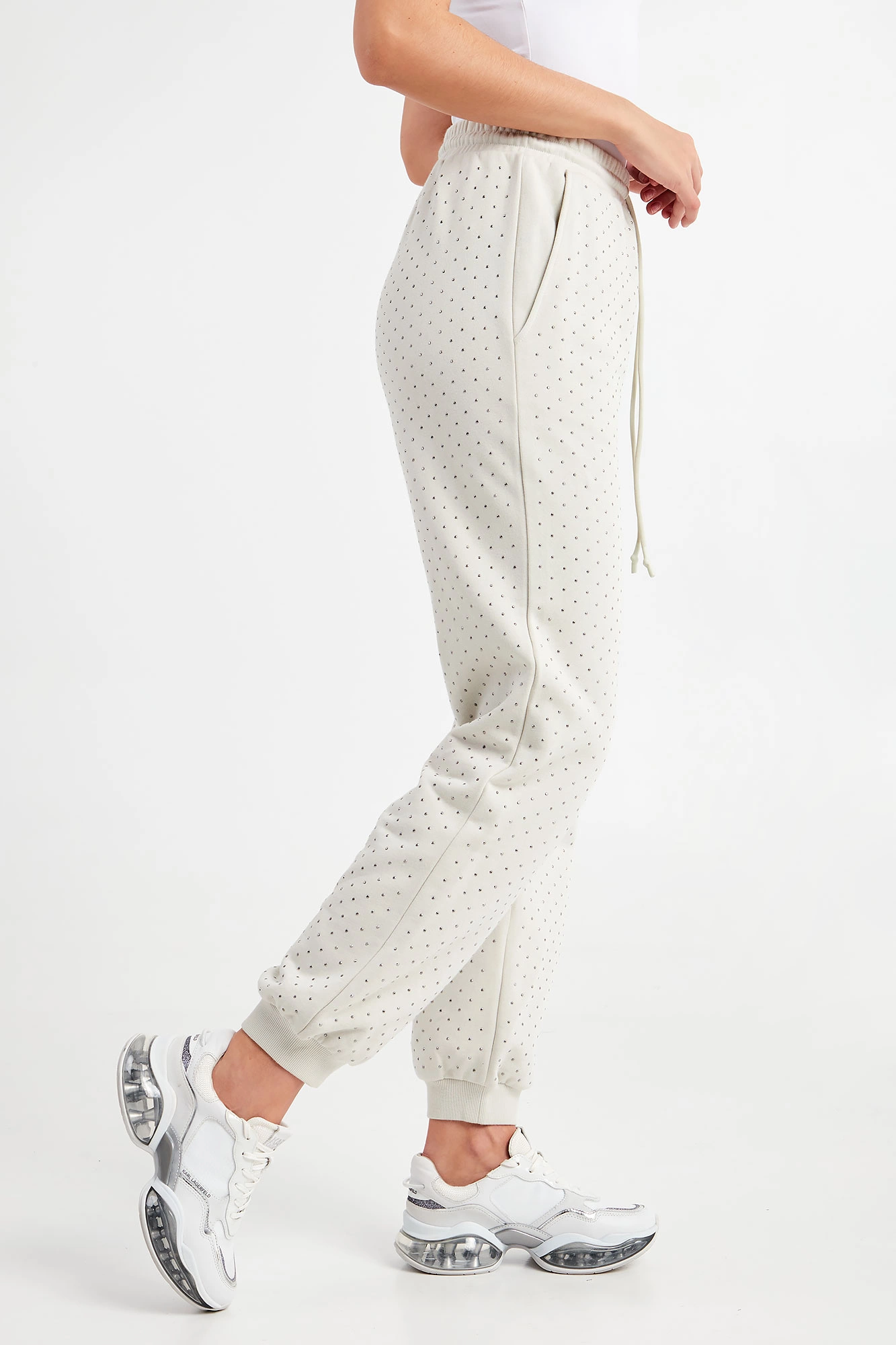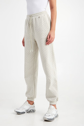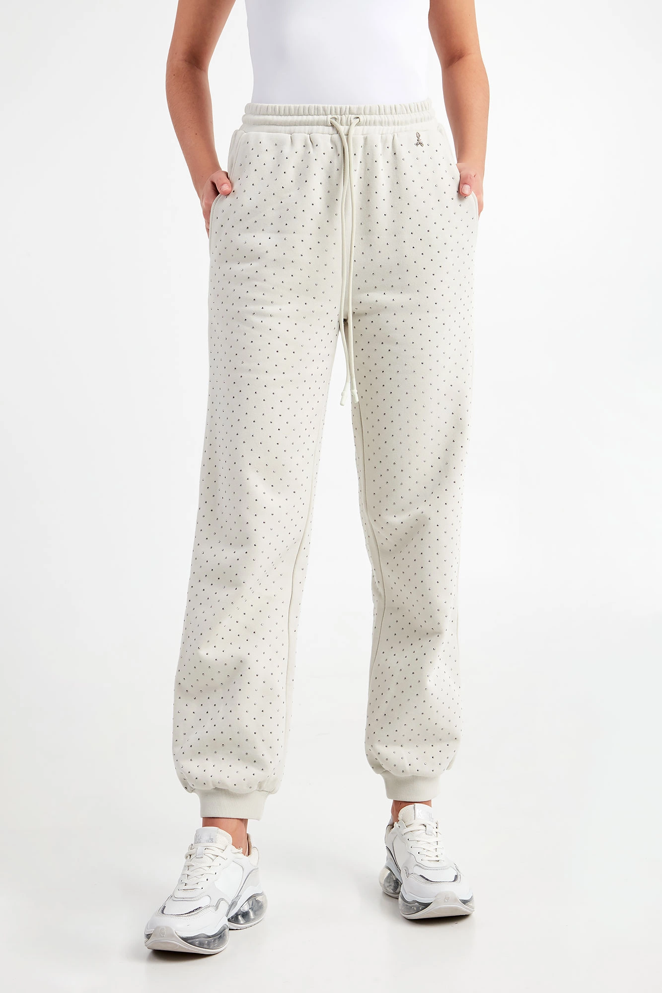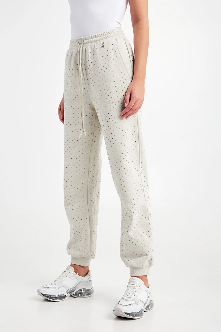 Spodnie dresowe marki Patrizia Pepe w jasnobeżowym kolorze. Fason typu jogger. W talii elastyczny ściągacz regulowany za pomocą troczków. Model z dwoma kieszeniami. Z przodu metalowa aplikacja z logo marki w srebrnym kolorze. Wykonane z bawełny o grubym splocie z domieszka wiskozy.