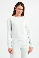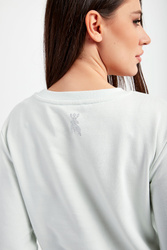 Bluza marki Patrizia Pepe w miętowym kolorze. Fason regular fit. Z przodu niewielki haft z nazwą marki. Dekolt typu o-neck, długie, proste rękawy i dół zakończone elastycznymi ściągaczami. Z tyłu, na linii karku owadzie logo wykonane z charakterystycznych kryształków. Wykonana z czystej bawełny, która pochodzi z certyfikowanych źródeł.
