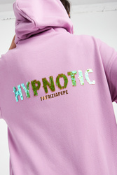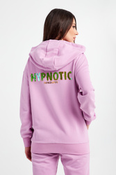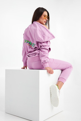 Bluza z kapturem marki Patrizia Pepe w fioletowym, liliowym kolorze. Fason regular fit. Zapinana za pomocą zamka błyskawicznego. Dwie boczne, wpuszczane kieszenie. Z tyłu zielone, połyskujące napisy z cekinami. Kaptur regulowany za pomocą troczków. Dół i rękawy zakończone ściągaczami. Wykonana z czystej bawełny, pochodzącej z certyfikowanych źródeł.