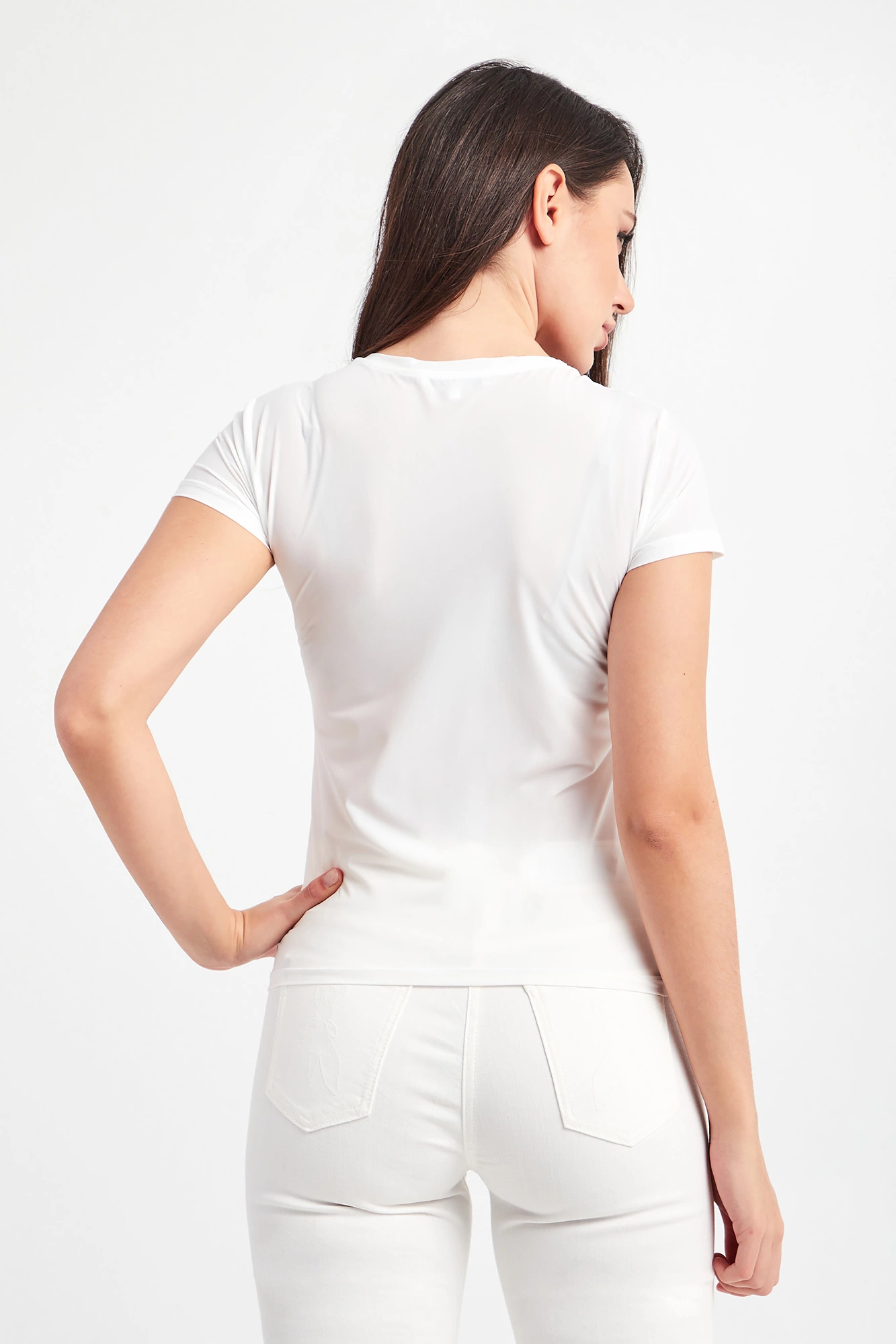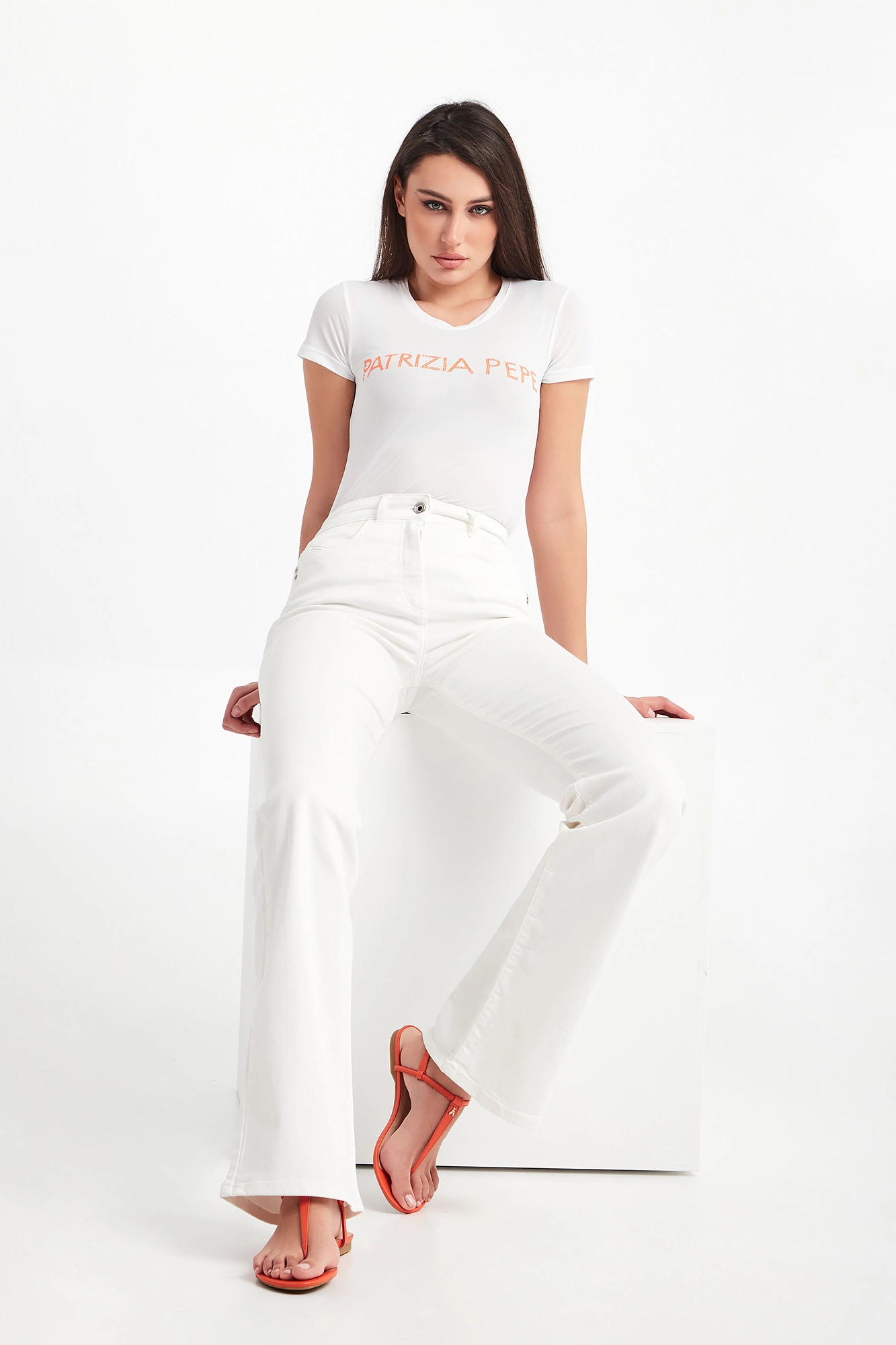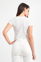 T-shirt marki Patrizia Pepe w białym kolorze. Dopasowany fason slim fit. Z przodu pomarańczowy napis w postaci nazwy marki. Wykonany z półprzezroczystej, mlecznej tkaniny. Dekolt typu o-neck zakończony ściągaczem. Krótkie rękawy oraz dół wykończone lamówką.