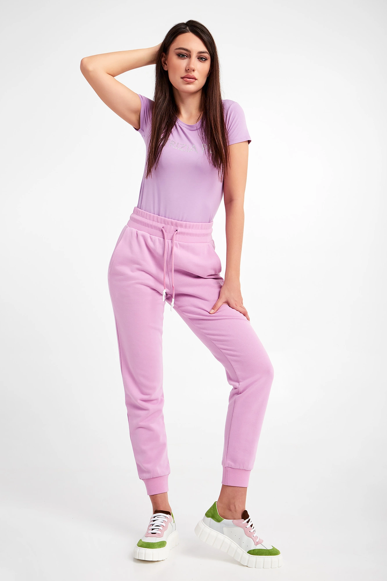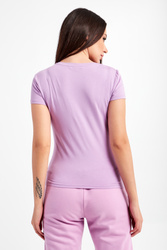 T-shirt marki Patrizia Pepe w fioletowym, liliowym kolorze. Dopasowany fason slim fit. Z przodu napis w postaci nazwy marki, wykonany z połyskujących kryształków. Dekolt typu o-neck zakończony ściągaczem. Krótkie rękawy oraz dół wykończone lamówką. Wykonany z elastycznej, wiskozowej tkaniny, która pochodzi z odpowiedzialnie zarządzanych lasów i łańcuchów dostaw.