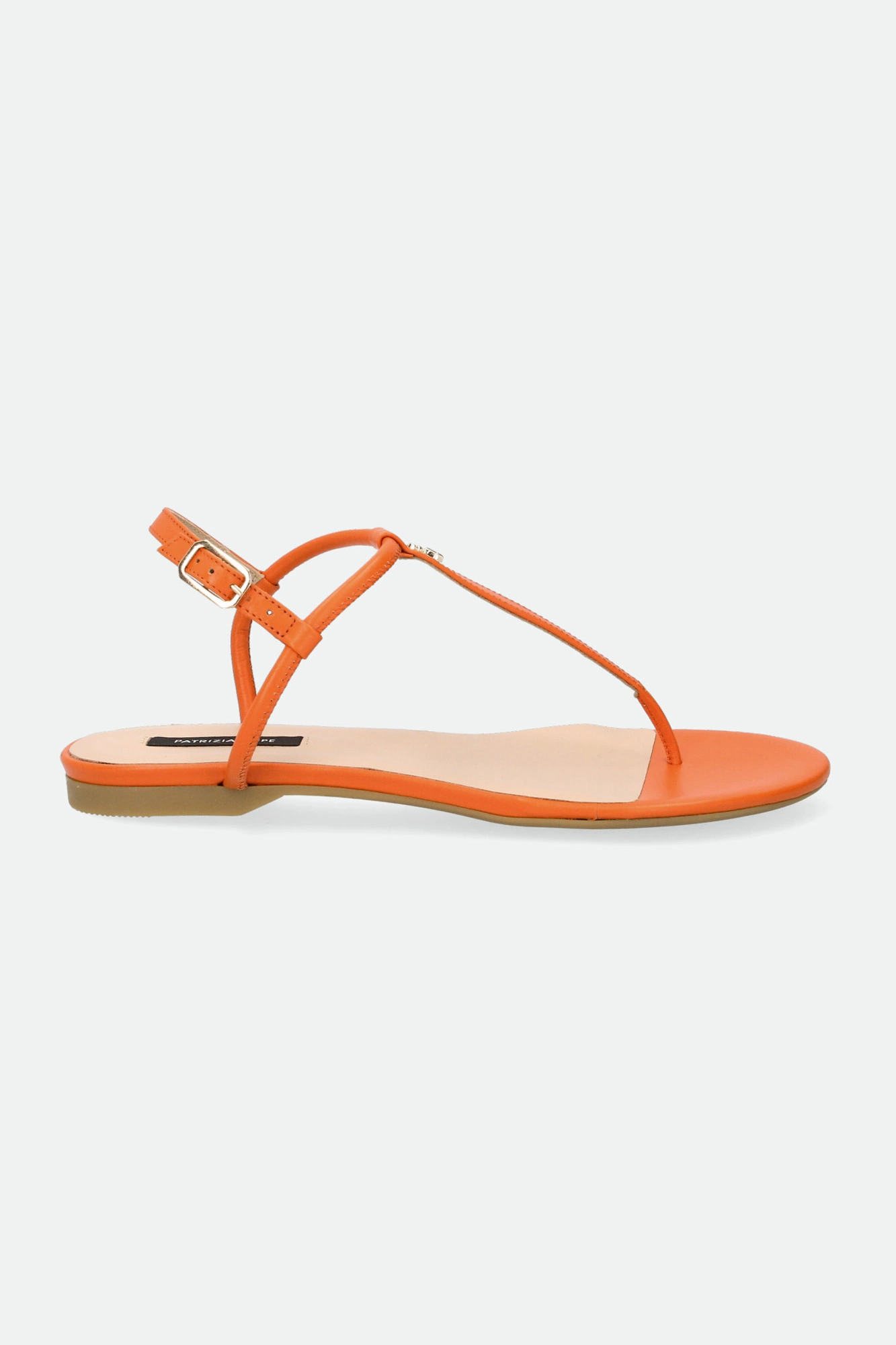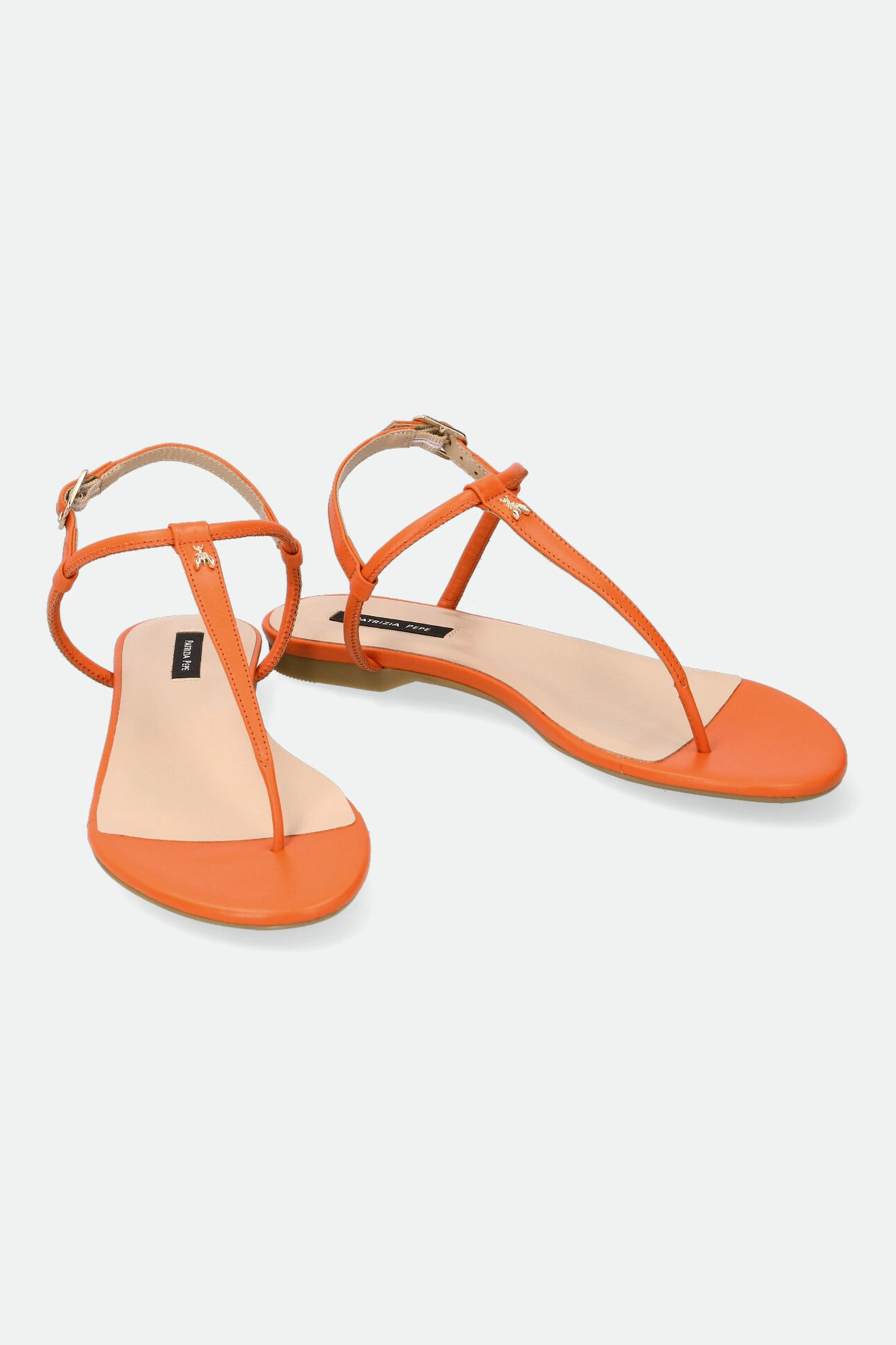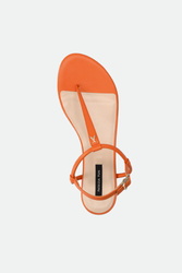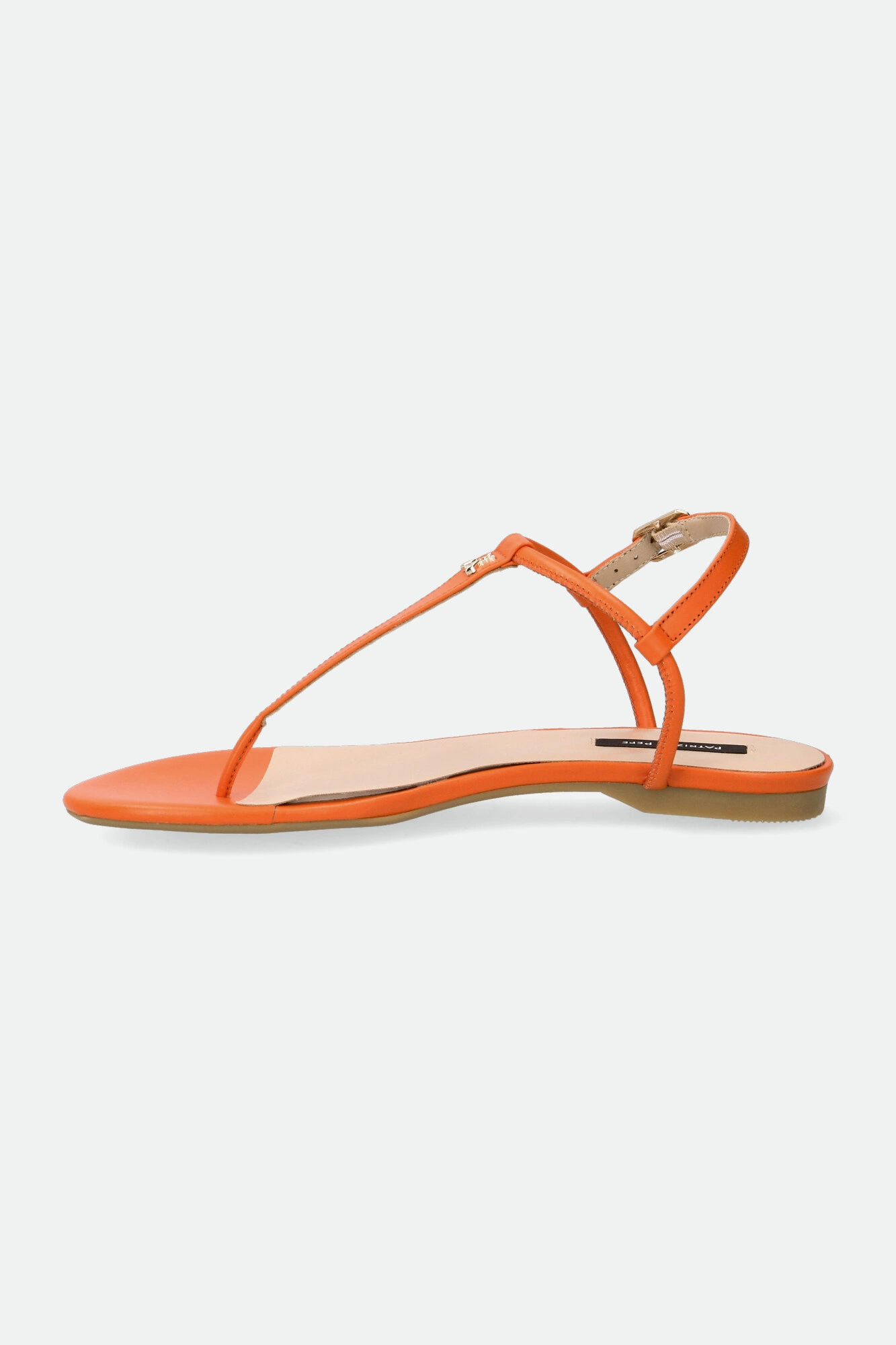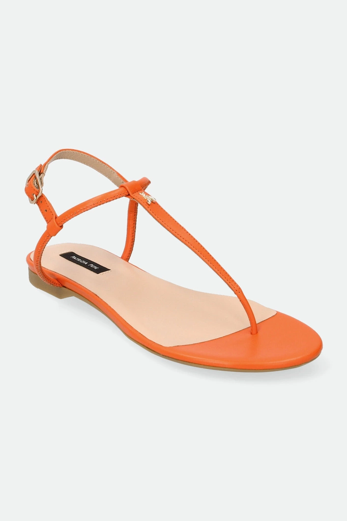 Sandały marki Patrizia Pepe w pomarańczowym kolorze. Zapinane za pomocą regulowanej sprzączki. Z przodu metalowa aplikacja w kształcie logo marki w złotym kolorze. Podeszwa sygnowana. Dobrze wyprofilowane i lekkie. Doskonałe do wielu letnich stylizacji.