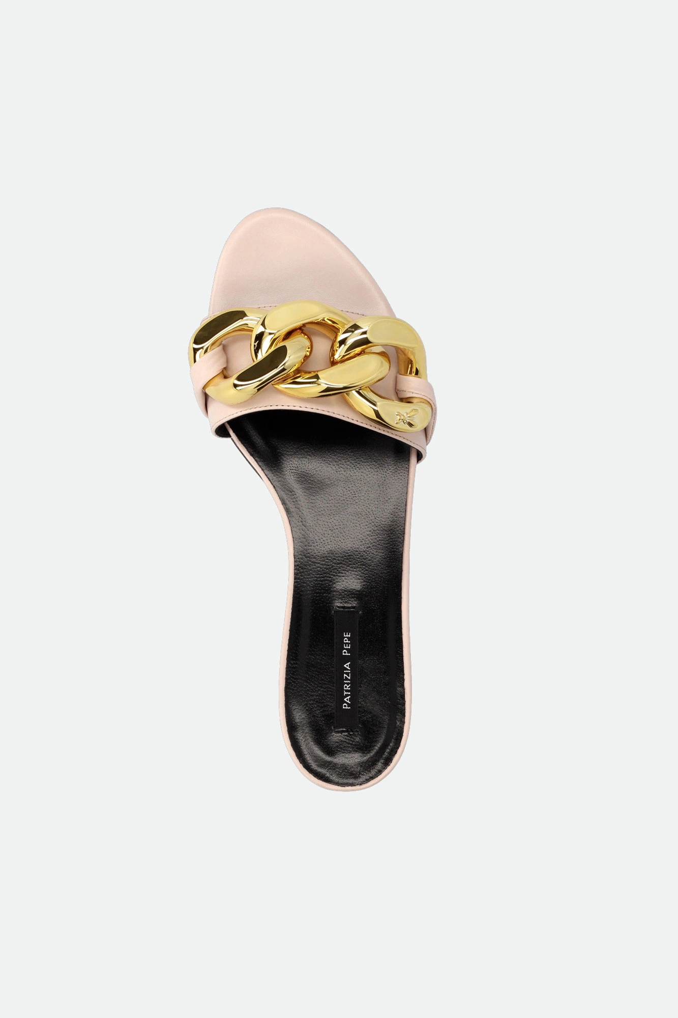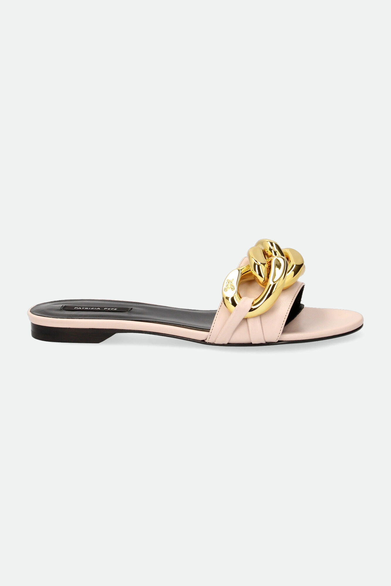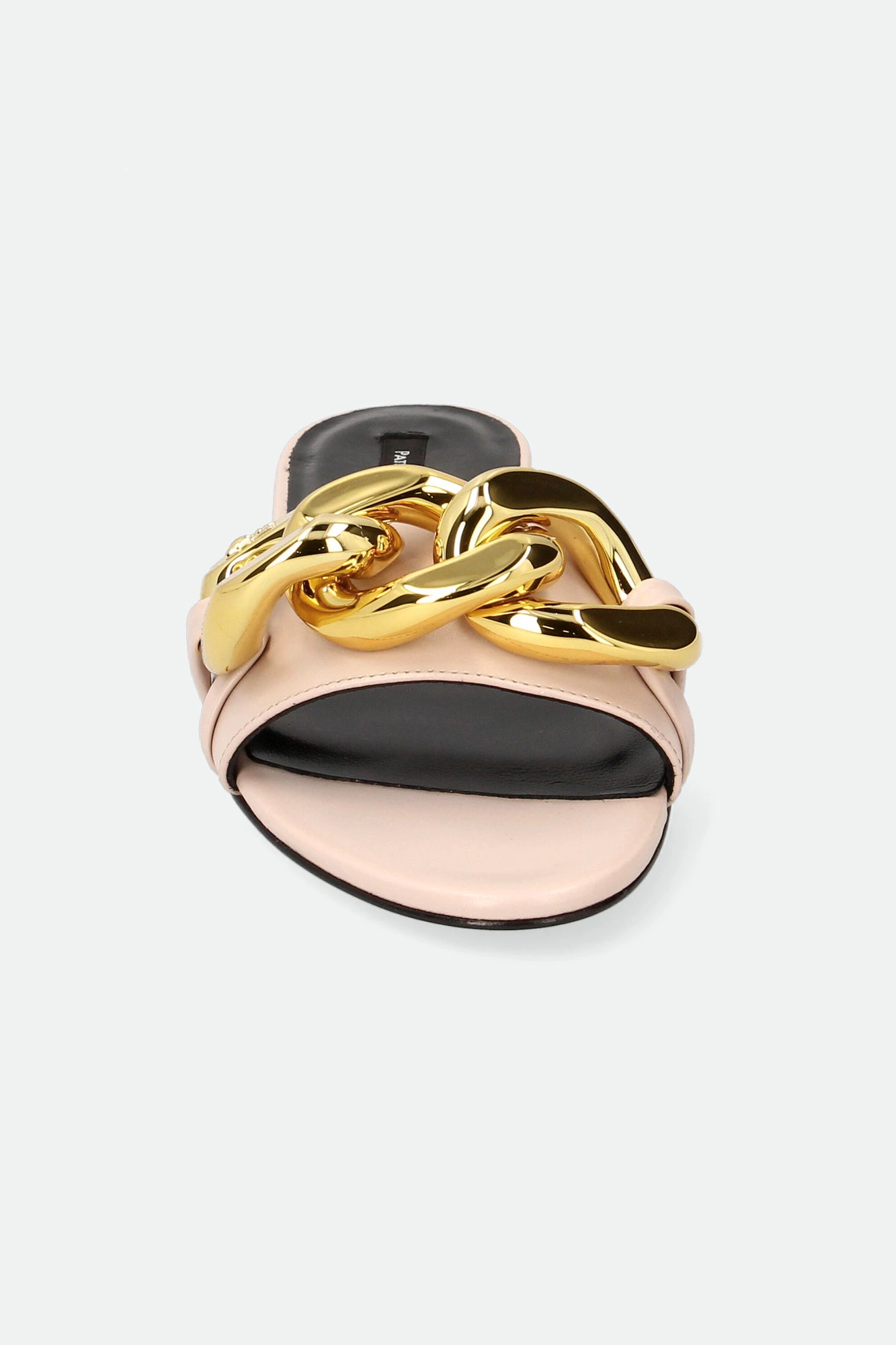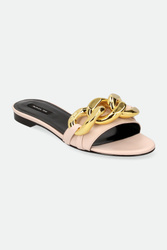 Klapki marki Patrizia Pepe w kolorze brudnego różu. Z przodu szeroki pasek z dużym sygnowanym łańcuchem w złotym kolorze. Wyściółka czarna. Na podeszwie tłoczone logo marki. Wykonane z naturalnej skóry.