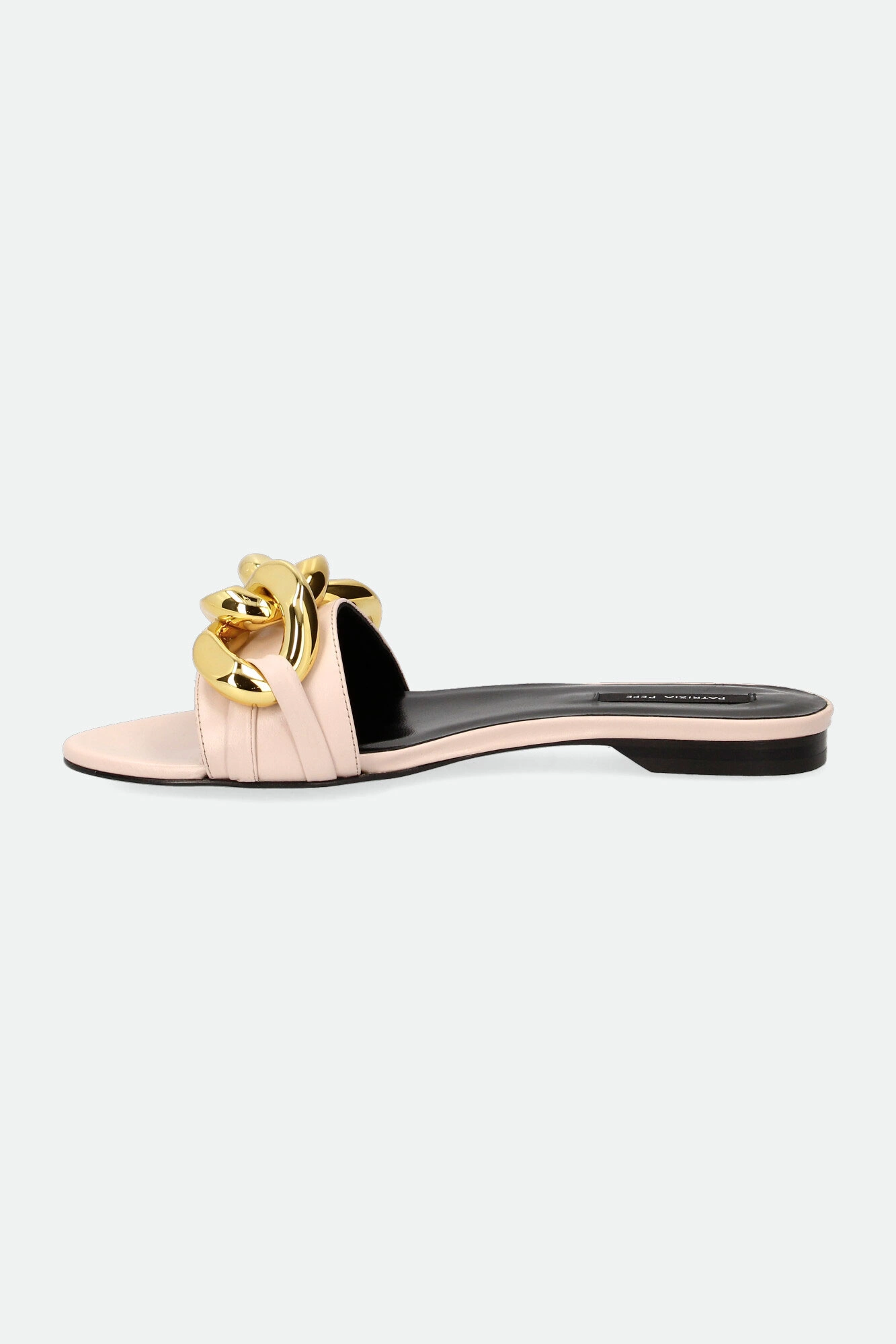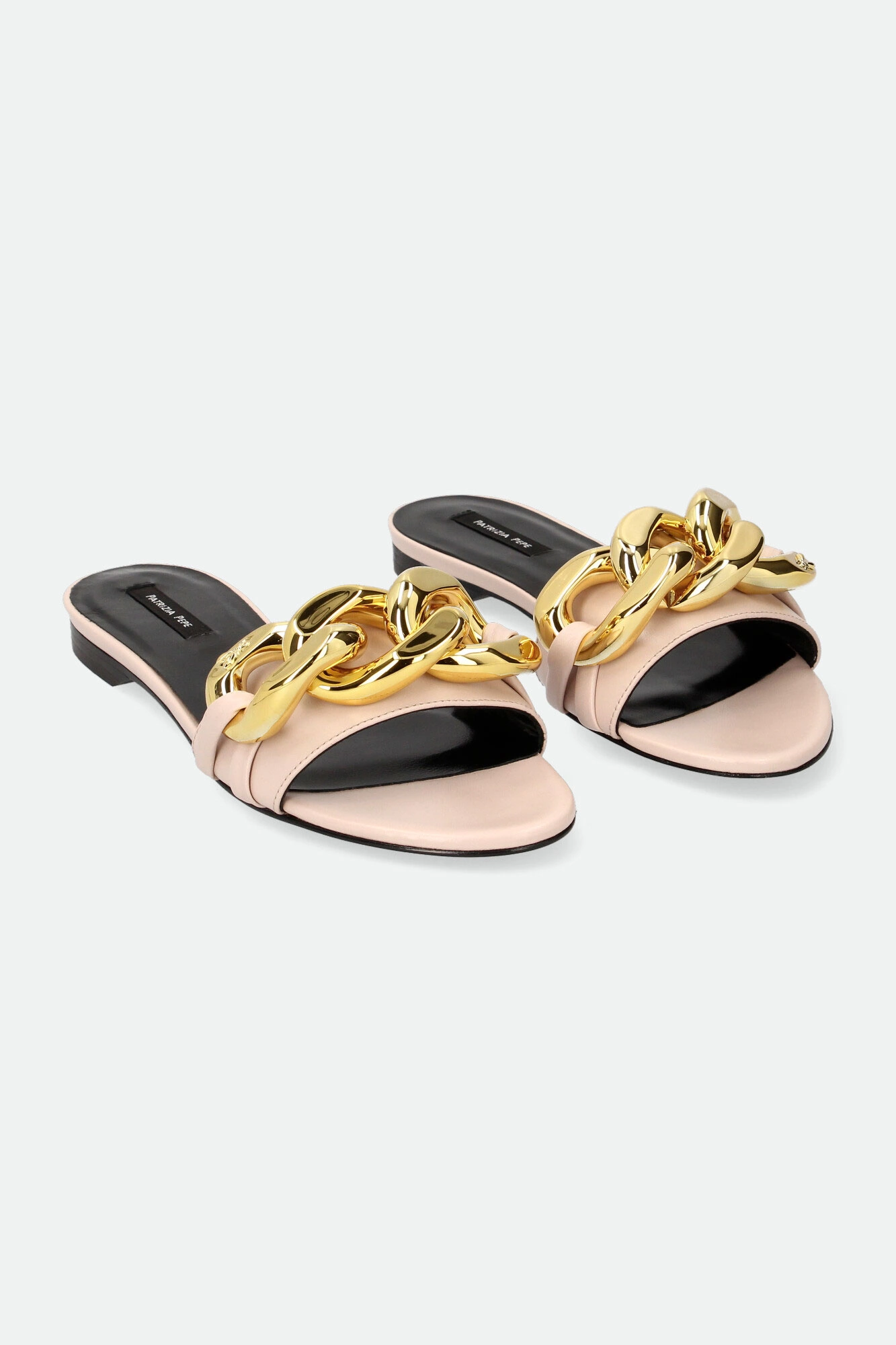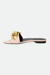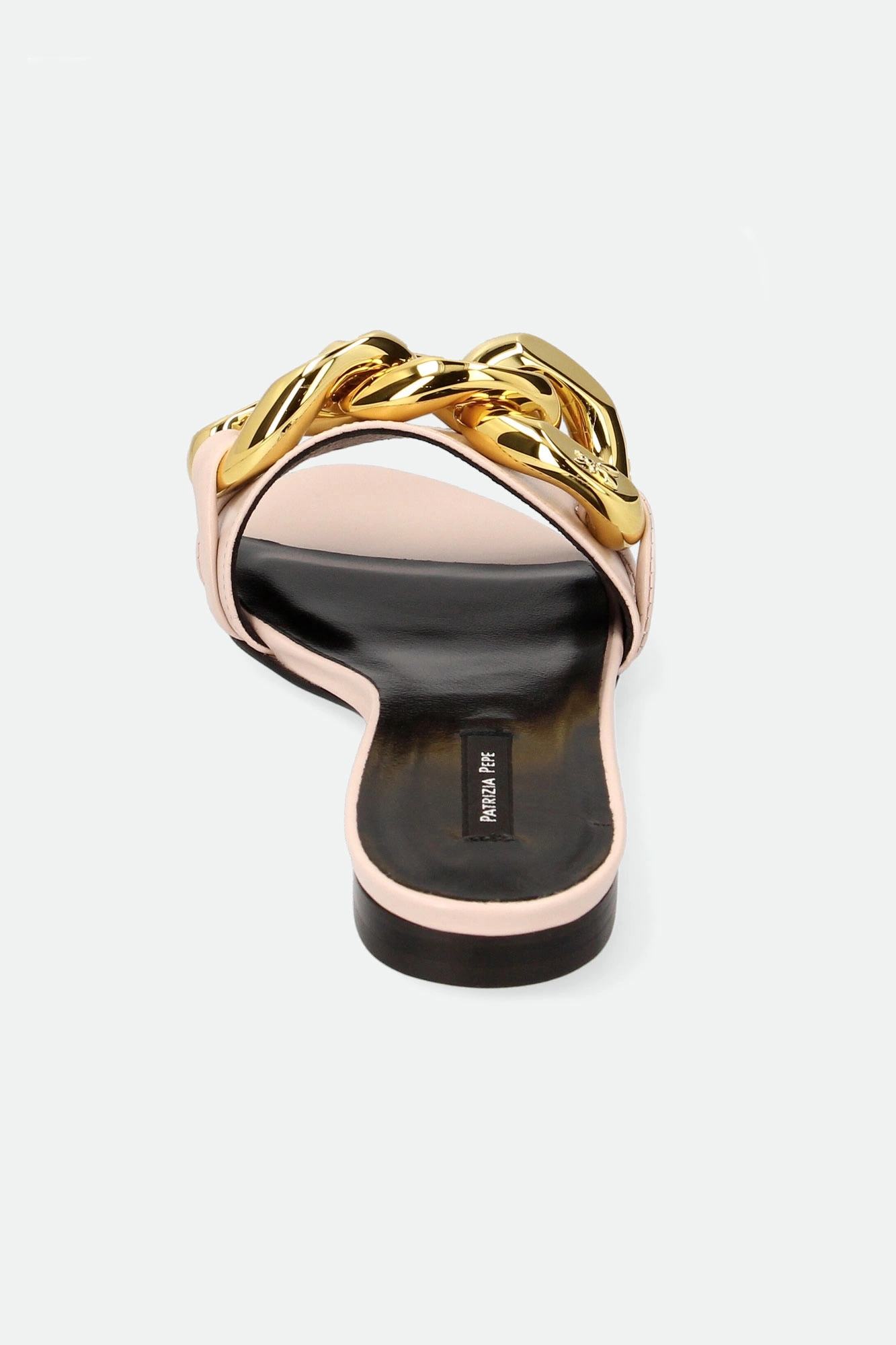 Klapki marki Patrizia Pepe w kolorze brudnego różu. Z przodu szeroki pasek z dużym sygnowanym łańcuchem w złotym kolorze. Wyściółka czarna. Na podeszwie tłoczone logo marki. Wykonane z naturalnej skóry.