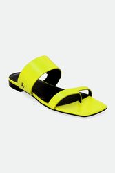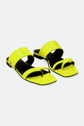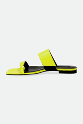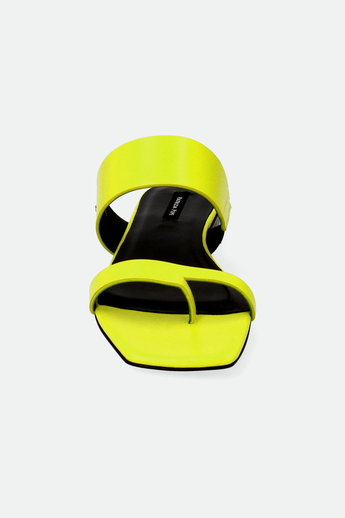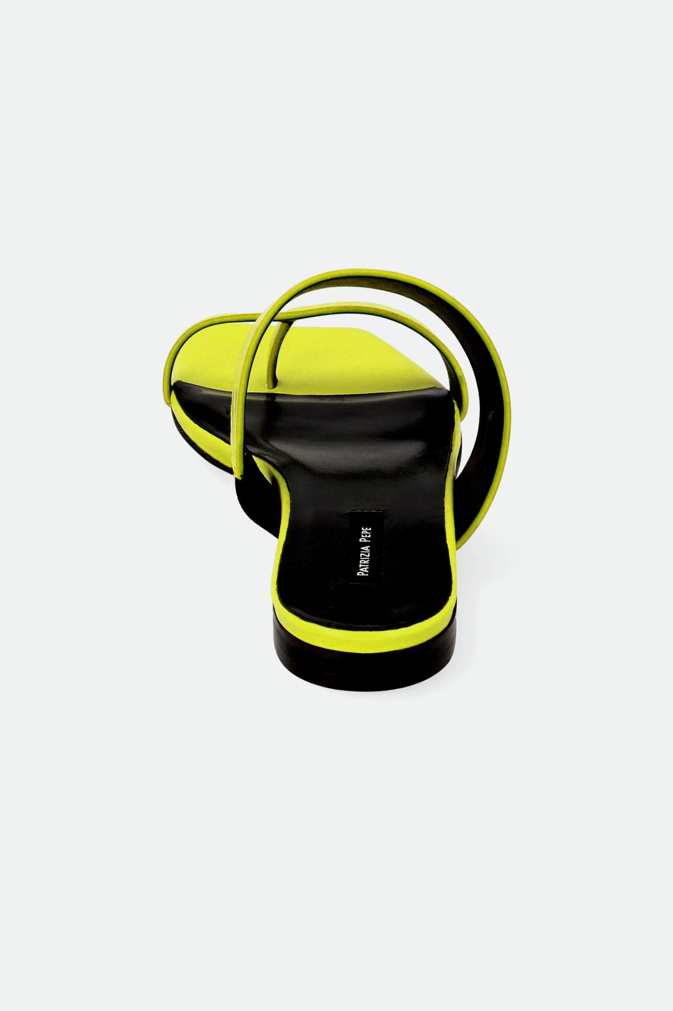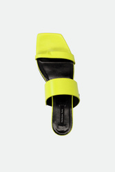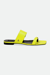 Japonki marki Patrizia Pepe w cytrynowym kolorze. Z przodu dwa paski. Pasek u góry z niewielką wstawką ściągacza ułatwiającego zakładanie. Po zewnętrznej stronie metalowa aplikacja z logo marki w srebrnym kolorze. Sygnowana wyściółka. Podeszwa sygnowana logo marki. Wykonane z naturalnej skóry.