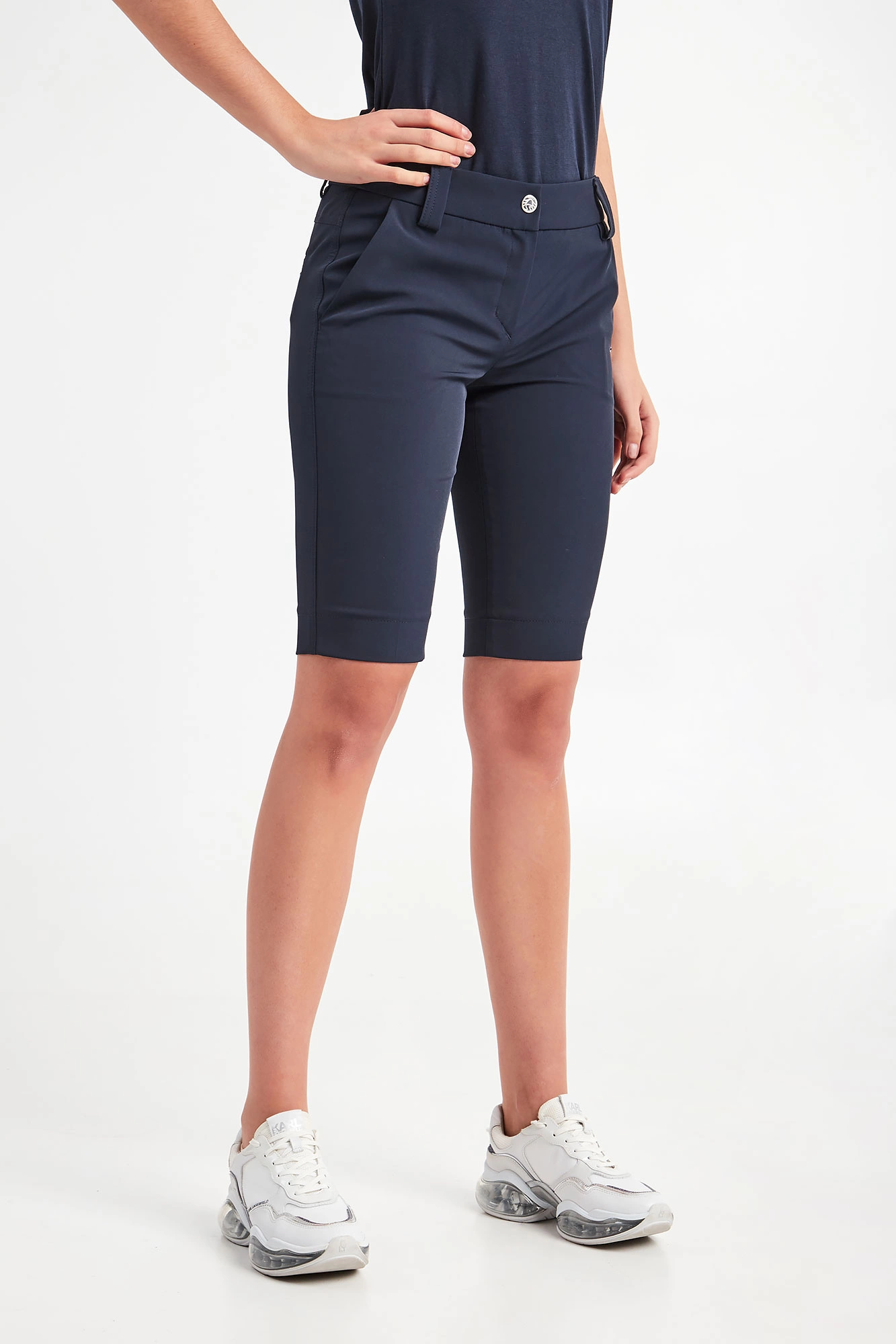 Spodenki marki Sportalm w granatowym kolorze. Fason typu slim fit. Zapinana za pomocą zamka oraz krytej haftki. Model z trzema kieszeniami. Z boku srebrna, logowana zawieszka. Nogawki wykończone szeroką lamówką. Z tyłu nogawek ozdobne przeszycie.