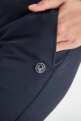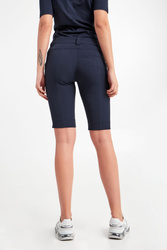 Spodenki marki Sportalm w granatowym kolorze. Fason typu slim fit. Zapinana za pomocą zamka oraz krytej haftki. Model z trzema kieszeniami. Z boku srebrna, logowana zawieszka. Nogawki wykończone szeroką lamówką. Z tyłu nogawek ozdobne przeszycie.