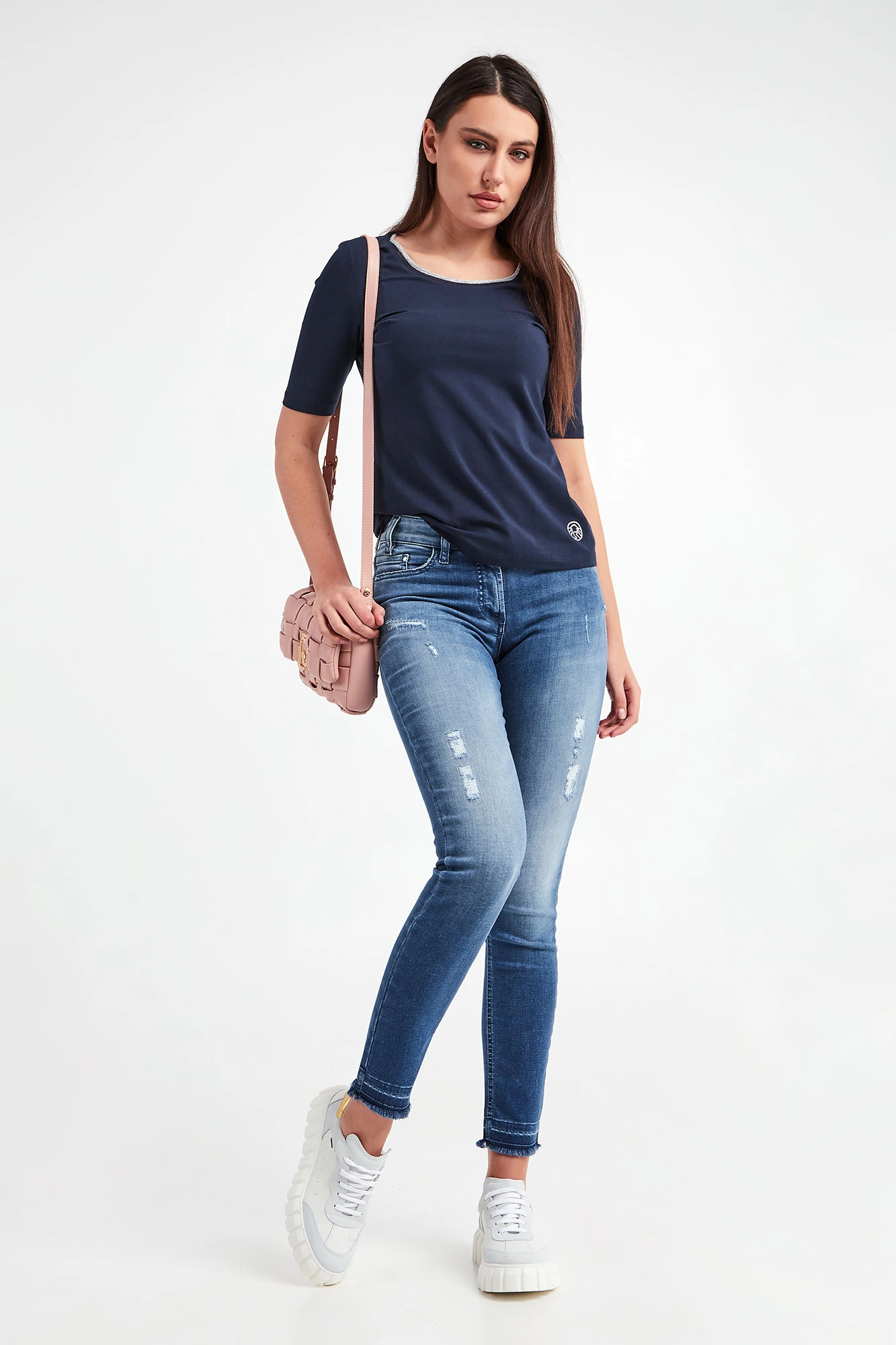 T-shirt marki Sportalm w granatowym kolorze. Fason slim fit. Dekolt typu o-neck wykończony srebrnym, połyskującym ściągaczem. U dołu logo wykonane z kryształków. Krótkie rękawy oraz dół wykończony lamówką. Wykonany z bawełnianej tkaniny z domieszką elastycznych włókien.