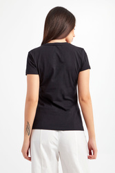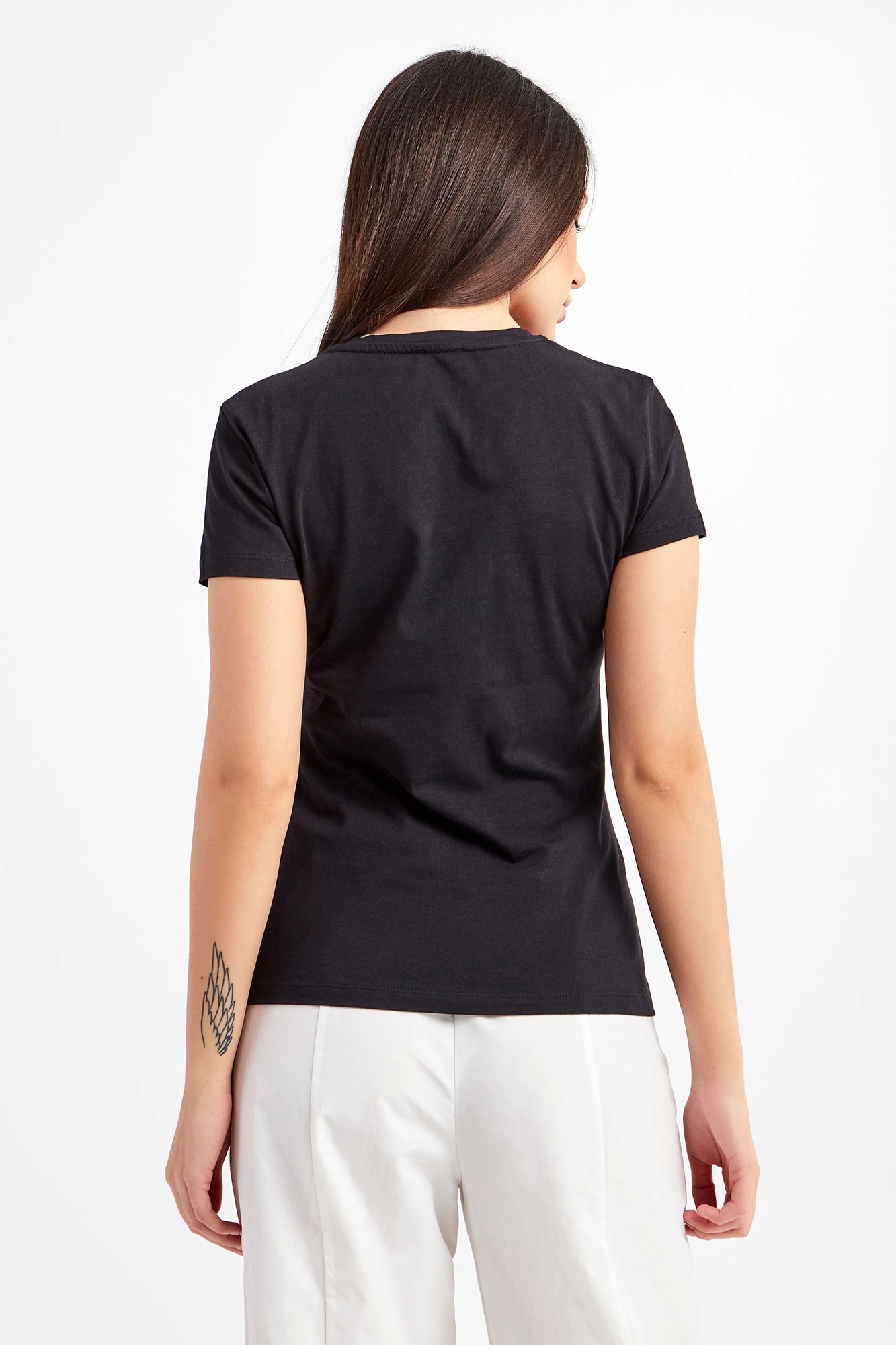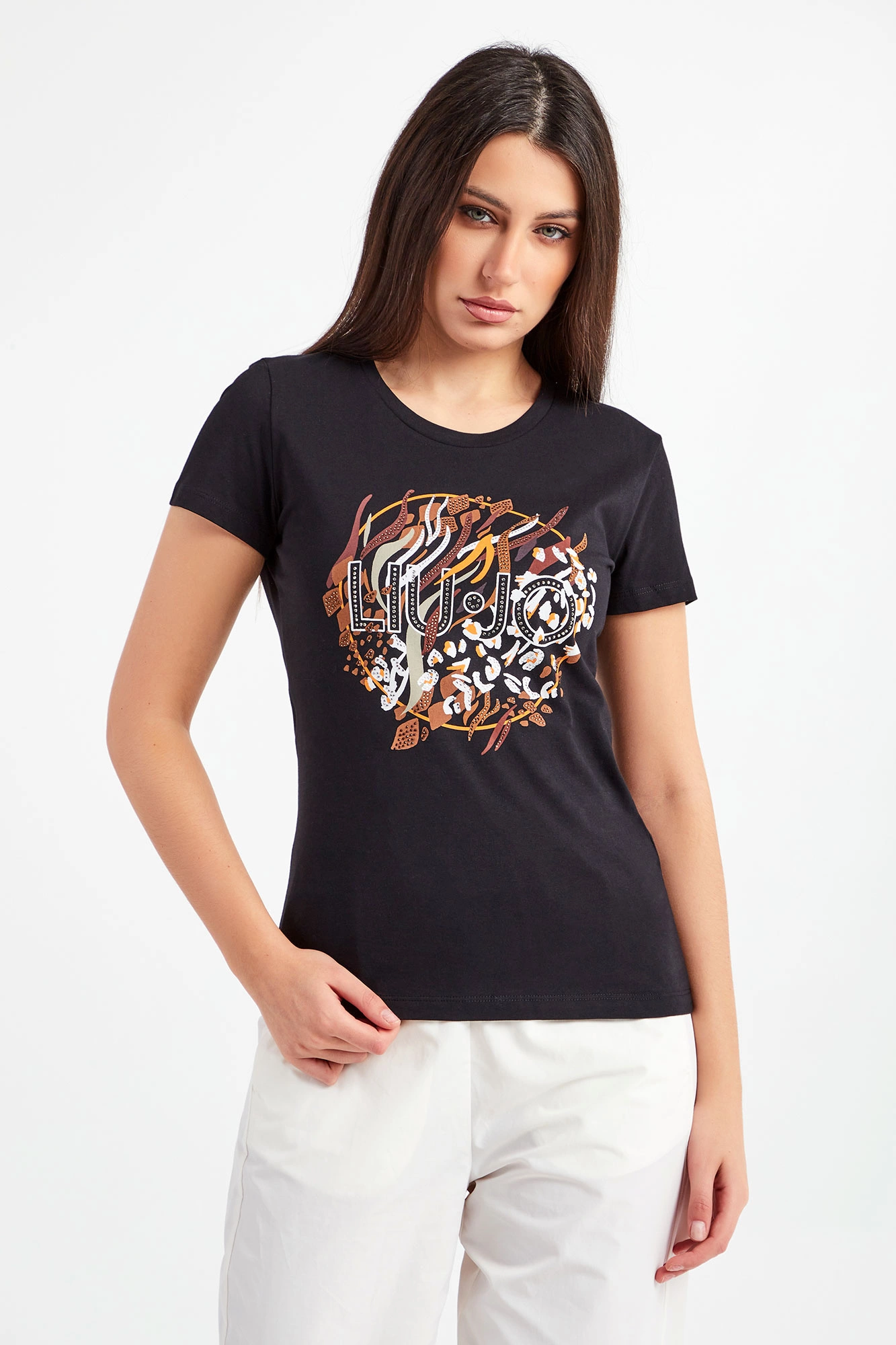 T-shirt marki Liu Jo w czarnym kolorze. Fason slim fit. Z przodu kolorowy nadruk z logo, ozdobiony kryształkami. Dekolt typu o-neck zakończony ściągaczem. Krótkie rękawy i dół wykończone lamówką. Wykonany z przyjaznej środowisku, bawełnianej tkaniny.