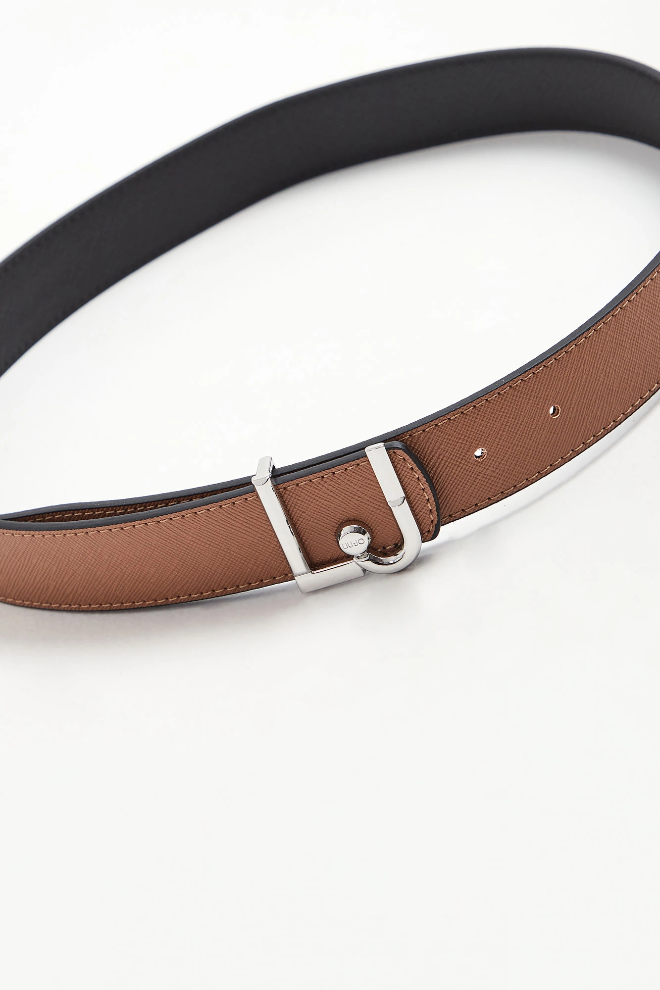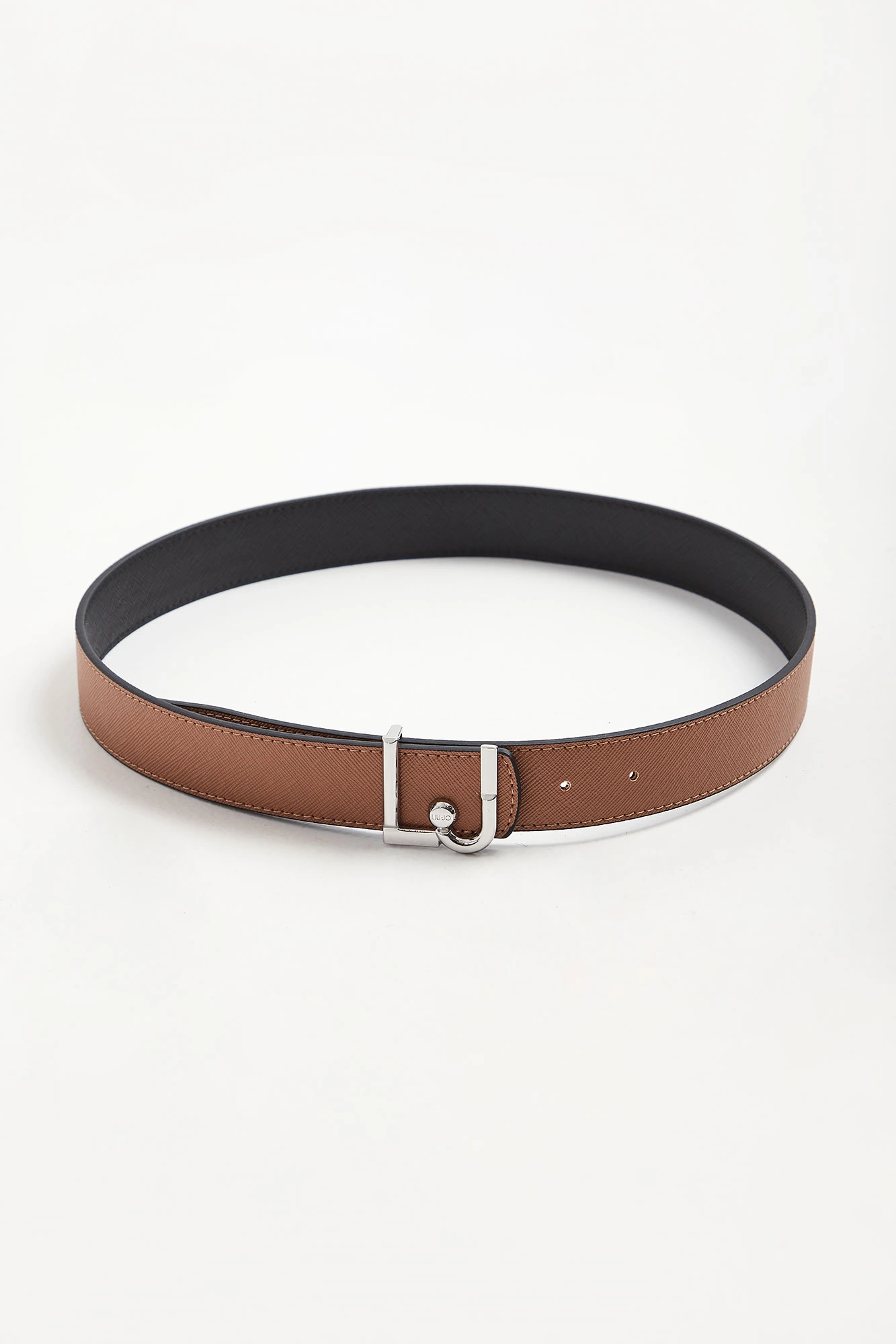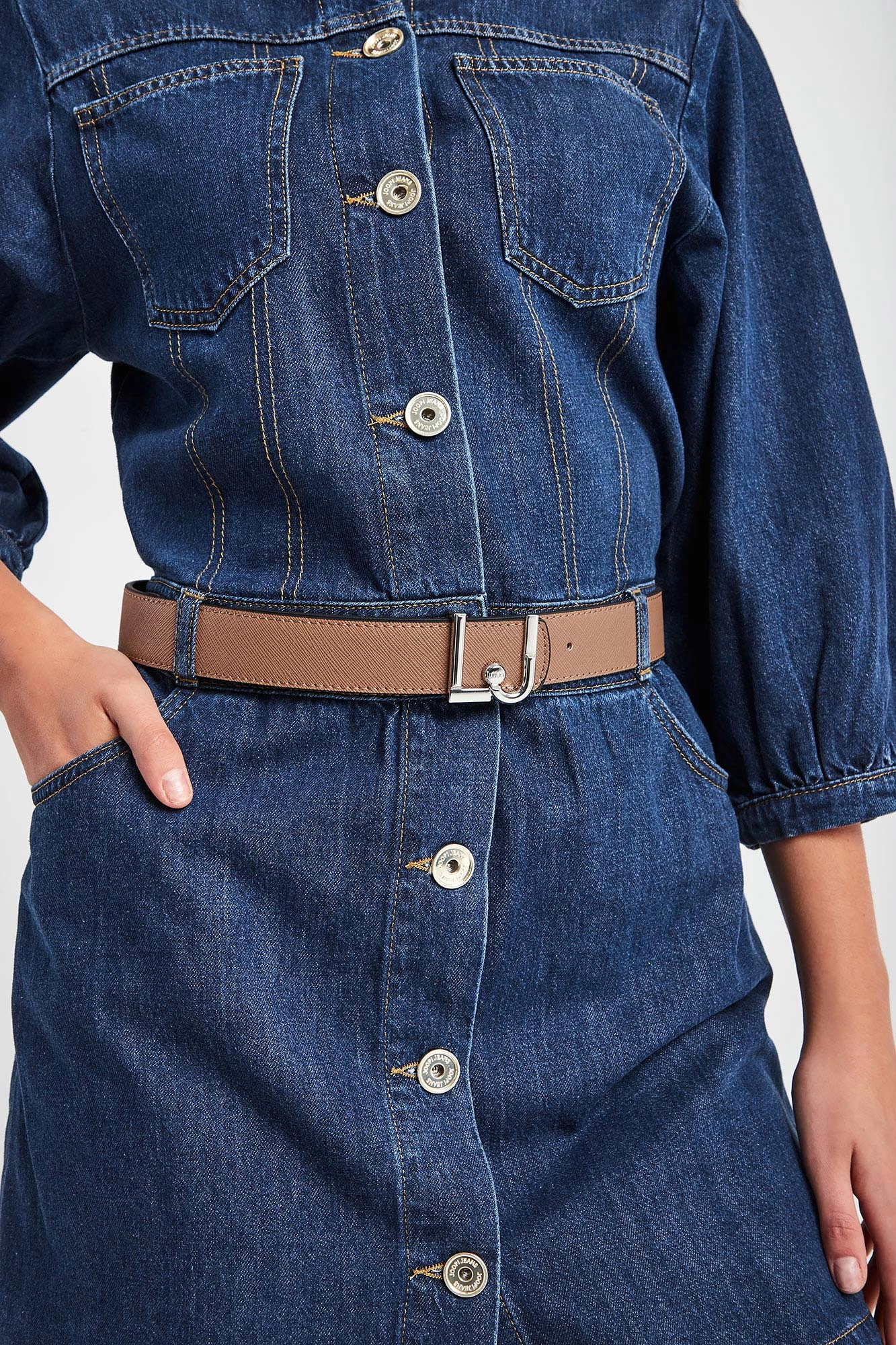 Pasek marki Liu Jo w brązowym kolorze. Zapinany za pomocą srebrnej klamry z bolcem, w kształcie logo marki. Wewnątrz czarny. Wykonany ze skóry ekologicznej.