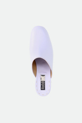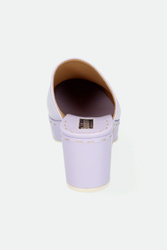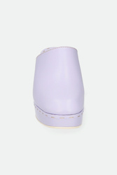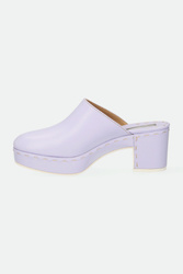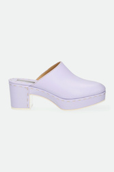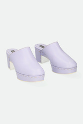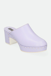 Chodaki marki Baldinini w liliowym kolorze. Buty z trzycentymetrową platformą oraz masywnym obcasem klockowym. Na podeszwie i obcasie widoczne dekoracyjne przeszycie. Zaokrąglony nosek. Widoczna, sygnowana wwyściółka. Wykonane ze skóry cielęcej. Biała, sygnowana podeszwa. Wykonane z naturalnej skóry.