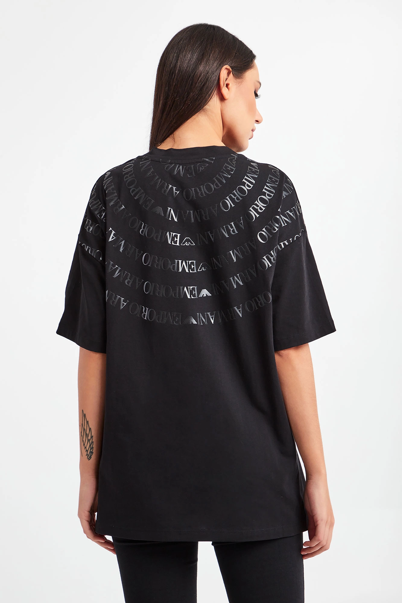 T-shirt marki Emporio Armani w czarnym kolorze. Fason relaxed fit. Na całości napisy z logo. Dekolt typu o-neck zakończony ściągaczem. Obniżona linia ramion. Krótkie rękawy i dół zakończone lamówką. Wykonany ze stuprocentowej bawełny.